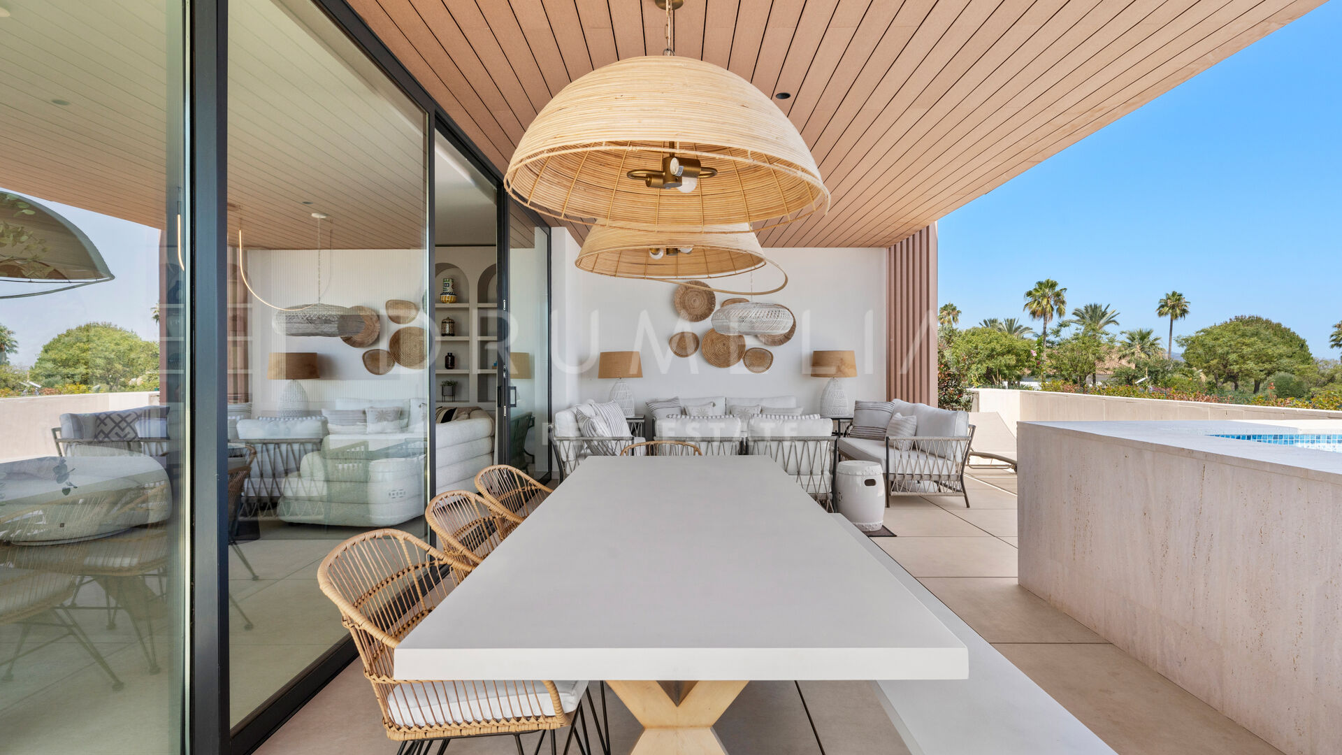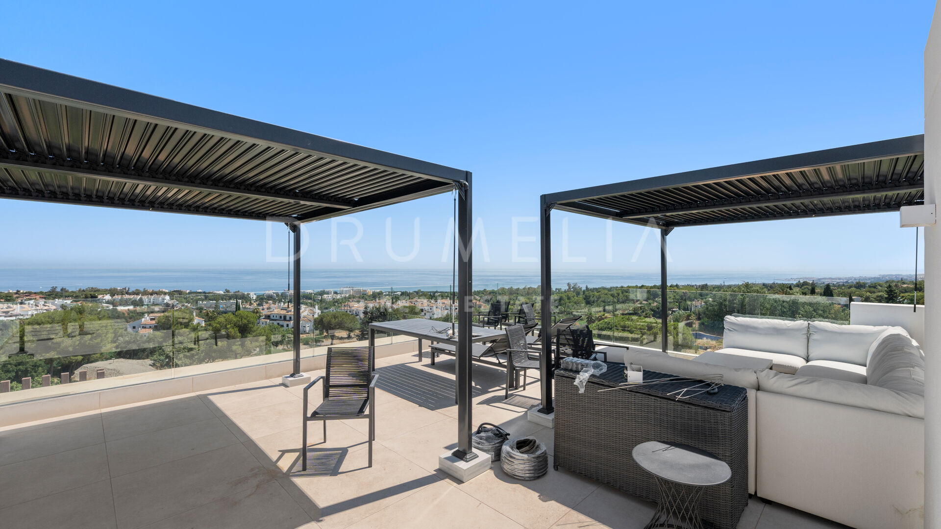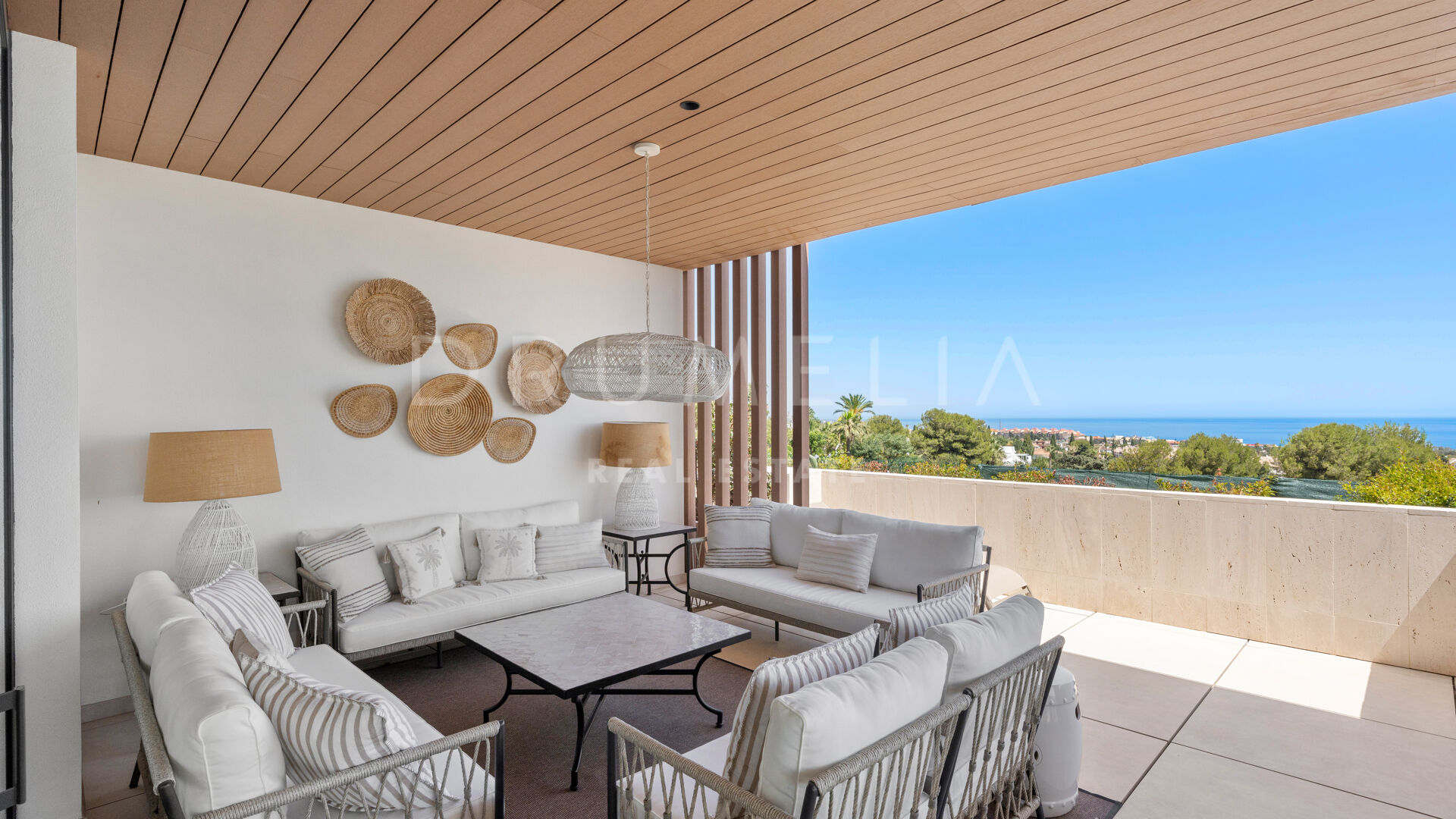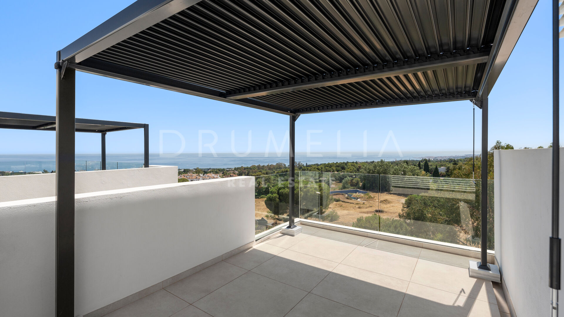 Wat deze villa echt bijzonder maakt, is het ontzagwekkende dakterras met panoramisch uitzicht op zee. Het heeft een eigen fitnessruimte, een privézwembad en een terras met overdekte zithoek.