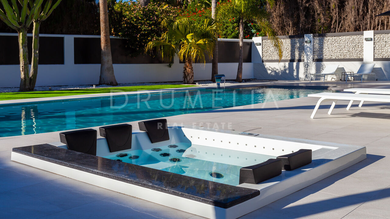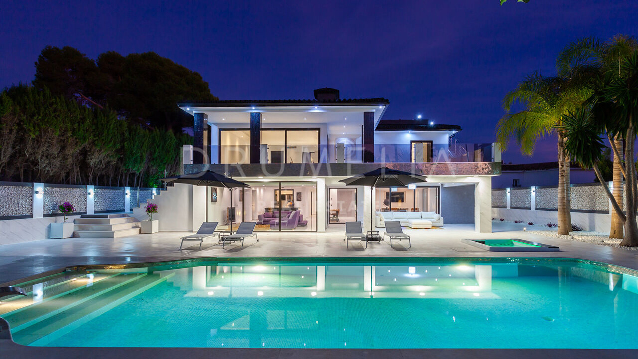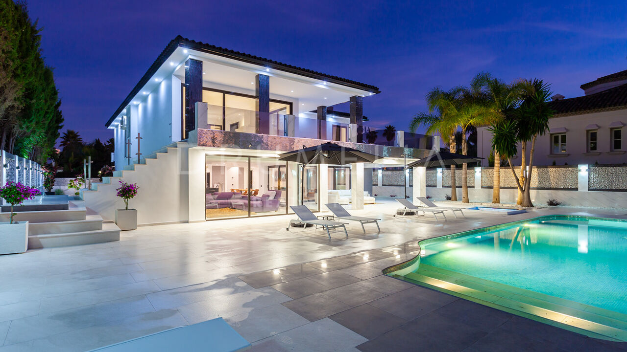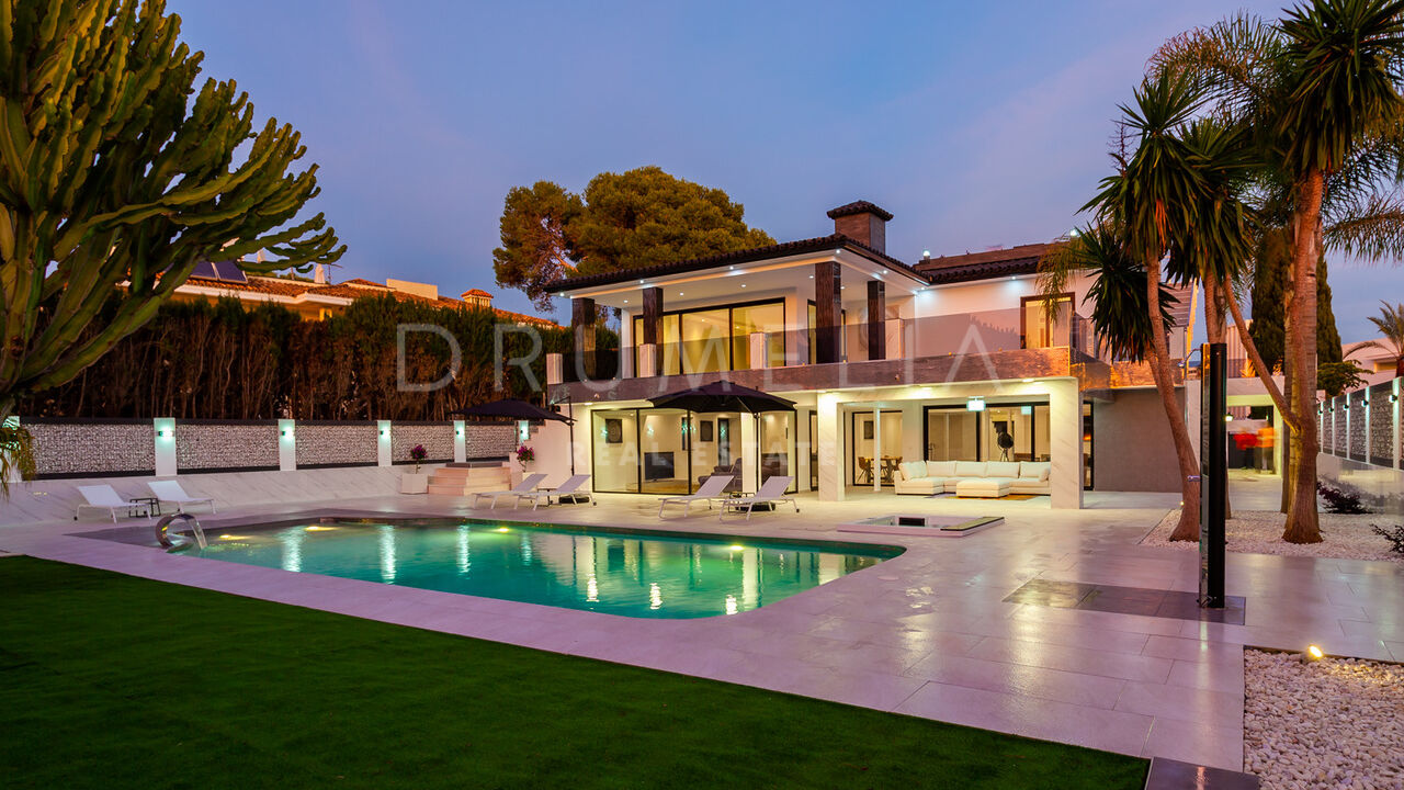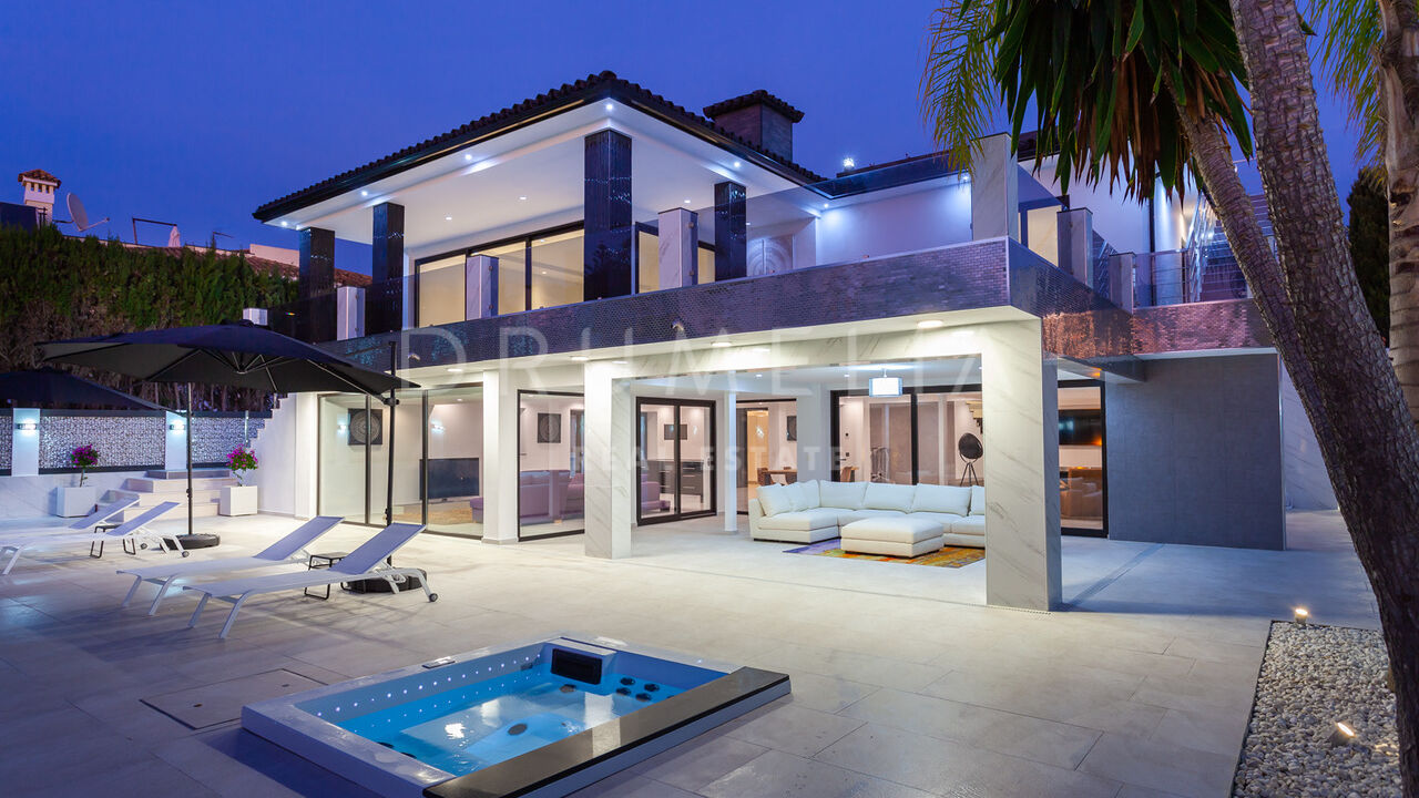 Gelegen op een perceel van 1.122 m², de indrukwekkende zuid / west gerichte strand villa van 476 m² is gebouwd op 2 niveaus plus dak. Harmonisch combineren van 2 stijlen, de klassieke mediterrane elementen en hedendaagse / moderne functies, de spectaculaire woning bestaat uit, op de entree niveau: een imposante hal; een zwart-wit strakke keuken met een centraal eiland en top-kwaliteit Miele apparatuur; een elegante woonkamer met lounges, een eethoek en toegang tot het overdekte chill-out terras dat leidt naar de tuin en een zwembad met een waterpartij en een state-of-the-art jacuzzi. Deze verdieping heeft ook een TV zithoek, een uitnodigende ruimte waar uw familie tijd samen kan doorbrengen; een slaapkamer suite; en een gastentoilet. Boven vindt u de slaapkamers: 3 gastensuites en de master suite met open haard en inloopkast, met toegang tot een terras met uitzicht op de tuin en het zwembad.