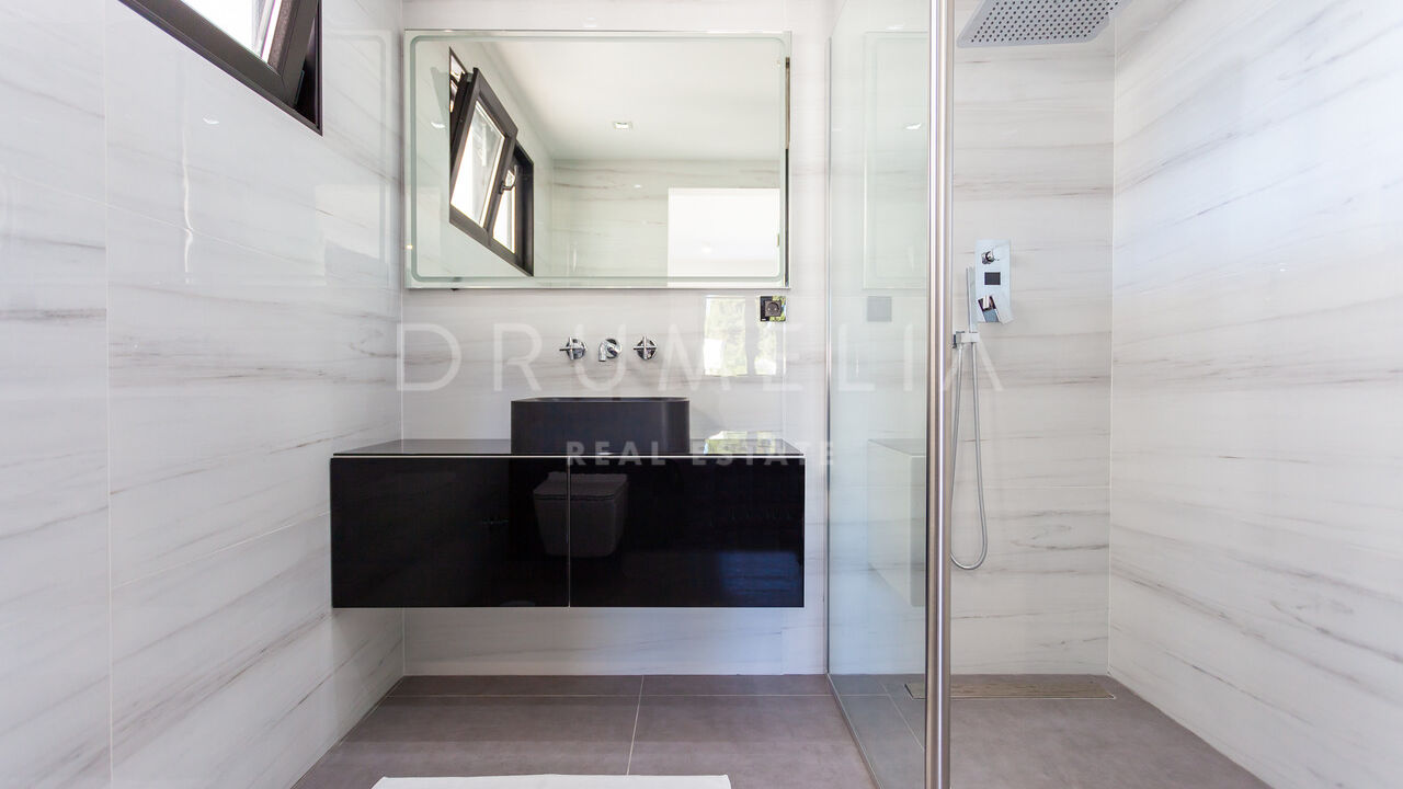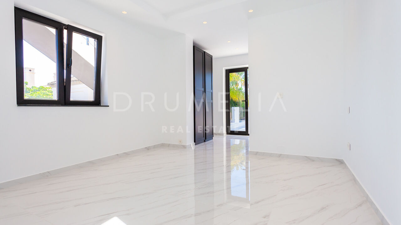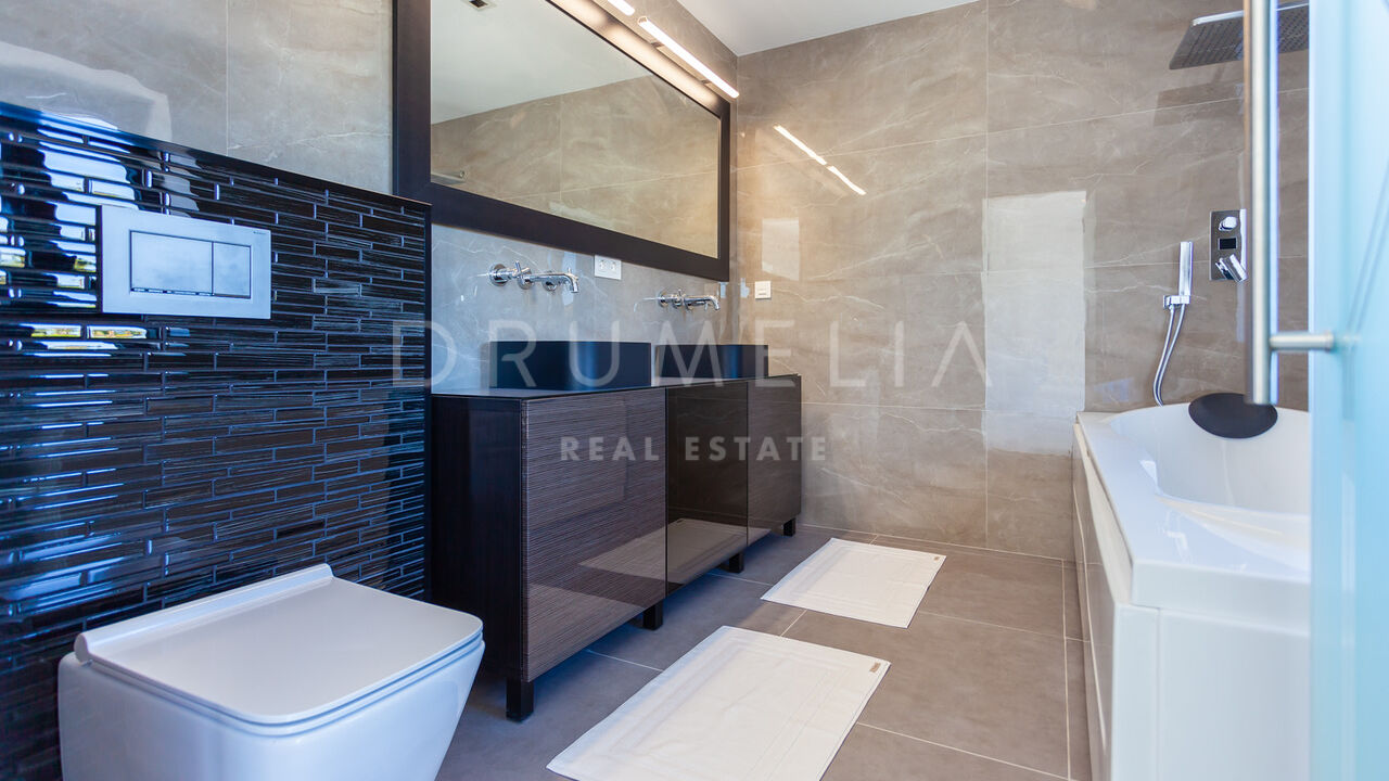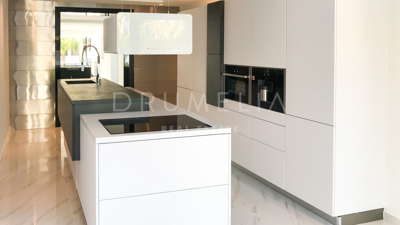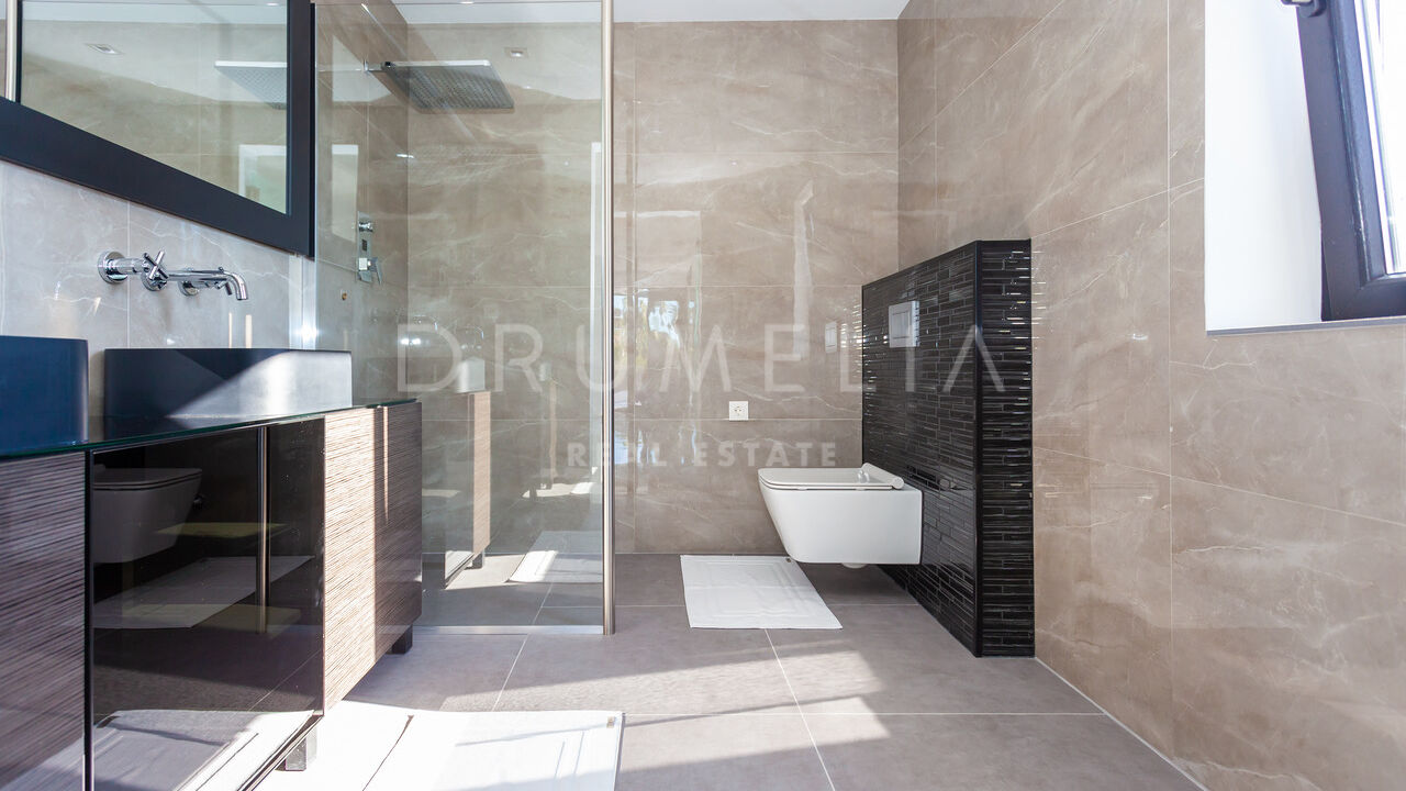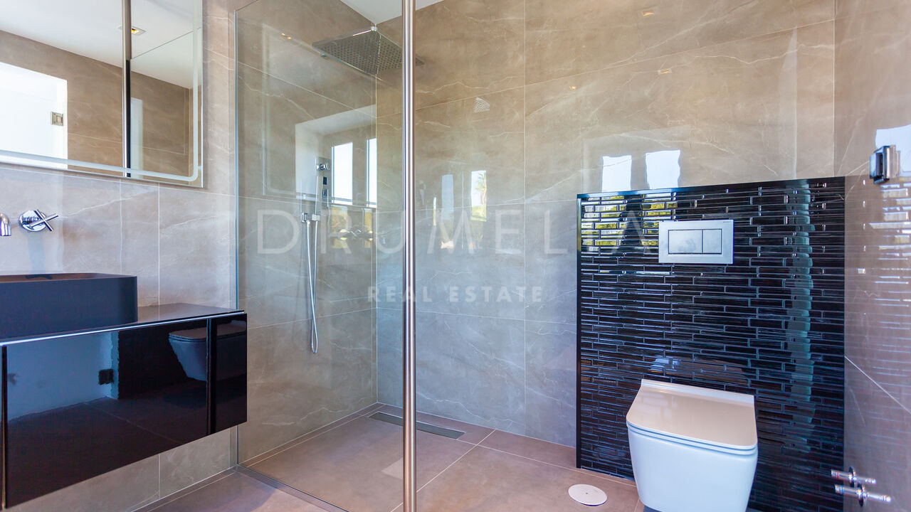 Gelegen op een perceel van 1.122 m², de indrukwekkende zuid / west gerichte strand villa van 476 m² is gebouwd op 2 niveaus plus dak. Harmonisch combineren van 2 stijlen, de klassieke mediterrane elementen en hedendaagse / moderne functies, de spectaculaire woning bestaat uit, op de entree niveau: een imposante hal; een zwart-wit strakke keuken met een centraal eiland en top-kwaliteit Miele apparatuur; een elegante woonkamer met lounges, een eethoek en toegang tot het overdekte chill-out terras dat leidt naar de tuin en een zwembad met een waterpartij en een state-of-the-art jacuzzi. Deze verdieping heeft ook een TV zithoek, een uitnodigende ruimte waar uw familie tijd samen kan doorbrengen; een slaapkamer suite; en een gastentoilet. Boven vindt u de slaapkamers: 3 gastensuites en de master suite met open haard en inloopkast, met toegang tot een terras met uitzicht op de tuin en het zwembad.