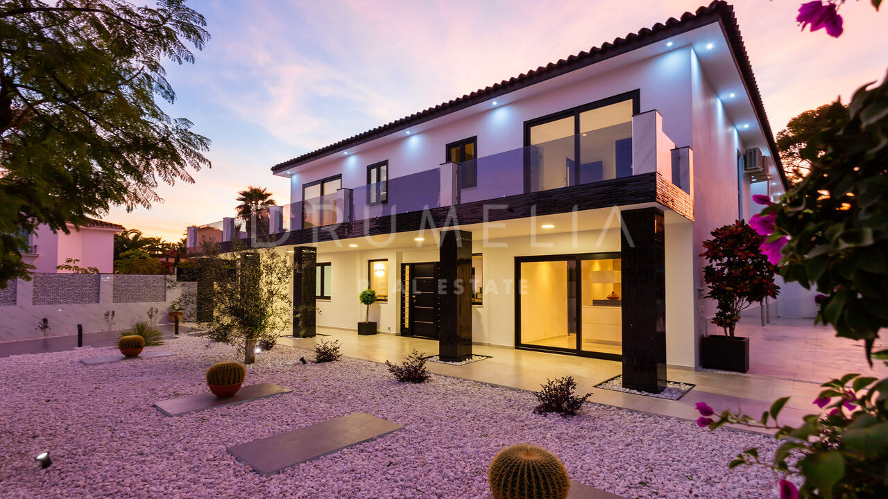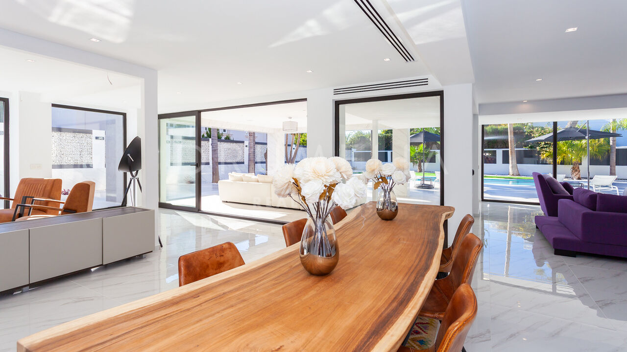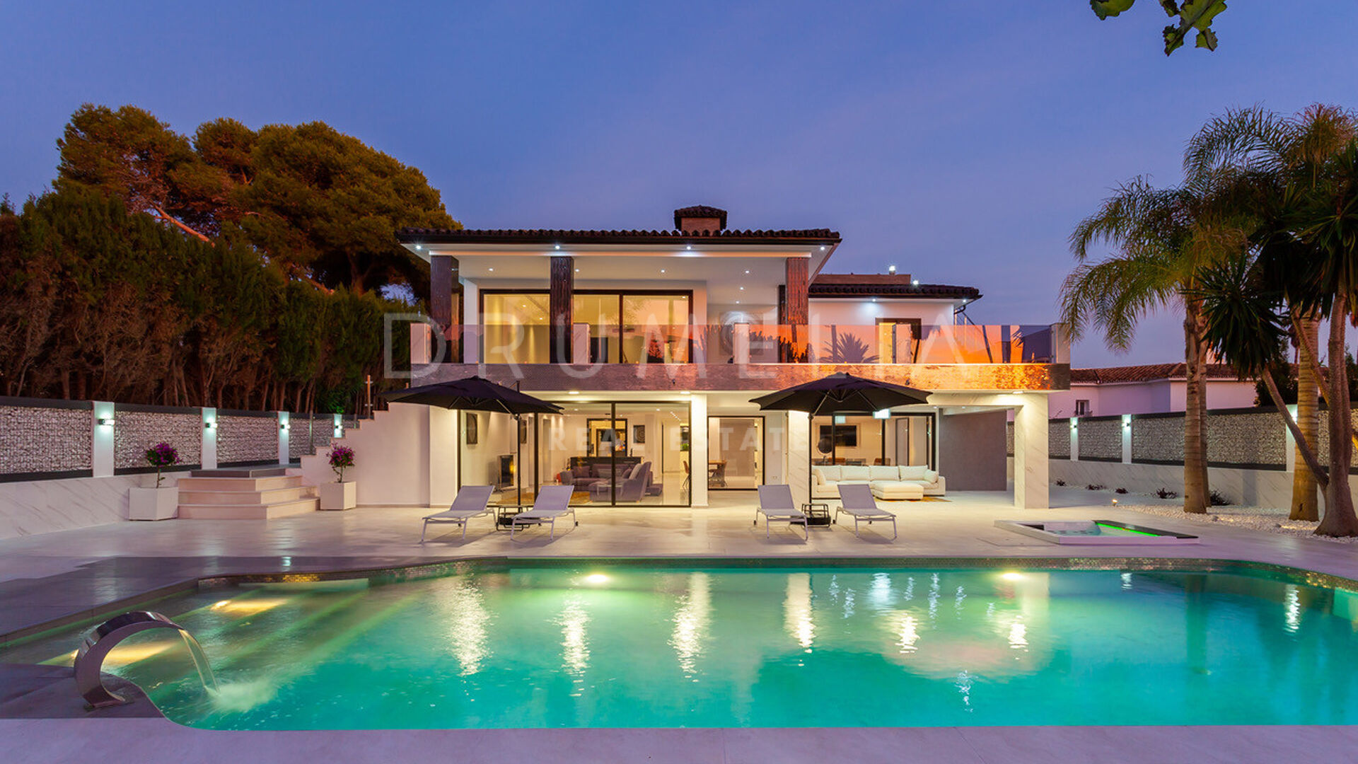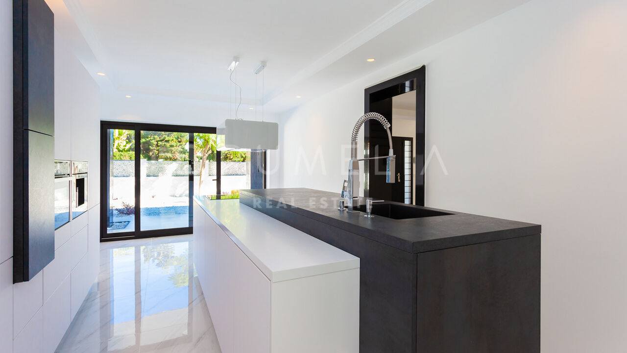 Een nieuw en volledig gerenoveerde villa aan het strand wordt te koop aangeboden in het mooie Los Monteros Playa in oostelijk Marbella
