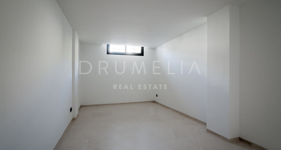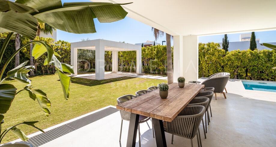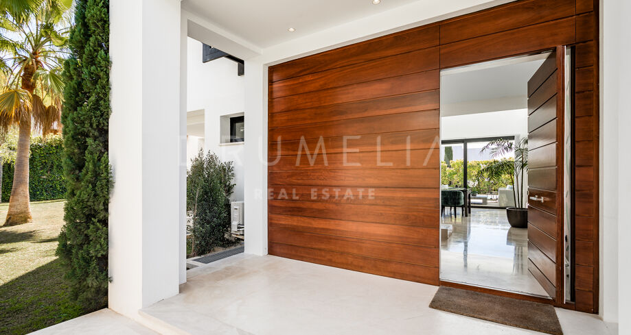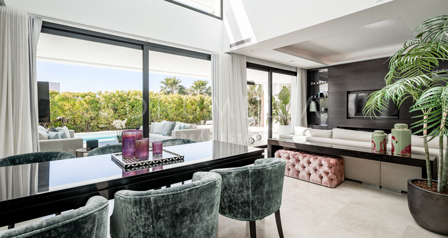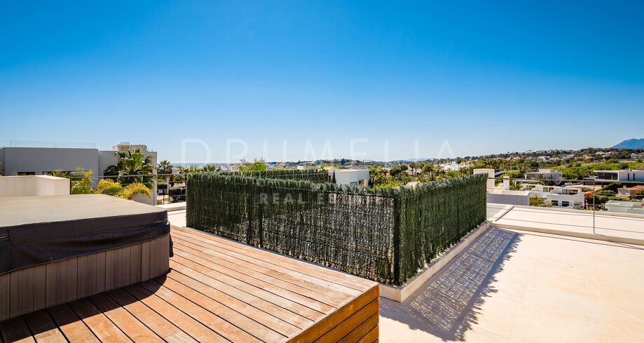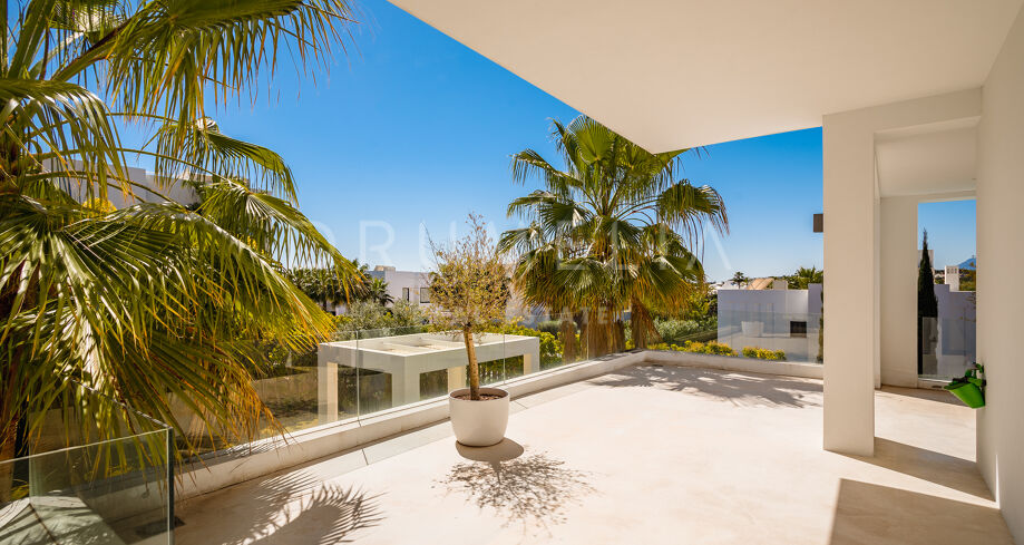 Het hoogwaardige huis van 357 m² met verbazingwekkende terrassen van 344 m² toont de verfijnde architectuur in hedendaagse stijl die voldoet aan de nieuwste trends en eisen op het gebied van voorzieningen en ontwerp. Het moderne concept biedt hoge plafonds en grote ramen die de open ruimtes en kamers vullen met veel natuurlijk licht en zon. Het perceel van 1001 m² beschikt over een zorgvuldig aangelegde tuin met palmbomen, groene gazons en een groot verwarmd zwembad. De brede terrassen hebben veel buitenruimtes die zorgvuldig in de schaduw liggen en perfect zijn om te ontspannen, en uitnodigen om te genieten van het heerlijke klimaat van Marbella. Verdeeld over 3 verdiepingen heeft het huis op de begane grond: een ruime woonkamer met verschillende zithoeken; een open volledig ingerichte keuken en eethoek uitgerust met topapparatuur en wijnkoeler; een gastensuite; veranda’s, terrassen en de tuin met volwassen planten die het huis omringen en privacy creëren ten opzichte van nabijgelegen huizen.