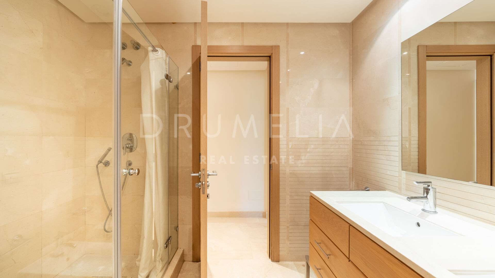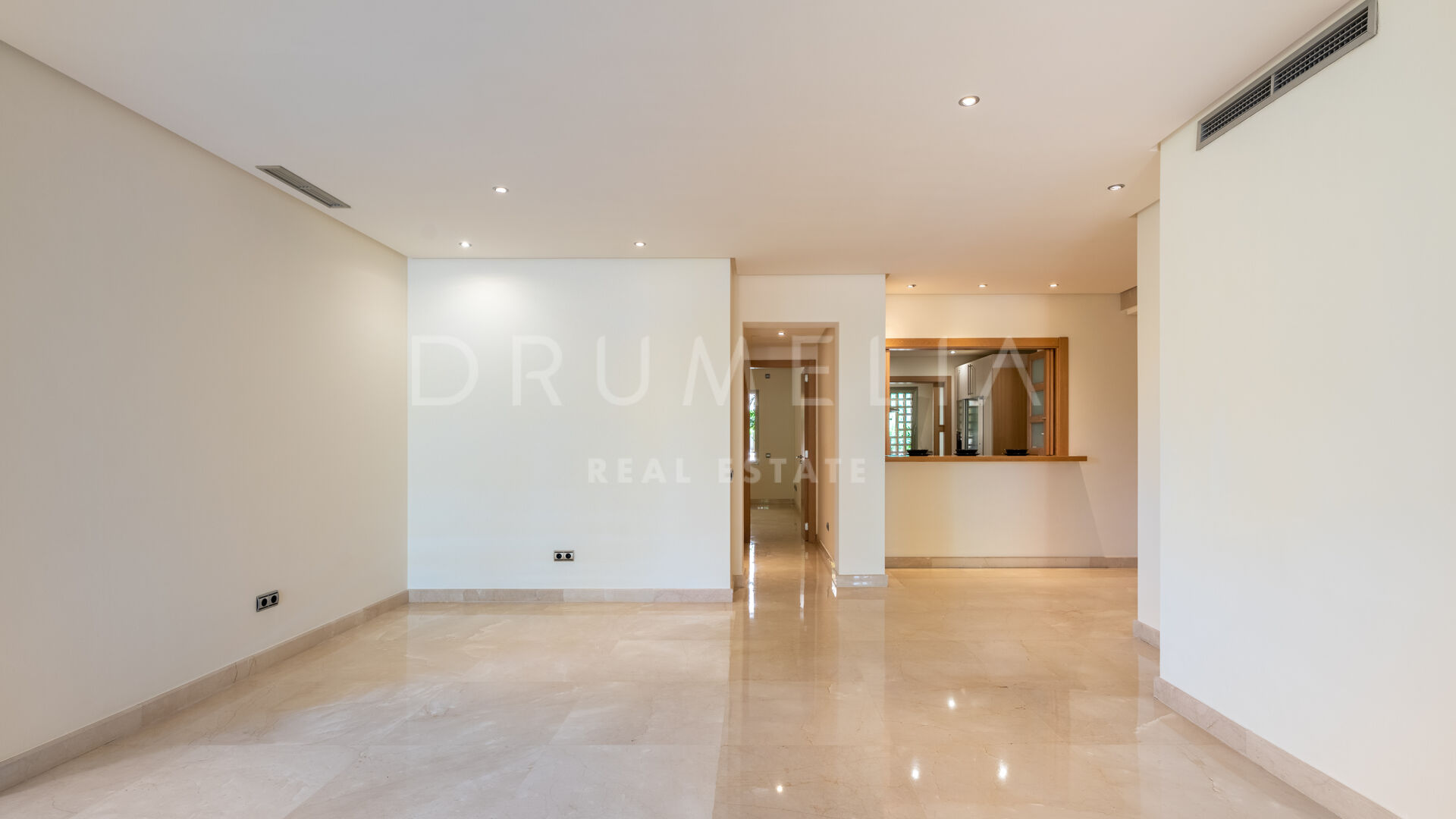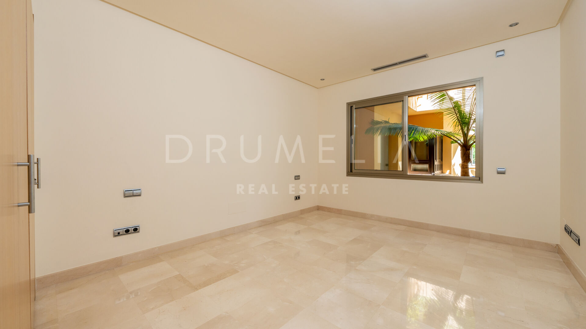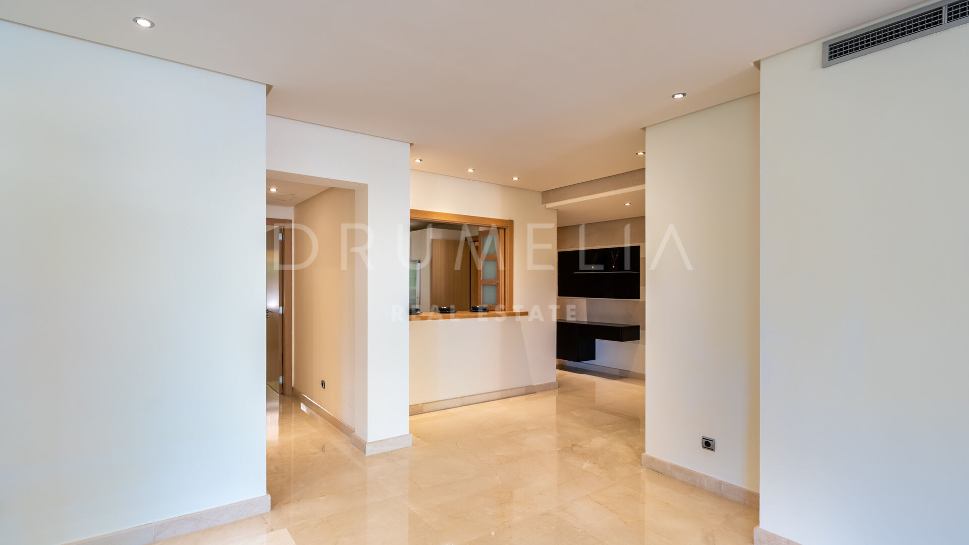 Het interieur van de woning is voorzien van inbouwkasten in de slaapkamers, die voldoende opbergruimte bieden en tegelijkertijd een strakke en rommelvrije esthetiek behouden. De elegante marmeren vloeren voegen een vleugje verfijning toe aan de leefruimtes en stralen luxe en verfijning uit.
