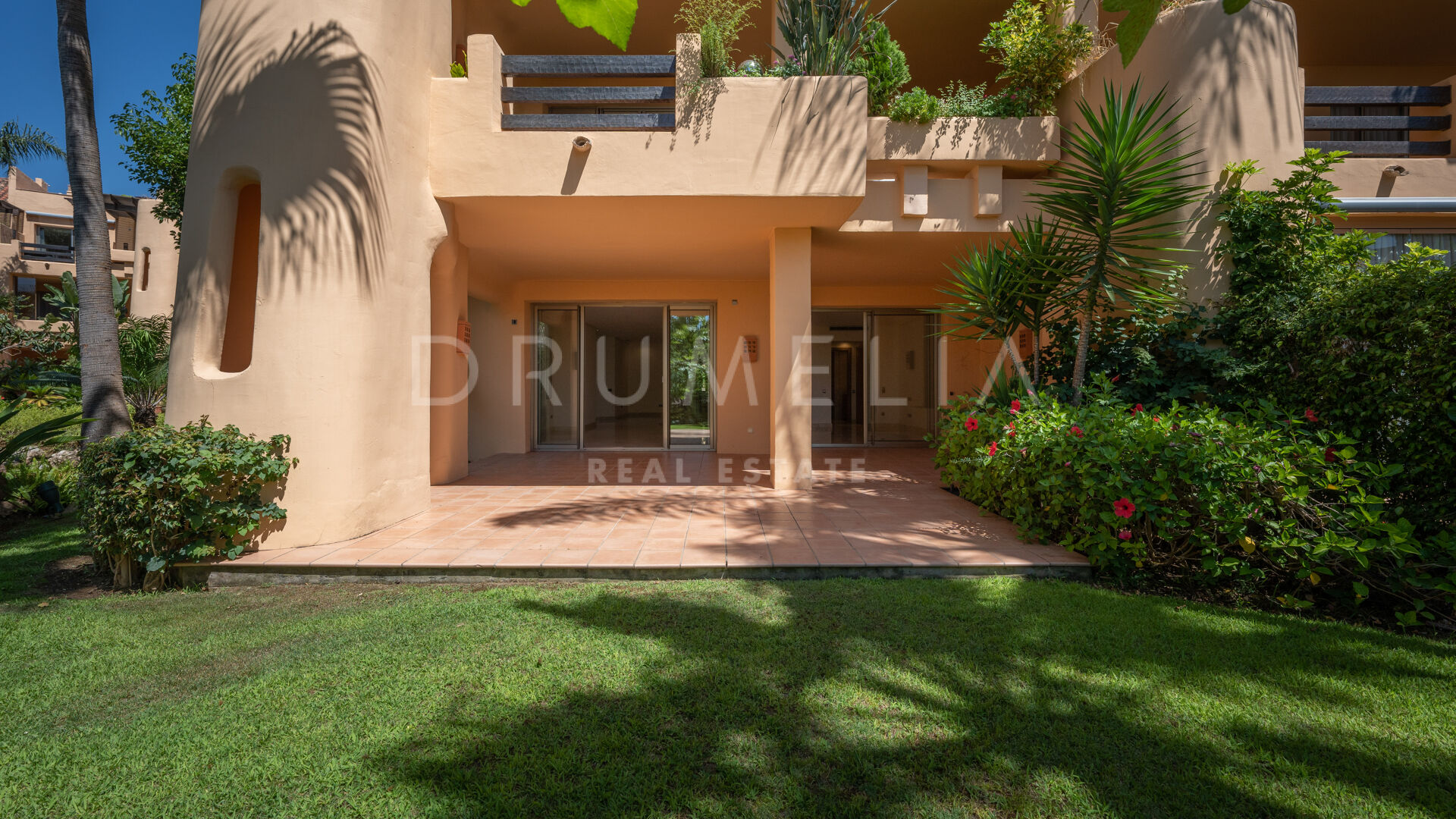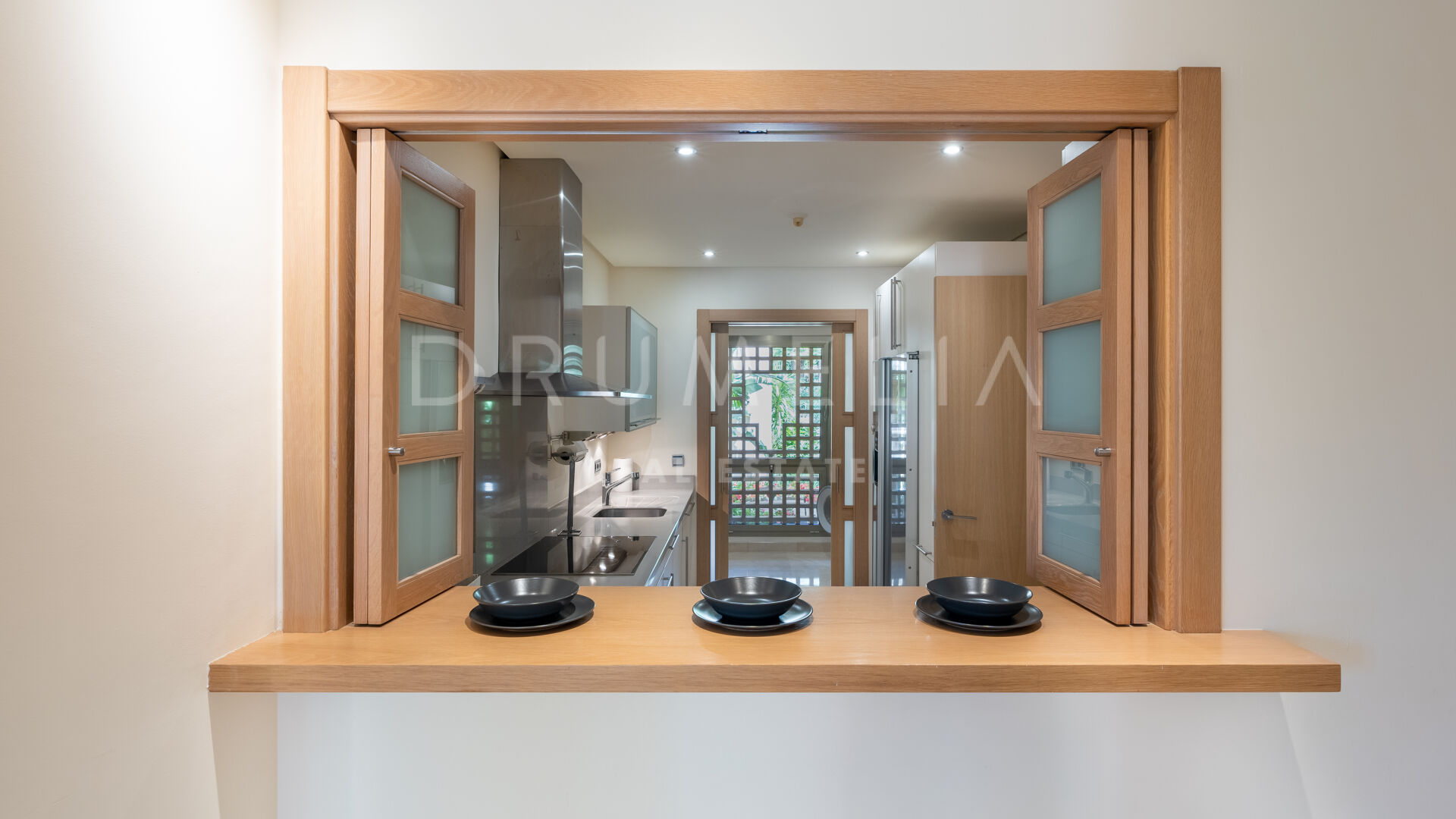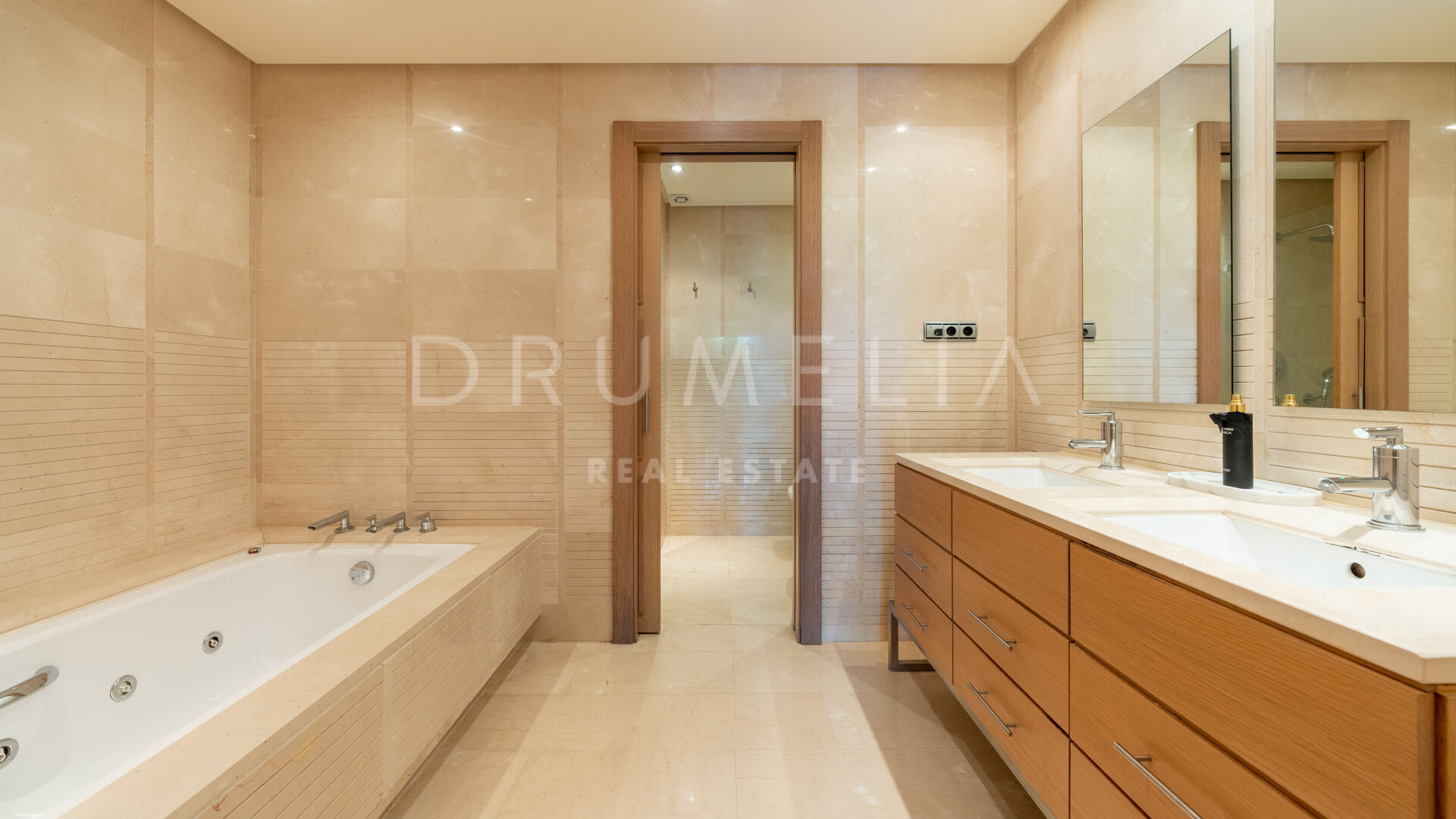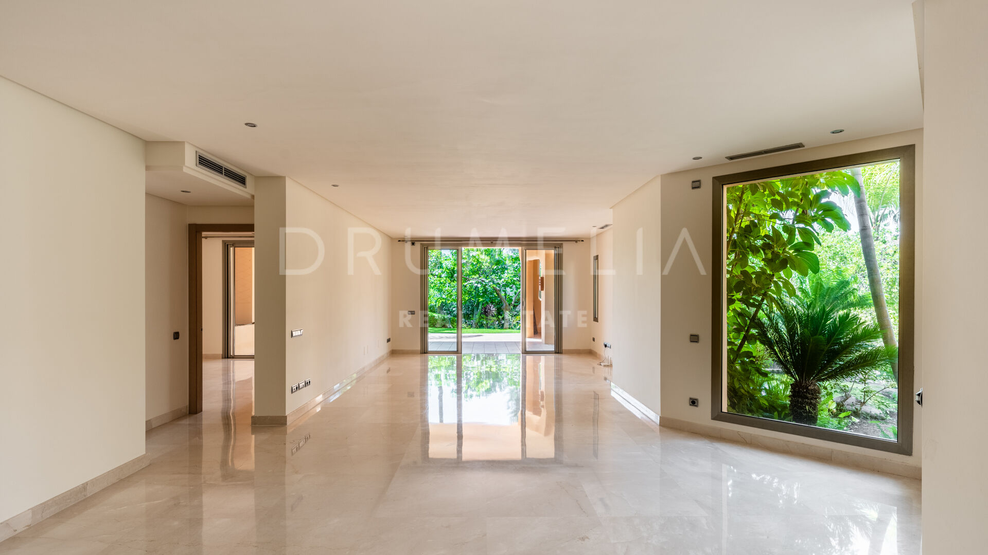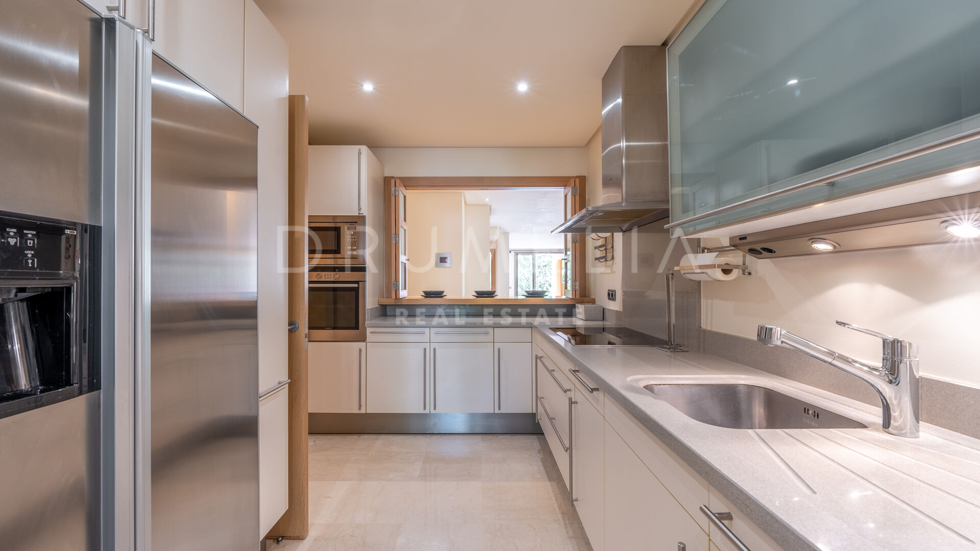 Het interieur van de woning is voorzien van inbouwkasten in de slaapkamers, die voldoende opbergruimte bieden en tegelijkertijd een strakke en rommelvrije esthetiek behouden. De elegante marmeren vloeren voegen een vleugje verfijning toe aan de leefruimtes en stralen luxe en verfijning uit.