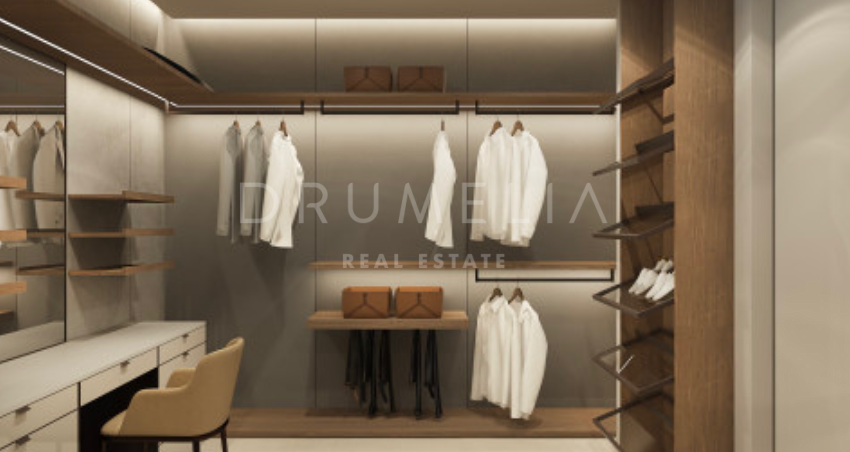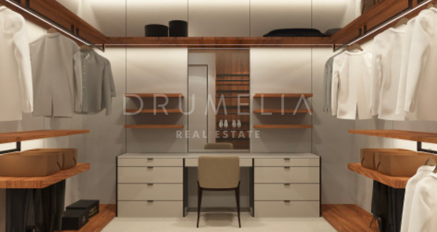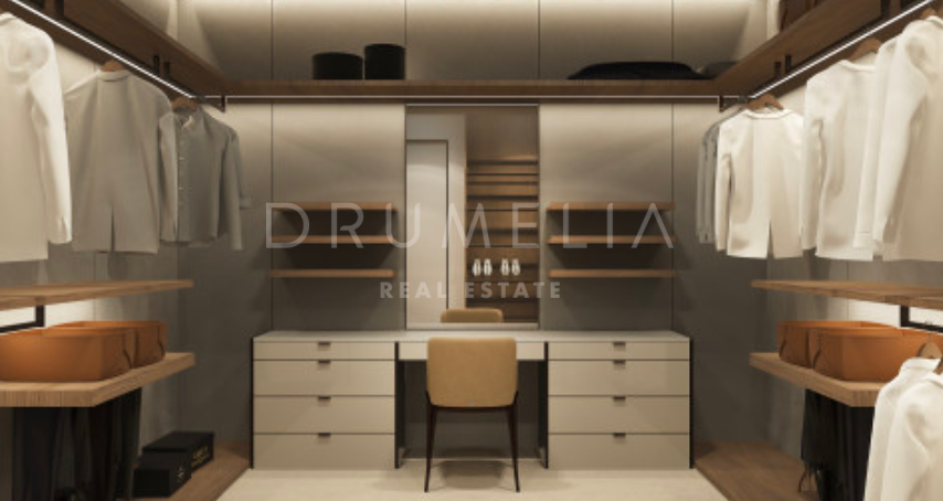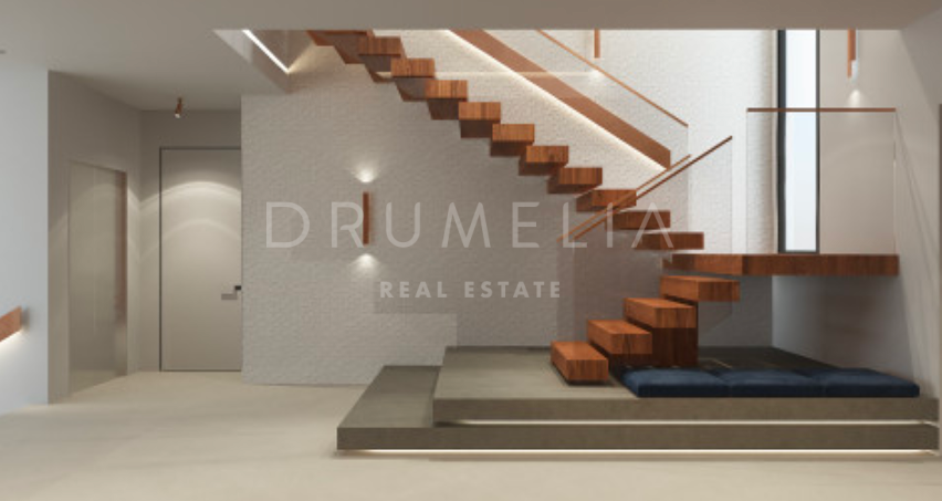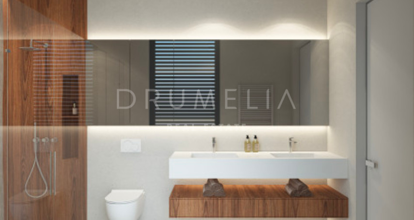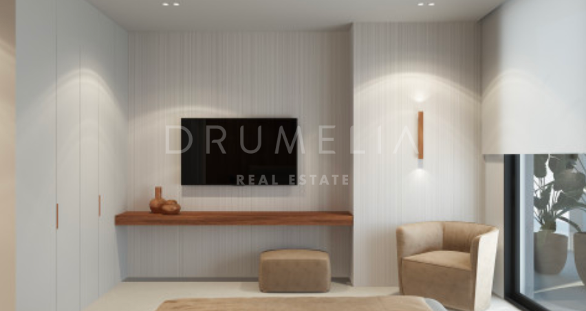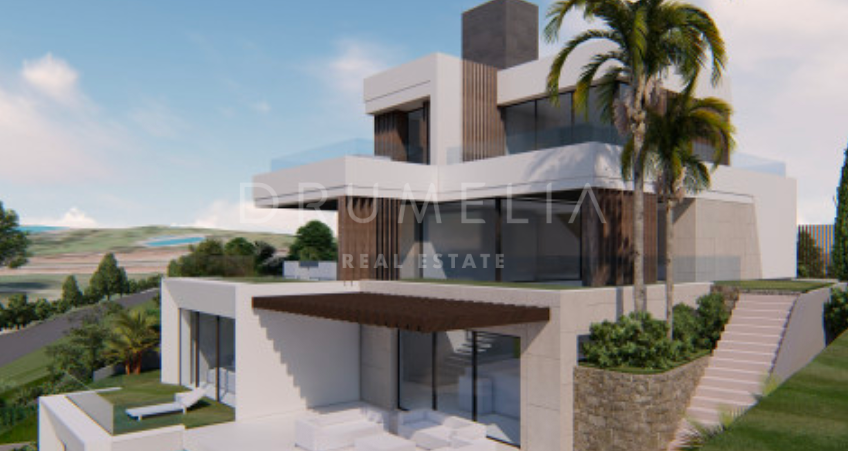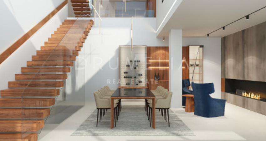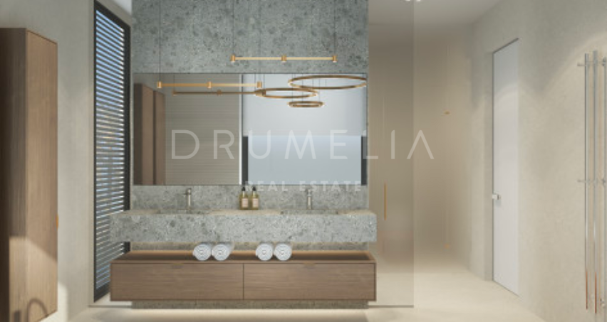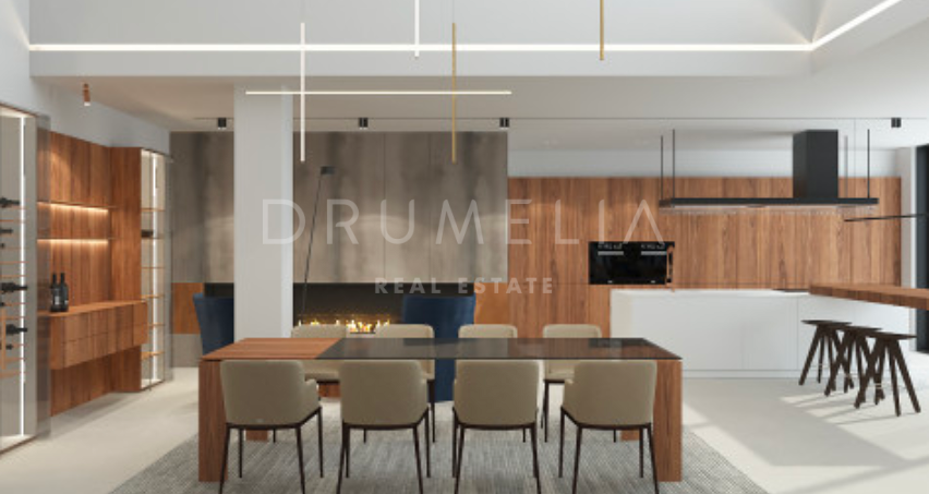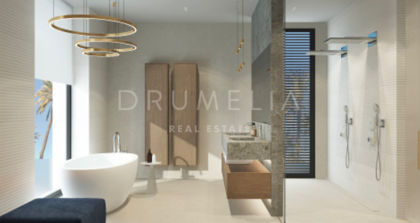 Het ontwerp omvat een ruime open woon-, keuken- en eetkamer van meer dan 125 m² die uitkomt op een privéterras, aangelegde tuin en een prachtige infinity pool. De hoofdslaapkamer meet meer dan 65 m² en biedt een luxe toevluchtsoord, aangevuld met drie ruime slaapkamers met eigen badkamer en privéterras. Het panoramische dakterras biedt een adembenemend uitzicht, terwijl de benedenverdieping ruimte biedt voor een speelkamer, fitnessruimte of spa, evenals de mogelijkheid om een vijfde gastensuite toe te voegen. De kelder van meer dan 250 m² biedt parkeergelegenheid en opslagruimtes, wat het comfort en de functionaliteit compleet maakt.