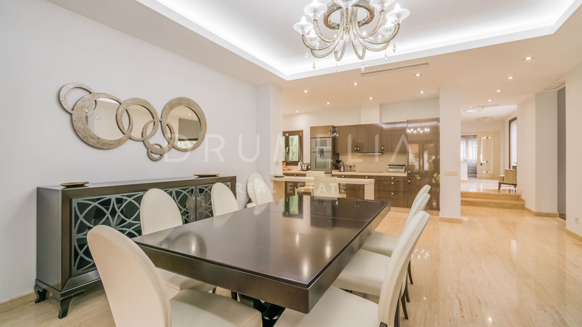 Gelegen op een perceel van 1.100 m², biedt deze fantastische villa van 603 m² een expansieve woonkamer met zithoek en glazen deuren over de gehele breedte naar een heerlijk beglaasd chill-out terras, een open exquise eetkamer en een volledig ingerichte strakke keuken met hoogwaardige apparatuur en eigentijdse glanzende kasten die een subtiele elegantie heeft die nooit uit de mode zal raken. 3 serene slaapkamers, 1 gastentoilet en 3 luxueuze badkamers, een kleedkamer in hout perfect voor uw modieuze designcollecties, een bar, een bioscoopzaal, alles is zowel modern als klassiek tijdloos.