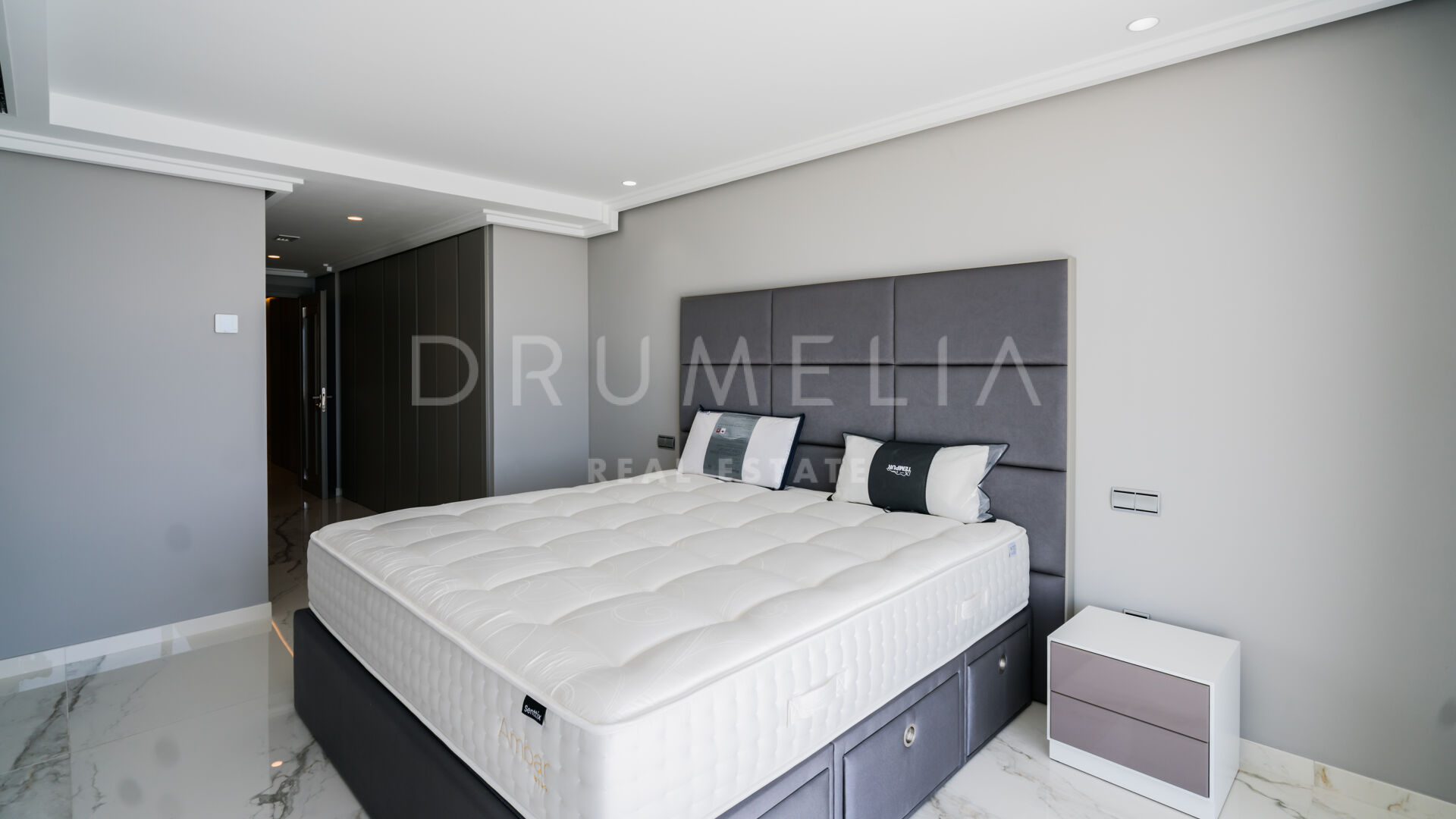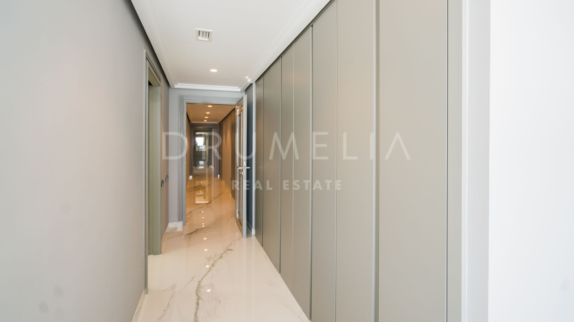Dit luxe strandappartement van uitstekende kwaliteiten biedt een leven van uitzonderlijk comfort dankzij de onovertroffen ligging direct aan het strand, het spectaculaire uitzicht, de hoge normen, het elegante moderne interieur en de functionaliteit van de ruimte. De verhoogde gelijkvloerse woning van 433 m² beschikt over een ruime woon- en eetkamer verbonden met een buiten lounge terras met uitzicht op zee, 4 serene slaapkamers, 3 prachtig uitgeruste badkamers en 1 toilet, volledig ingerichte en uitgeruste slanke, minimalistische stijl keuken. Het prachtige grote terras met zon- en schaduwoplossing nodigt uit tot ontspannen kijken naar de voorbijvarende jachten en luisteren naar de geluiden van de golven. Terwijl u daar al fresco dineert met uw familie of vrienden, voelt u zich alsof u aan boord van het schip bent en Afrika binnen handbereik is. Het op het zuiden/oosten georiënteerde appartement geniet van verbazingwekkende panorama’s over de Middellandse Zee en serene uitzichten op de aangelegde subtropische tuin, hoge palmbomen en het zwembad in tropische stijl met mooie ‘palapa’s’, parasols met rieten dak. Een privé garage houdt 4 parkeerplaatsen voor u vrij!
