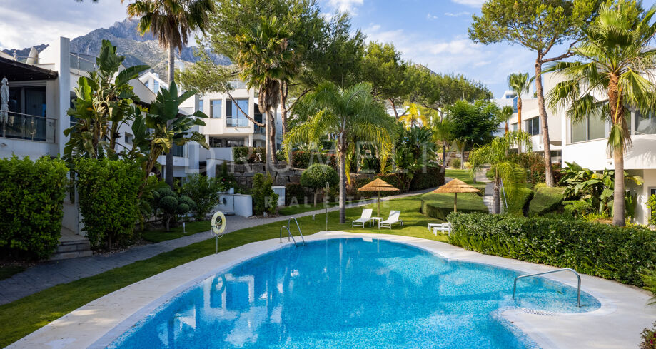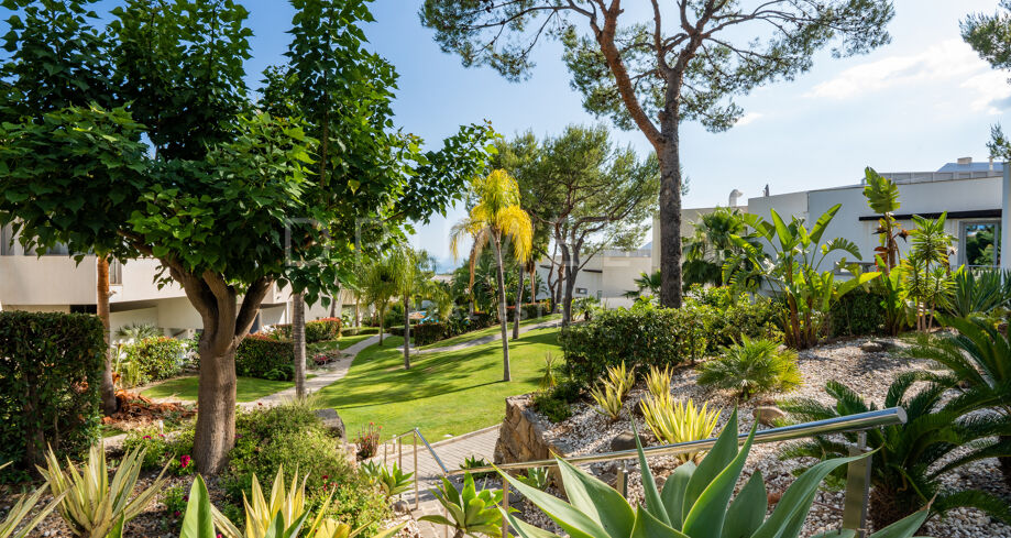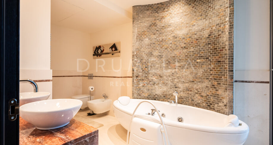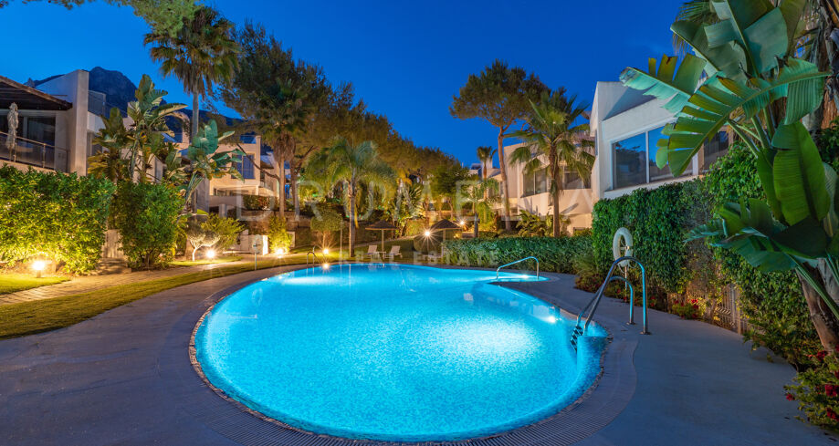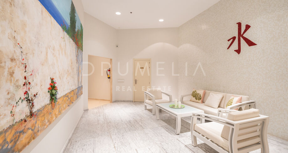 Dit elegante halfvrijstaande huis te koop is gelegen in de beroemde urbanisatie Meisho Hills aan het bovenste deel van de beroemde Golden Mile van Marbella, Sierra Blanca. Het luxe omheinde complex valt op door zijn exclusieve en avant-garde ontwerp, goed onderhouden gemeenschappelijke ruimtes met spectaculaire tuinen in Zen-stijl en alle geboden voorzieningen, waaronder buiten- en binnenzwembaden voor kinderen en volwassenen, een fitnessruimte met de modernste machines, 3 SPA-ruimtes, met een Turks bad, sauna en verwarmd zwembad (elke 8 huizen delen een andere SPA, zwembad en sauna).