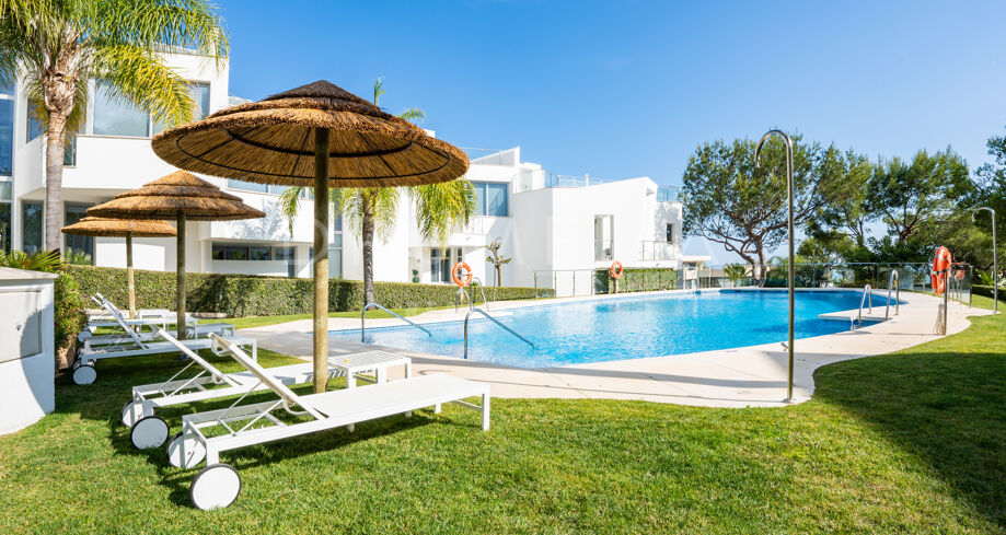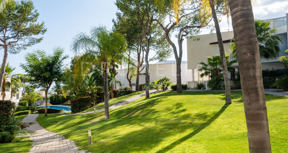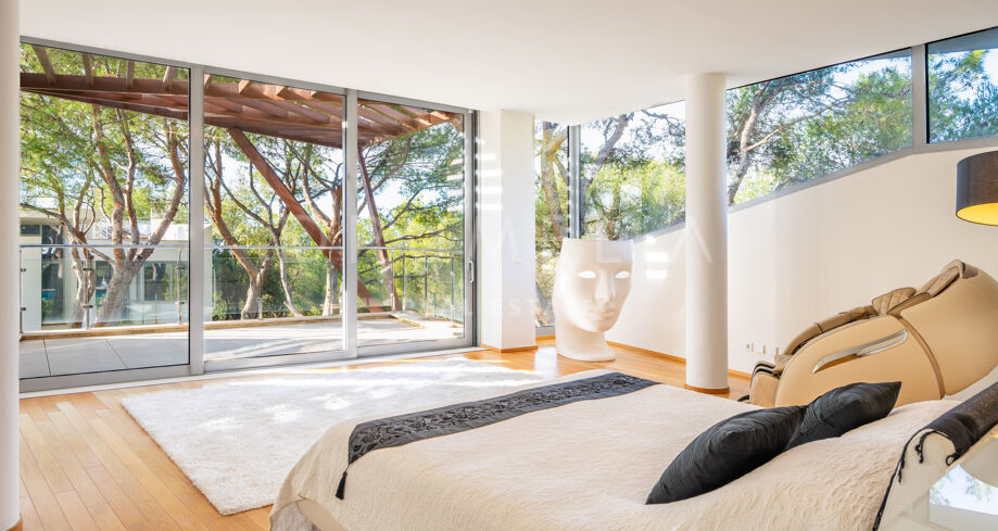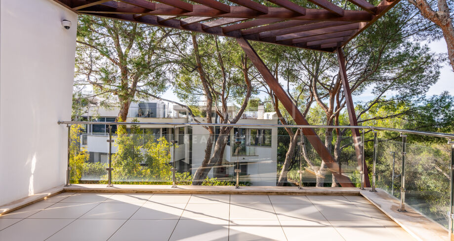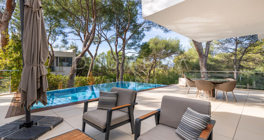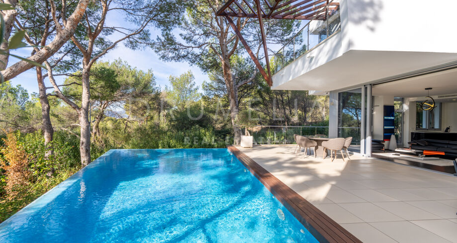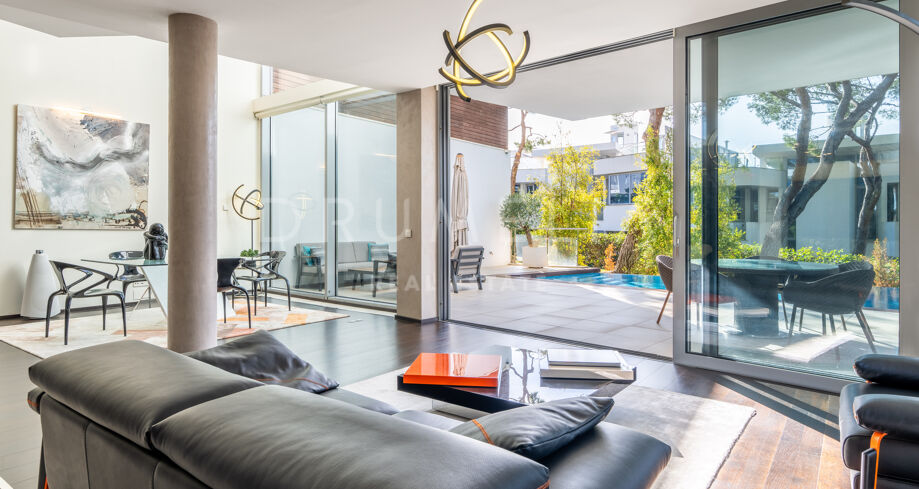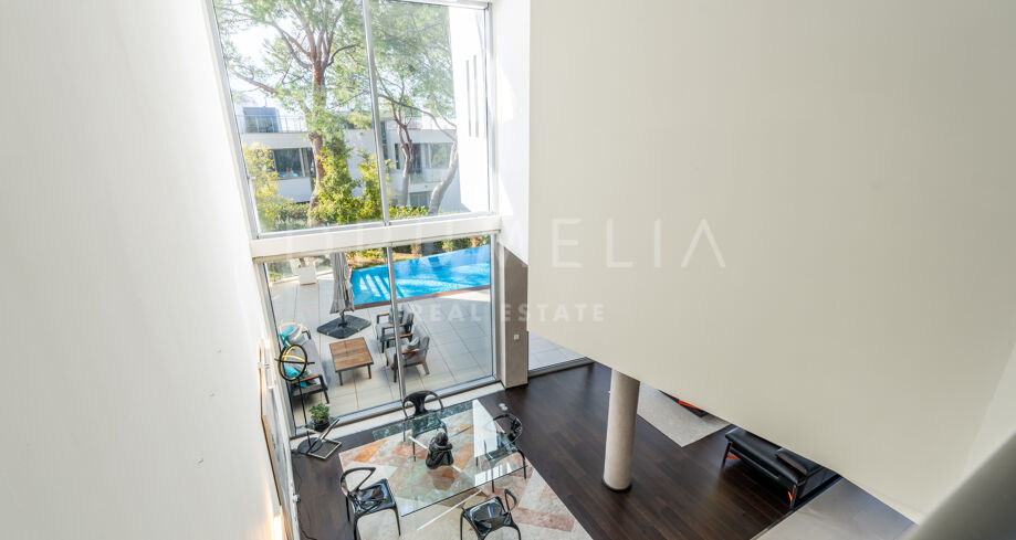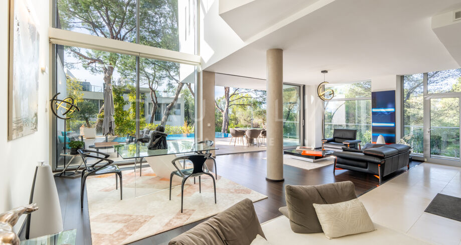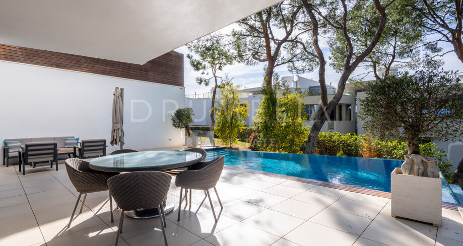 Het op een perceel van 681 m² gelegen Zuid/West gerichte huis van 360 m² met terrassen van 314 m² heeft een unieke stijl, omdat het de laatste is van zijn groep van 8 en grenst aan het dennenbos. Hoewel het huis geen eigen tuin heeft, heeft het een prachtig overloopzwembad voor de veranda en de woonkamer. De ruimtelijkheid en de hoogte van de plafonds maken de woonkamer tot een zeer grote ruimte om van te genieten, waardoor het een zeer persoonlijke stijl van inrichting heeft door high-end Roche Bobois. Een open strakke en moderne keuken is uitgerust met de nieuwste Miele apparatuur. De begane grond wordt aangevuld met een slaapkamer suite, een gastentoilet, een bibliotheek met toegang tot de wasruimte, een kleine zitkamer, een TV- en muziekkamer, een berging en een garage voor 2 auto’s.