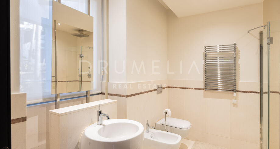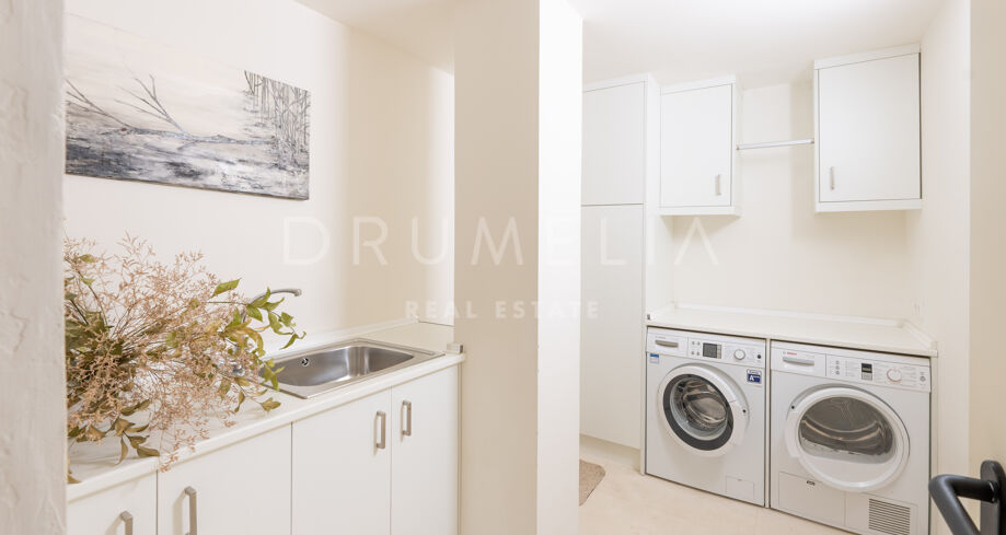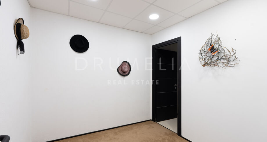 De toegang tot de bovenverdieping is via een moderne en comfortabele trap of een lift. Daar word je verwelkomd door een elegant kantoor dat leidt naar 2 grote slaapkamers. De indrukwekkende hoofdslaapkamer heeft een luxe en-suite badkamer en een eigen terras. Vermeldenswaard is dat alle slaapkamers in het huis toegang hebben tot buitenterrassen. Op de derde verdieping is er een groot solarium dat het hele oppervlak van het huis in beslag neemt, met gezellig buitenmeubilair waarvan je kunt genieten tijdens de aangename zomeravonden van de Costa del Sol.