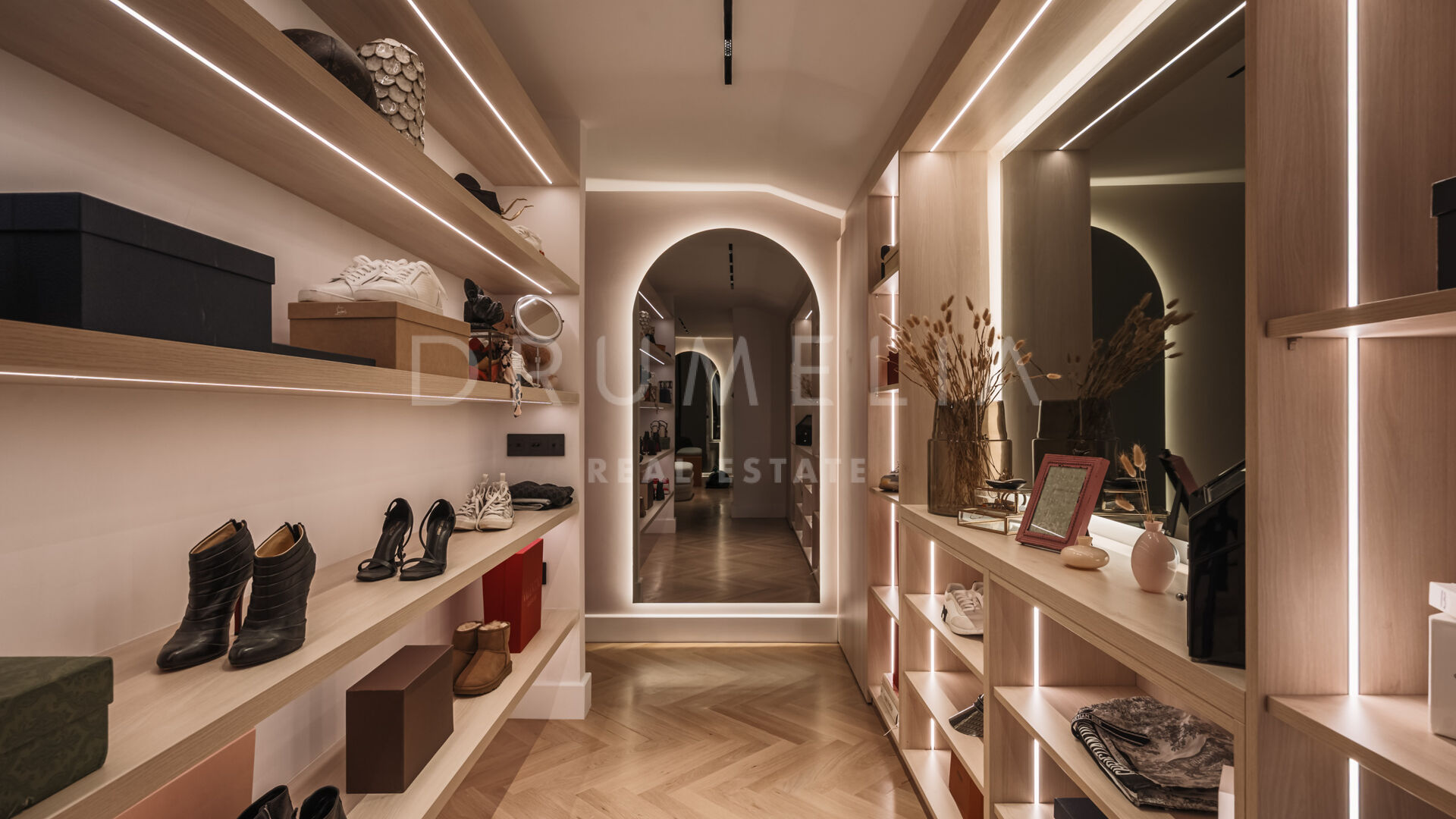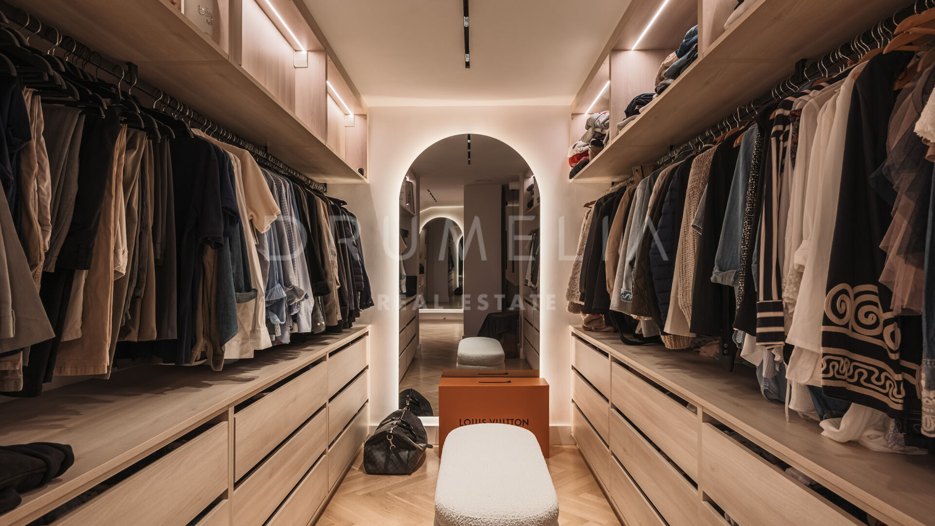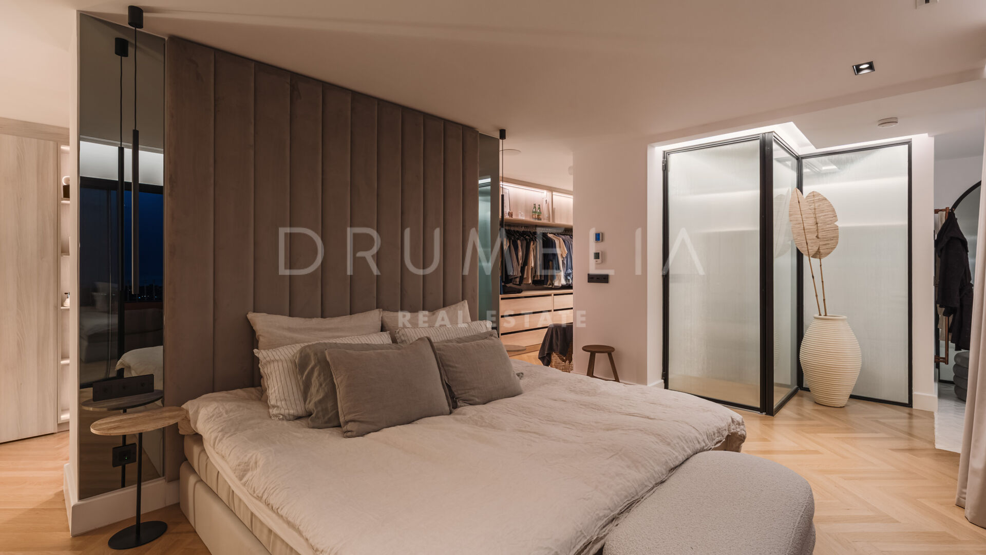 Luxe details zijn onder meer 15 geïntegreerde Sonos-speakers, slimme schakelaars van Buster and Punch en een verborgen kantoorruimte. De master suite biedt 16 meter aan op maat gemaakte kasten, een hotelkwaliteit Zweeds bed en een en-suite badkamer met dubbele regendouche en design glazen wanden. Badkamers zijn afgewerkt met microcement, vloerverwarming en getinte spiegels op maat.