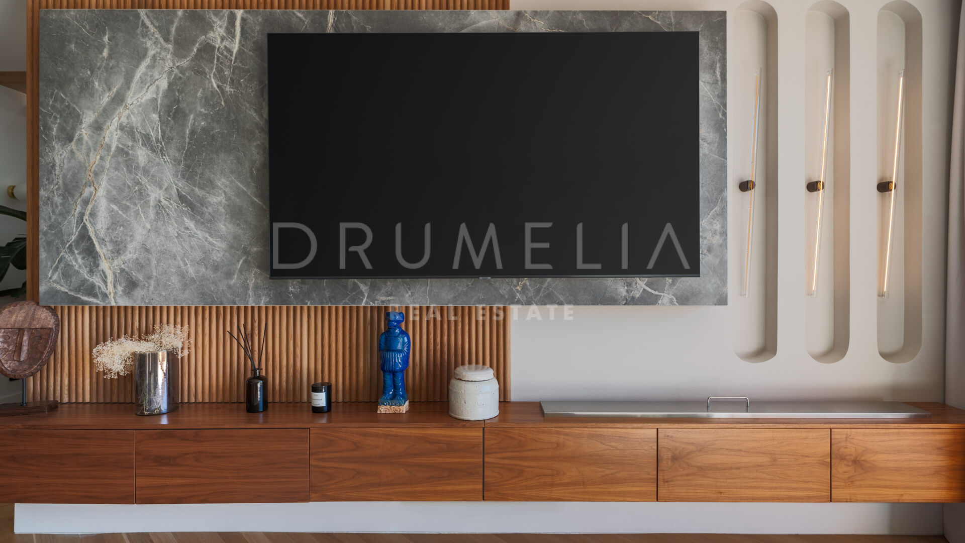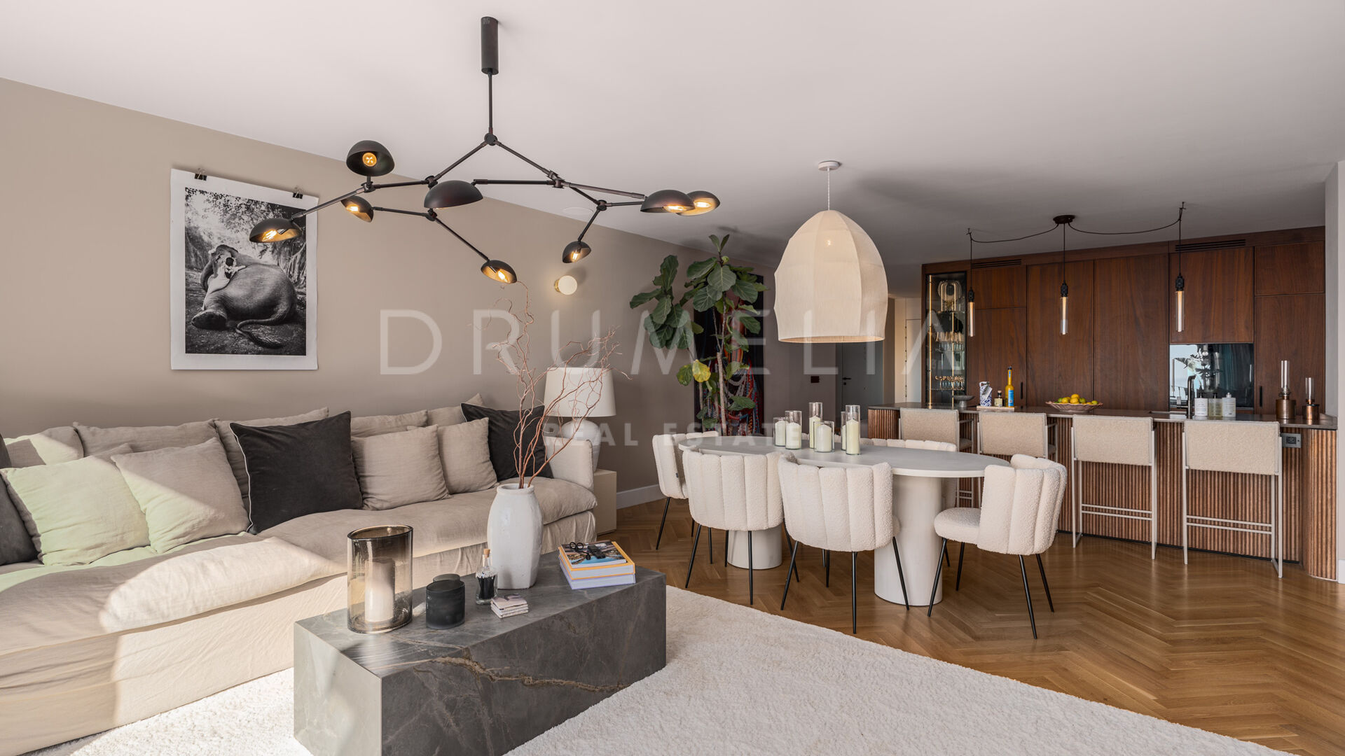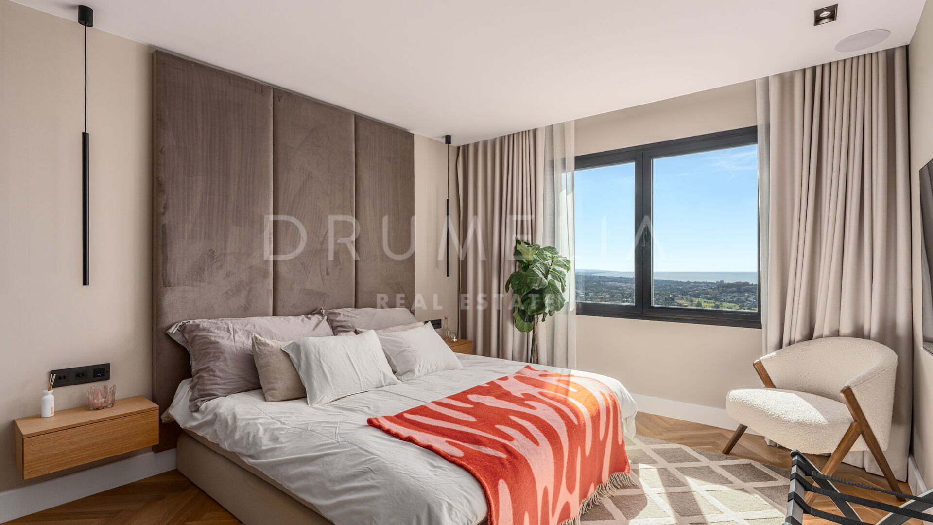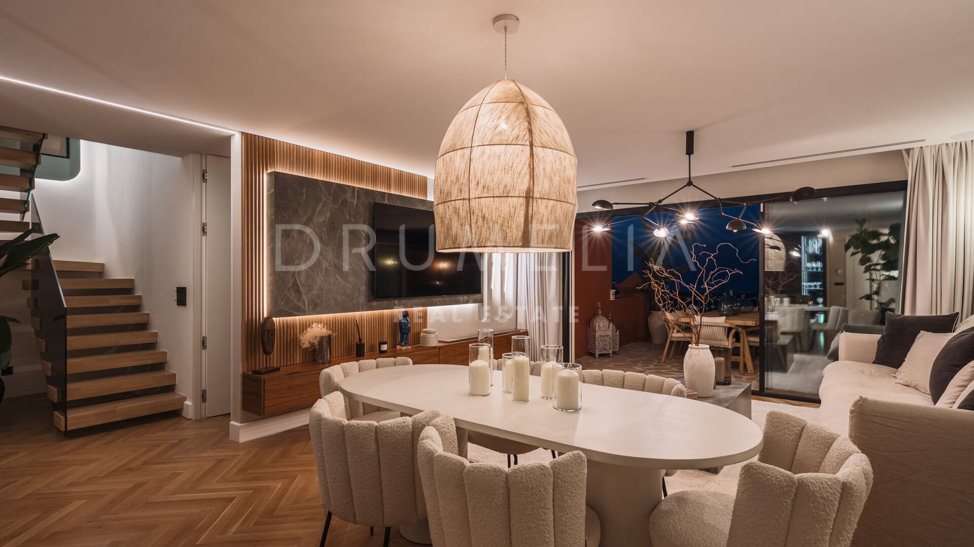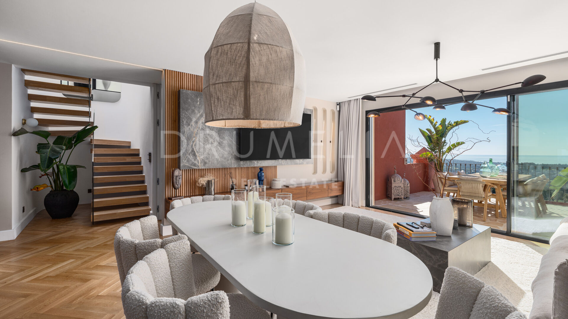 De woning is ontworpen om natuurlijk licht en een open gevoel te maximaliseren, met vloer-tot-plafond ramen en schuifdeuren van Cortizo Slim, elegante houten visgraatvloeren en maatwerk deuren. De open woonkamer is het hart van het huis, met een op maat gemaakte walnoothouten keuken voorzien van Gaggenau en Smeg apparatuur, naadloos verbonden met eet- en zithoek – perfect voor informeel of formeel gebruik. Het interieur combineert Scandinavische elegantie met mediterrane warmte, met designmeubels van onder andere Bycrea en Zoco Home.
