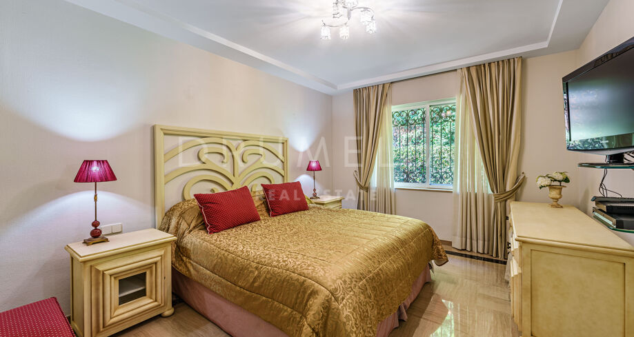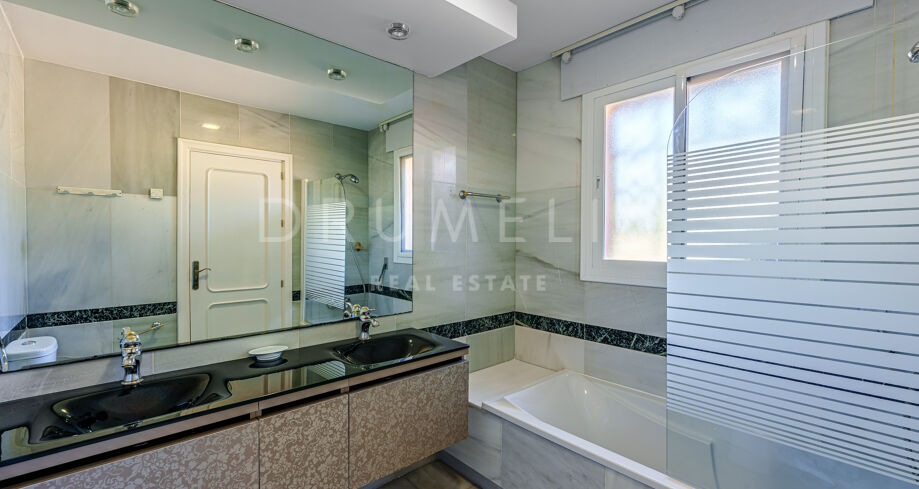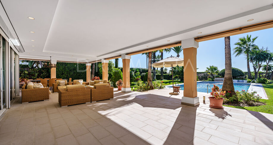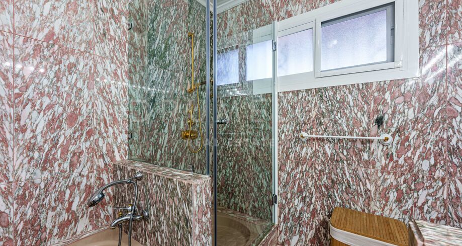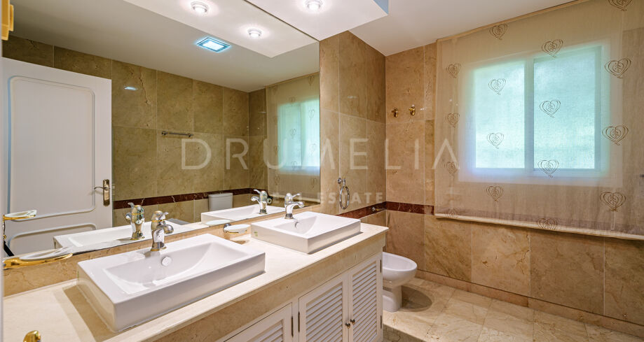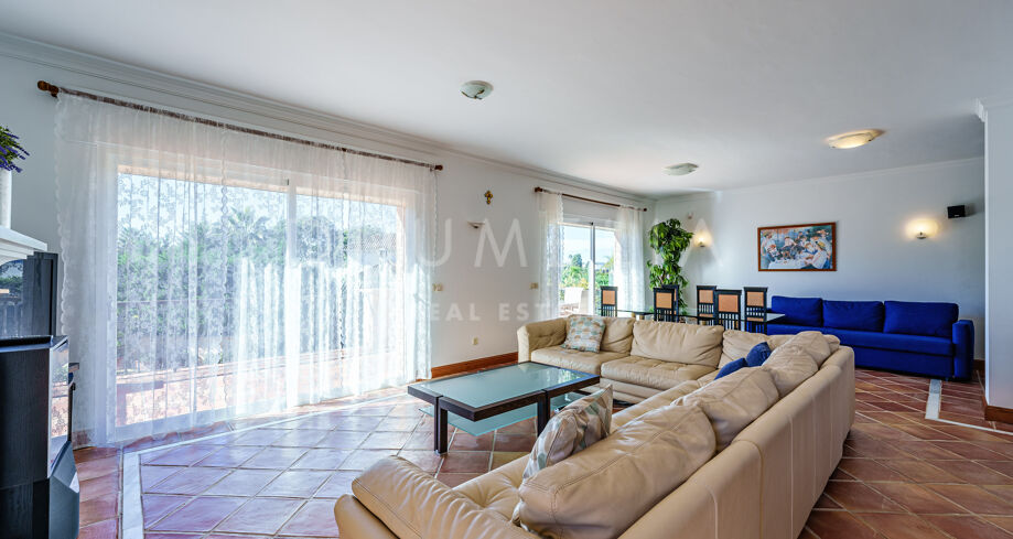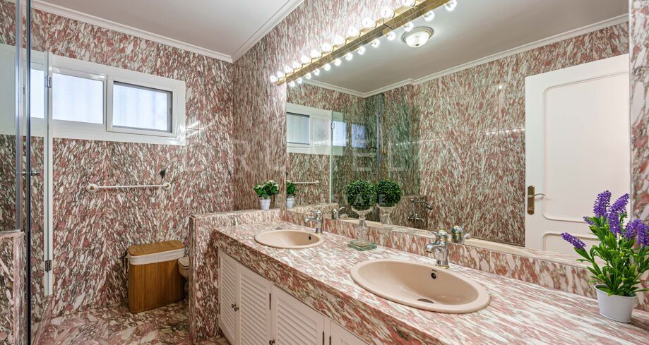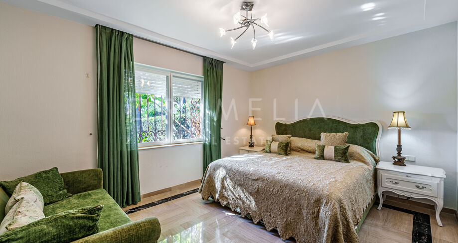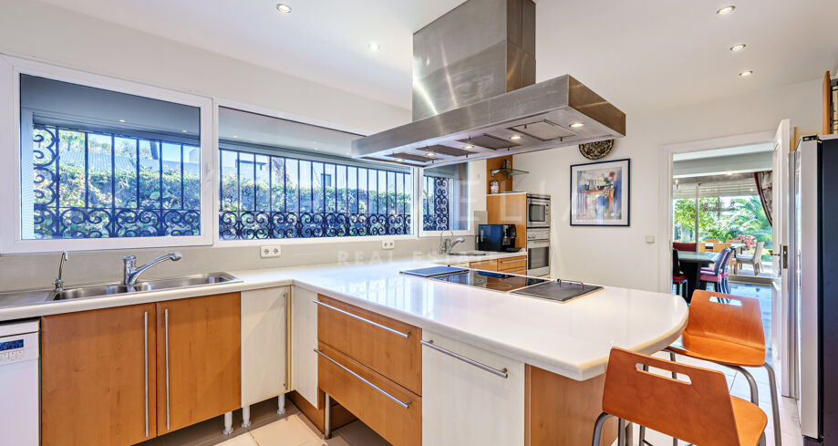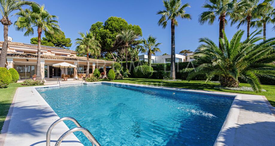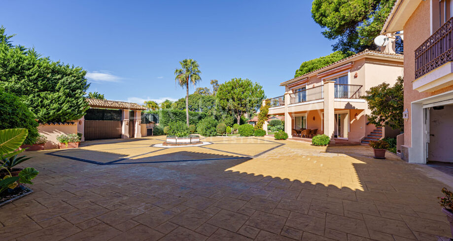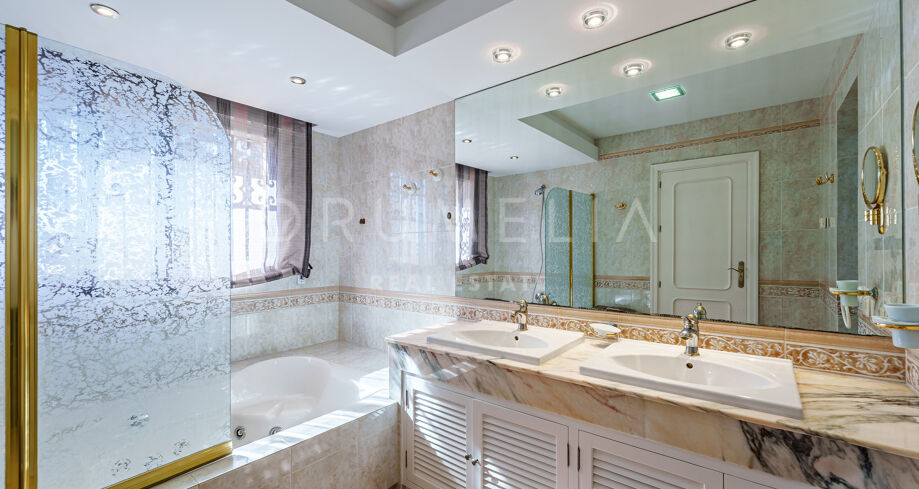 Het Gastenhuis bestaat uit 2 en-suite slaapkamers, een grote woonkamer met open keuken, een wasruimte en een bijkeuken. De aparte garage biedt plaats aan 4 auto’s, en er is ook een buitenkeuken, een barbecue en een bar. Dit luxe huis is gebouwd volgens de hoge standaard, maar moet misschien gerenoveerd worden en je kunt het opwaarderen, waardoor de waarde van het onroerend goed toeneemt. Het is te koop met optionele meubels. Een open haard, airconditioning, vloerverwarming in alle badkamers, elektrische rolluiken, fitnessruimte, inbouwkasten, automatisch irrigatiesysteem en vele andere voorzieningen zullen je leven heel comfortabel maken; een alarmsysteem en bewakingscamera’s zorgen voor je veiligheid. Het zwembad is verwarmd en je kunt er het hele jaar door zwemmen. Dit is de perfecte gelegenheid om je eigen hoogwaardige mediterrane villa aan het strand te verwerven!