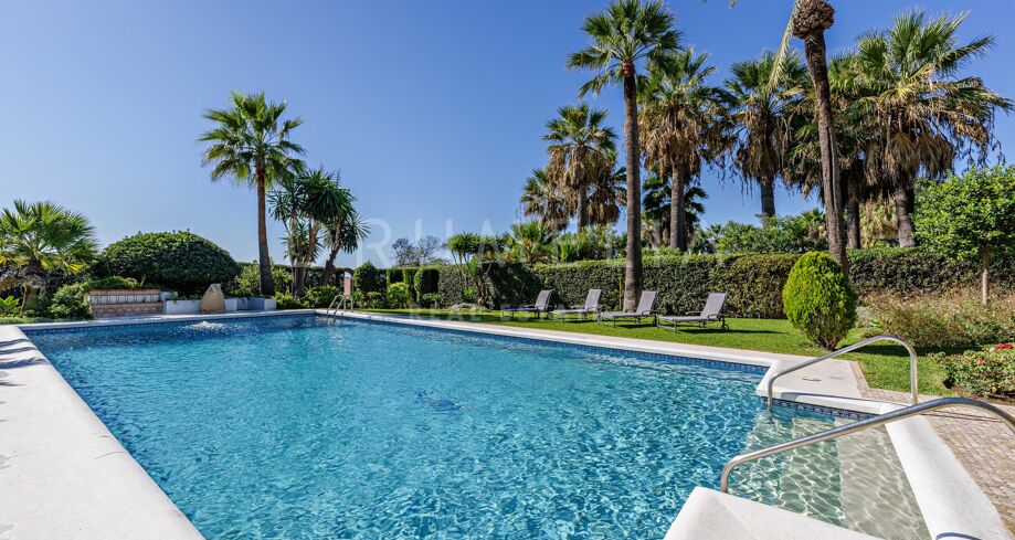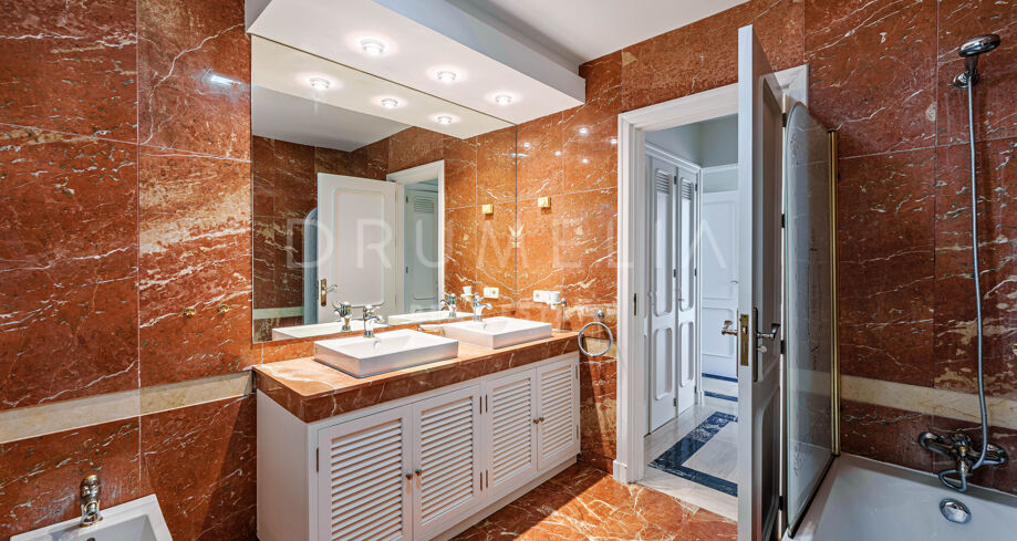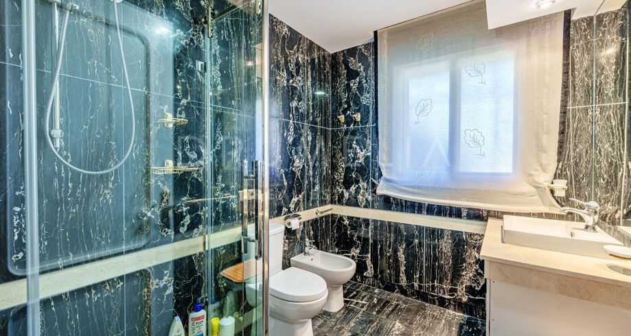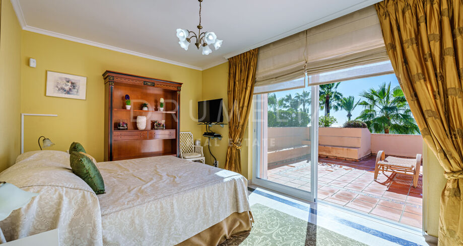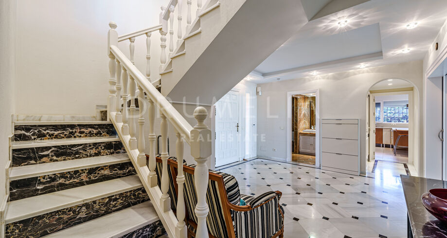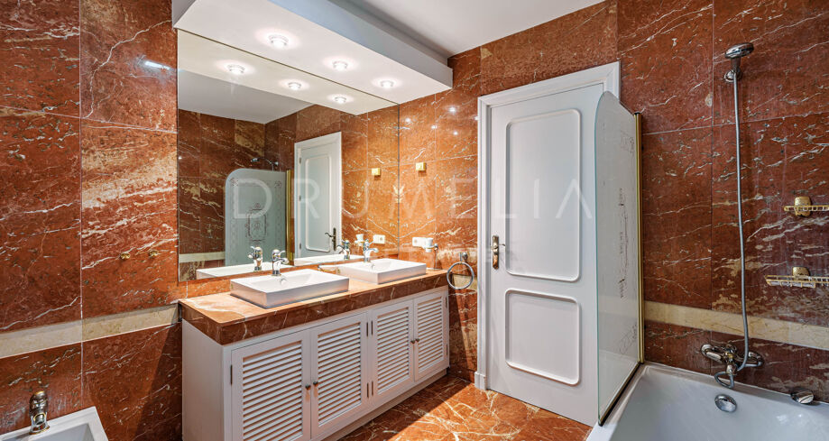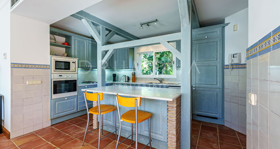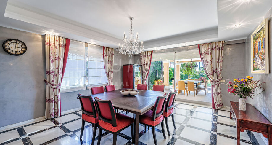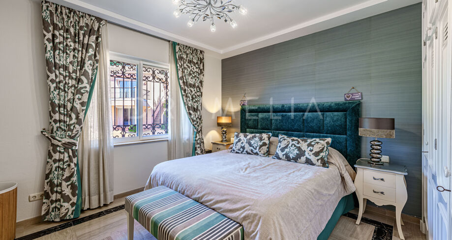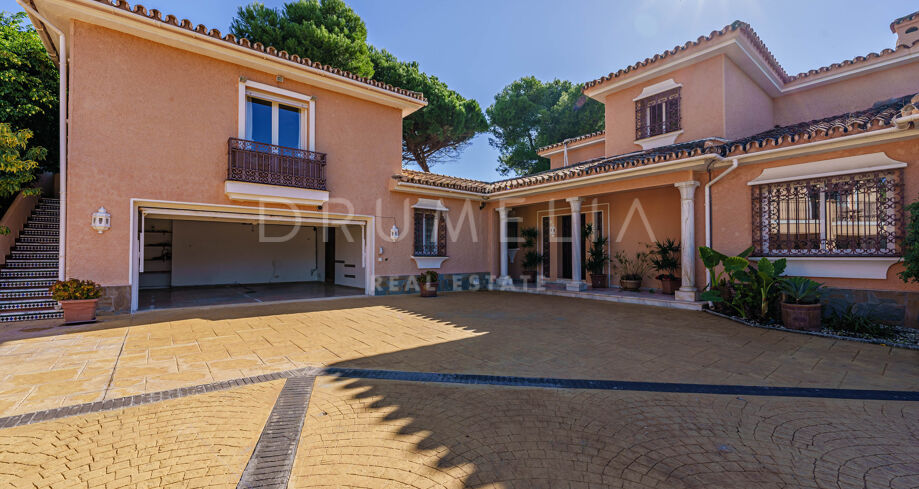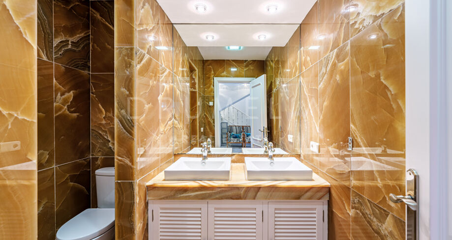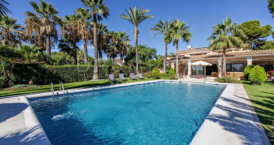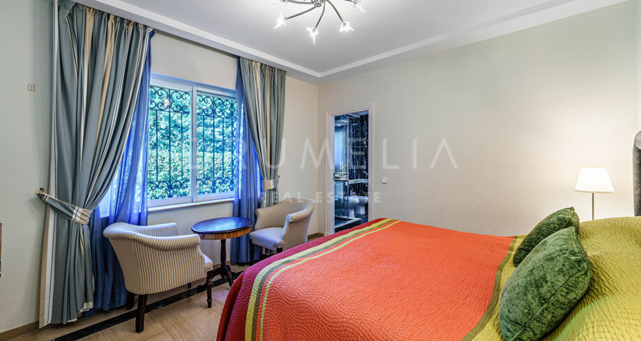 Het Gastenhuis bestaat uit 2 en-suite slaapkamers, een grote woonkamer met open keuken, een wasruimte en een bijkeuken. De aparte garage biedt plaats aan 4 auto’s, en er is ook een buitenkeuken, een barbecue en een bar. Dit luxe huis is gebouwd volgens de hoge standaard, maar moet misschien gerenoveerd worden en je kunt het opwaarderen, waardoor de waarde van het onroerend goed toeneemt. Het is te koop met optionele meubels. Een open haard, airconditioning, vloerverwarming in alle badkamers, elektrische rolluiken, fitnessruimte, inbouwkasten, automatisch irrigatiesysteem en vele andere voorzieningen zullen je leven heel comfortabel maken; een alarmsysteem en bewakingscamera’s zorgen voor je veiligheid. Het zwembad is verwarmd en je kunt er het hele jaar door zwemmen. Dit is de perfecte gelegenheid om je eigen hoogwaardige mediterrane villa aan het strand te verwerven!