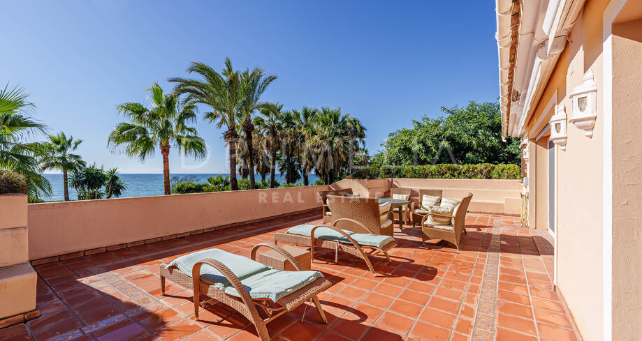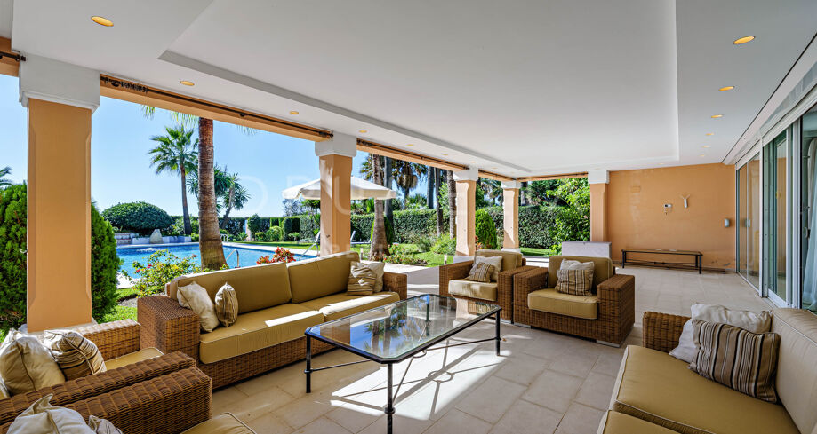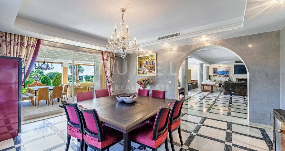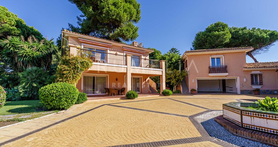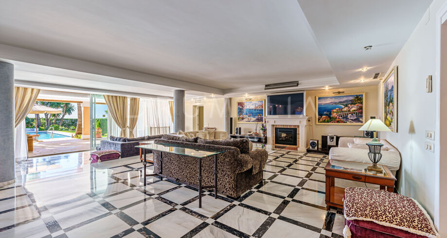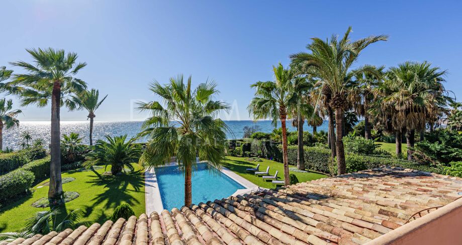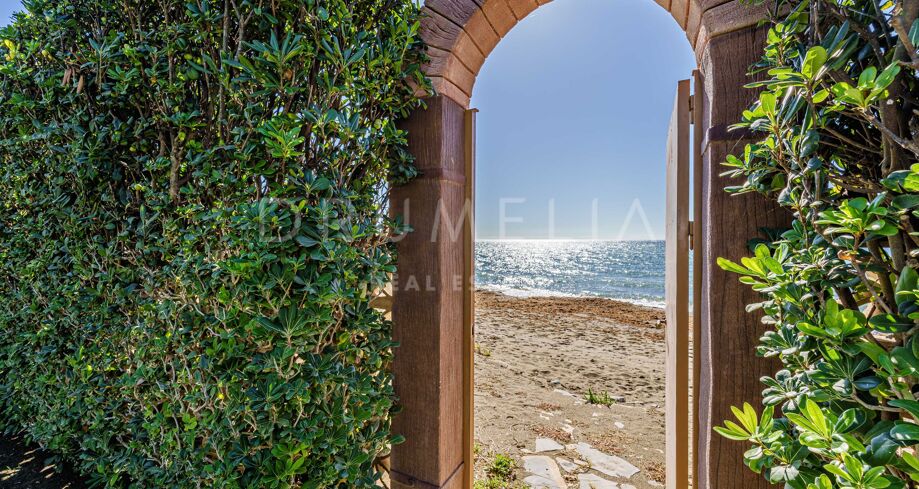 Dit luxe huis met 9 slaapkamers staat te koop aan de New Golden Mile in Estepona, een van de meest gewilde delen van de Costa del Sol. Deze woning heeft een werkelijk opmerkelijke ligging aan het strand met geweldig uitzicht op zee en directe toegang tot het strand via een privépoort. Het is allemaal dicht bij alle voorzieningen van de kustplaatsen Estepona en Marbella, het legendarische Puerto Banus, een reeks supermarkten en winkels, golfbanen, scholen, restaurants, bars en een verscheidenheid aan diensten aan de New Golden Mile. Het fantastische op het zuiden gelegen mediterrane object van 735 m² heeft een groot vlak privéterrein van 4.375 m², evenals een gastenverblijf, een aparte garage en een ruim appartement voor personeel.