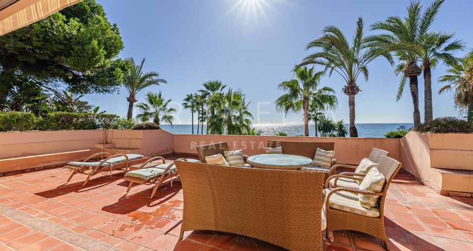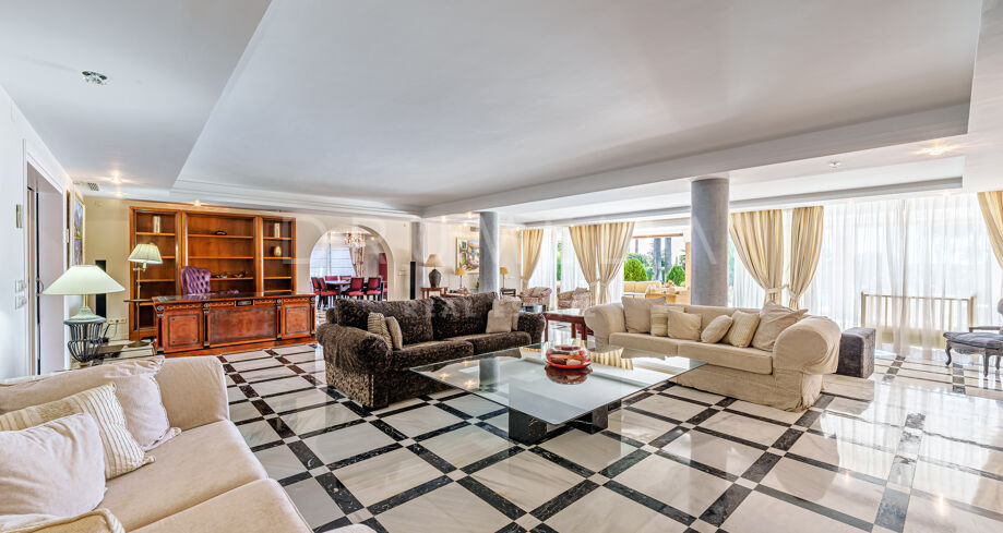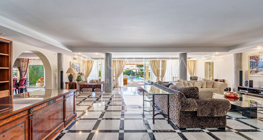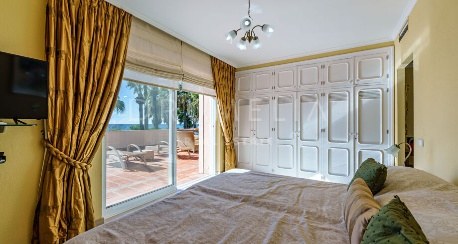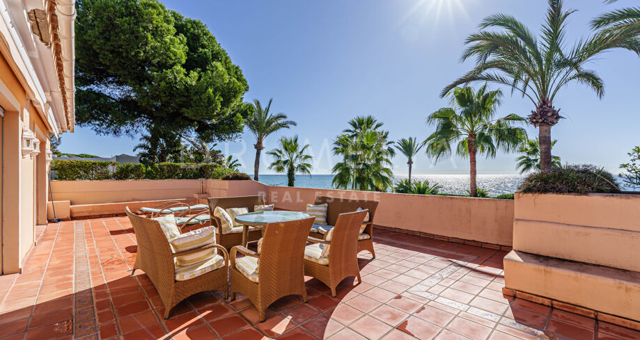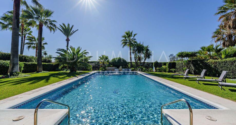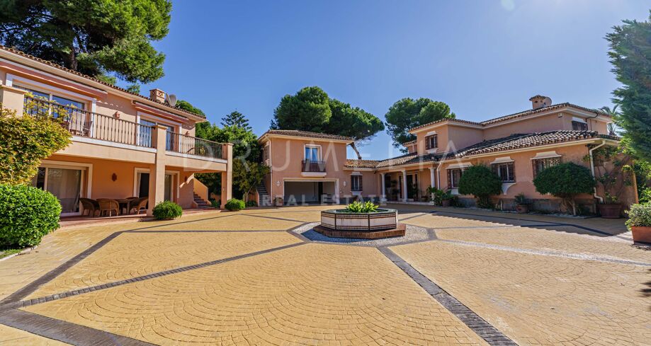 Dit luxe huis met 9 slaapkamers staat te koop aan de New Golden Mile in Estepona, een van de meest gewilde delen van de Costa del Sol. Deze woning heeft een werkelijk opmerkelijke ligging aan het strand met geweldig uitzicht op zee en directe toegang tot het strand via een privépoort. Het is allemaal dicht bij alle voorzieningen van de kustplaatsen Estepona en Marbella, het legendarische Puerto Banus, een reeks supermarkten en winkels, golfbanen, scholen, restaurants, bars en een verscheidenheid aan diensten aan de New Golden Mile. Het fantastische op het zuiden gelegen mediterrane object van 735 m² heeft een groot vlak privéterrein van 4.375 m², evenals een gastenverblijf, een aparte garage en een ruim appartement voor personeel.