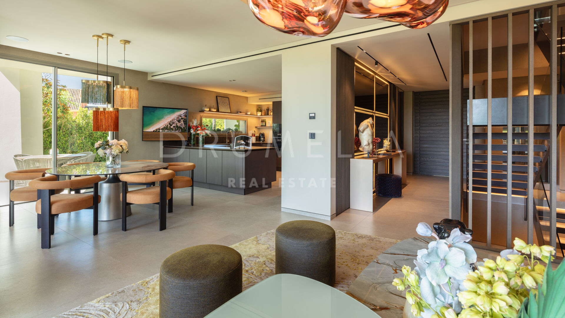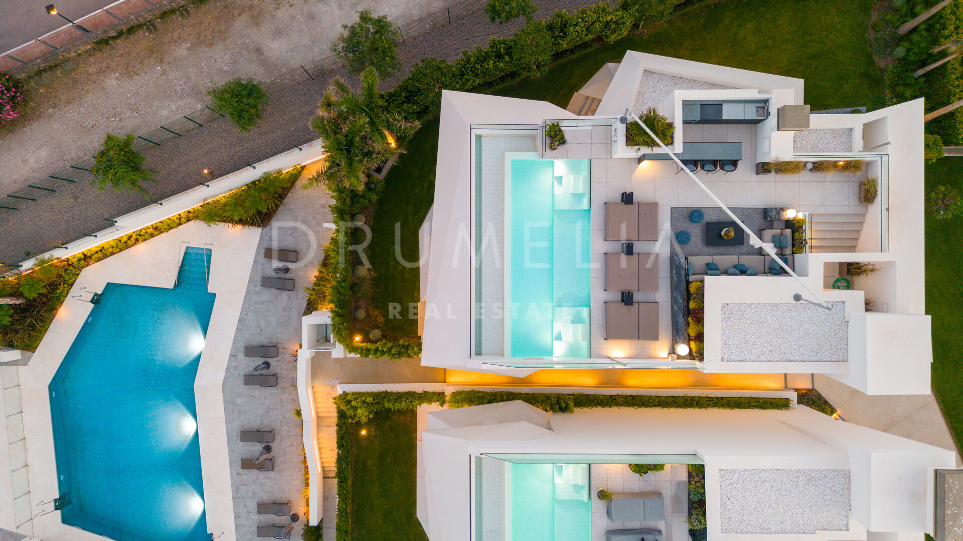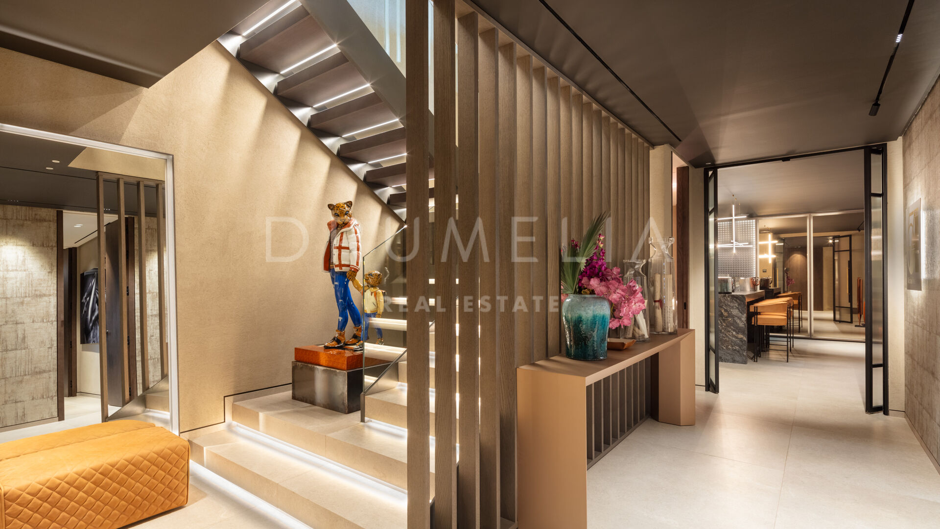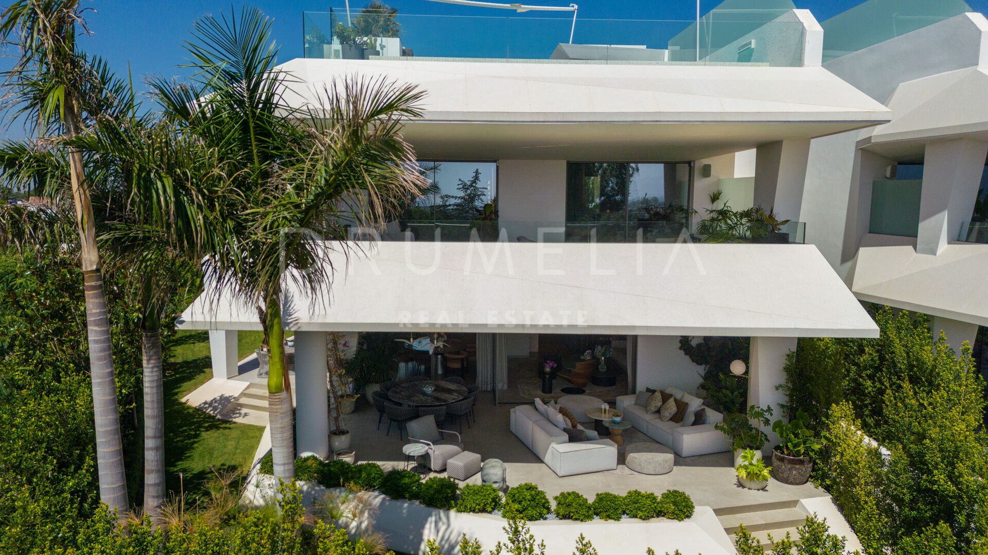 Dit prachtige nieuw gebouwde luxe huis met 4 slaapkamers wordt te koop aangeboden in Nueva Andalucia, Marbella. Het is gelegen in een exclusieve omheinde gemeenschap en maakt deel uit van een uniek project bestaande uit 11 prestigieuze villa’s met een fascinerende benadering van moderne architectuur. Deу hebben strakke lijnen, veel glas, gedurfde avant-garde kenmerken en een geometrische gevel die de aandacht trekt. De neutrale natuurlijke materialen die voor de buitenkant zijn gebruikt, voegen een vleugje elegantie toe. Het project wordt omringd door weelderig groen, golfbanen en hoogwaardige woningen in Nueva Andalucia. Het heeft een bevoorrechte locatie en biedt gemakkelijke toegang tot een breed scala aan lokale voorzieningen en diensten, waaronder supermarkten en winkels, restaurants, casino, banken, internationale scholen, zaterdagmarkt, enzovoort. Binnen enkele minuten bereik je de zandstranden met blauwe vlag van Puerto Banus en San Pedro, de Golden Mile van Marbella en het oude stadscentrum.