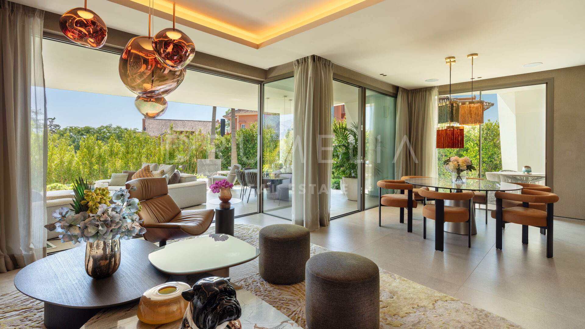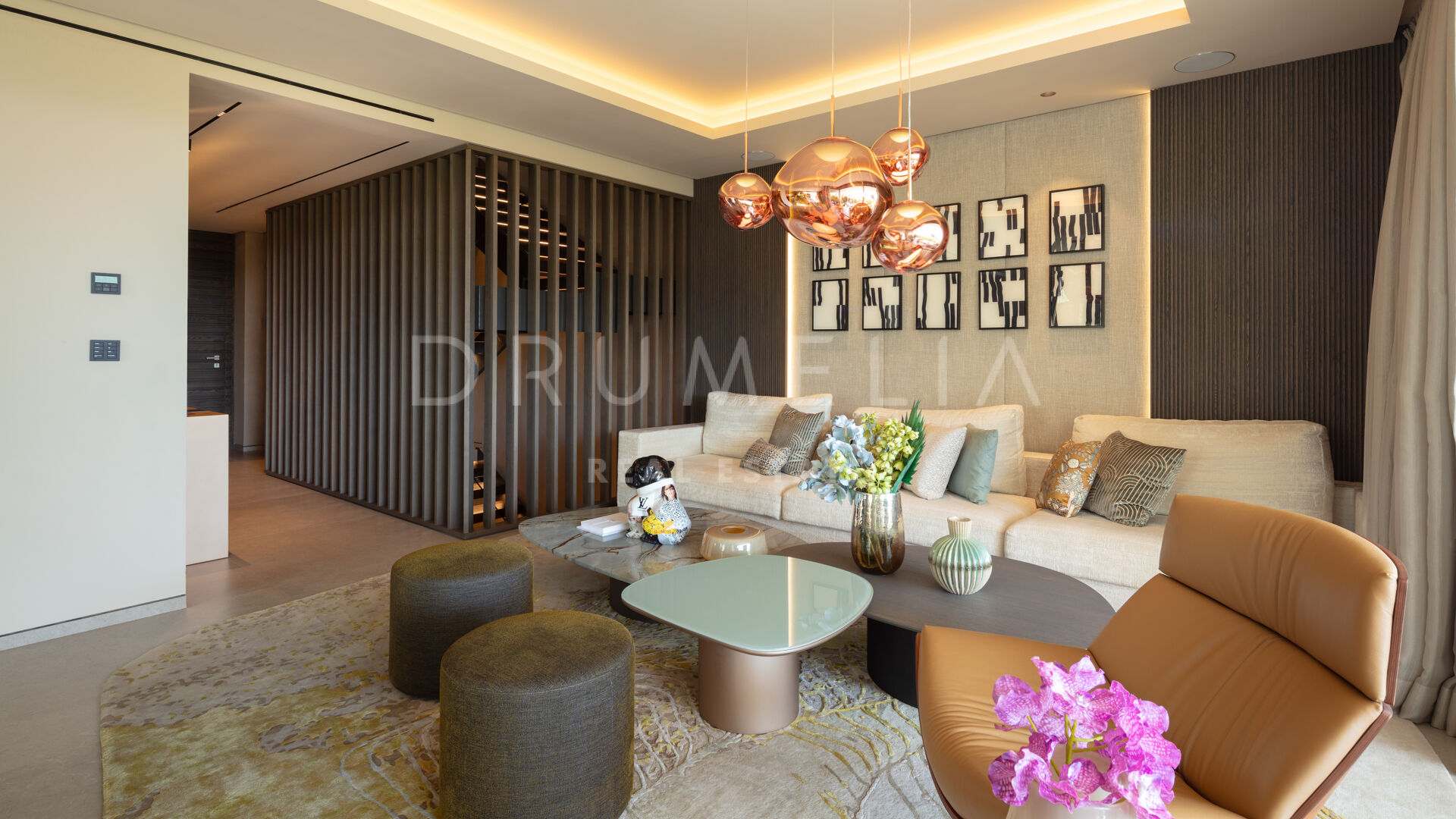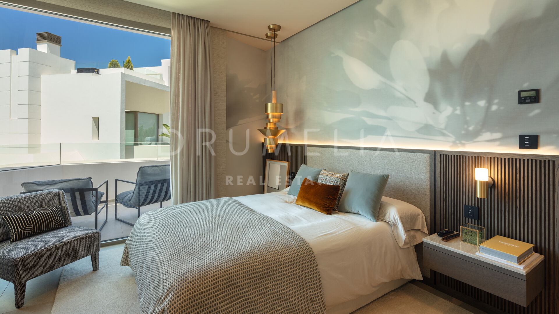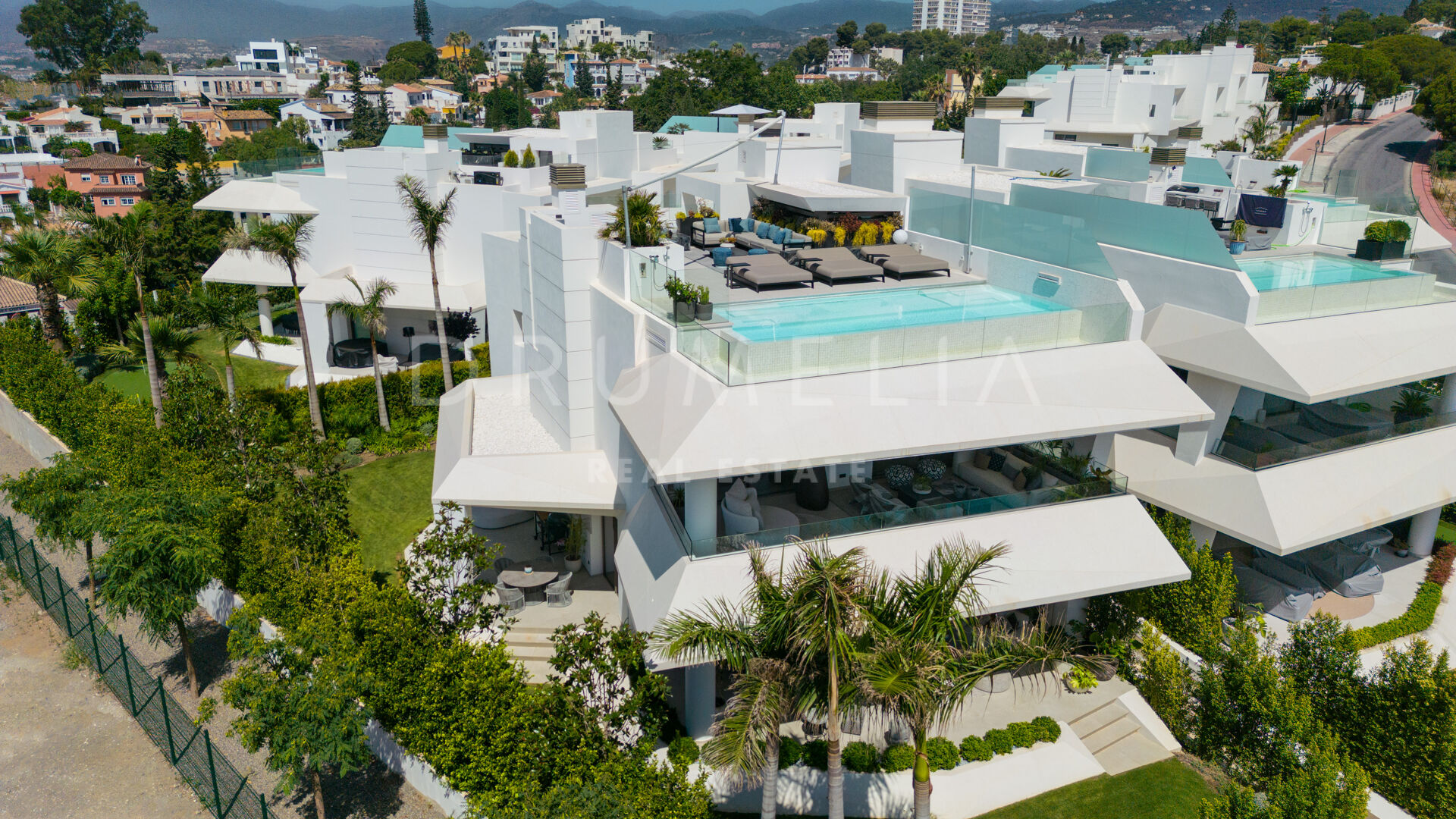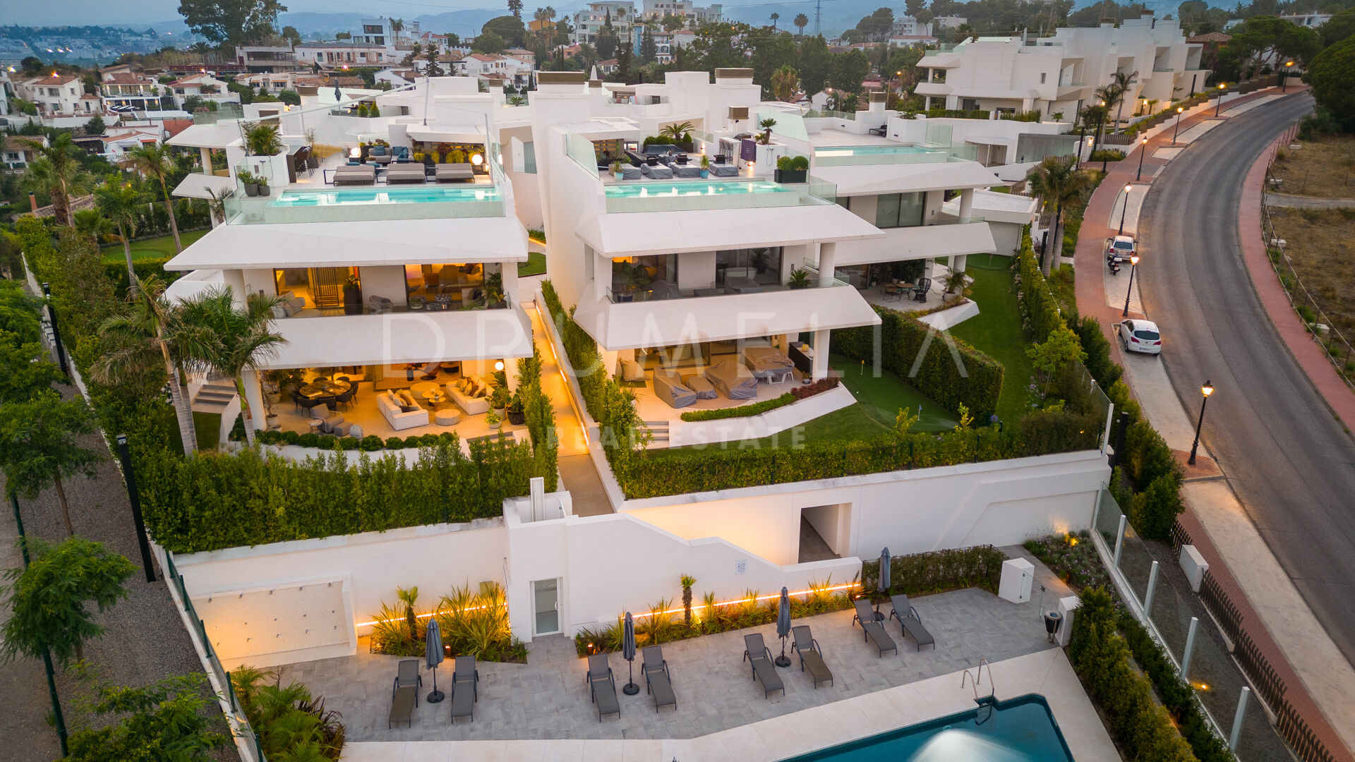 Dit prachtige nieuw gebouwde luxe huis met 4 slaapkamers wordt te koop aangeboden in Nueva Andalucia, Marbella. Het is gelegen in een exclusieve omheinde gemeenschap en maakt deel uit van een uniek project bestaande uit 11 prestigieuze villa’s met een fascinerende benadering van moderne architectuur. Deу hebben strakke lijnen, veel glas, gedurfde avant-garde kenmerken en een geometrische gevel die de aandacht trekt. De neutrale natuurlijke materialen die voor de buitenkant zijn gebruikt, voegen een vleugje elegantie toe. Het project wordt omringd door weelderig groen, golfbanen en hoogwaardige woningen in Nueva Andalucia. Het heeft een bevoorrechte locatie en biedt gemakkelijke toegang tot een breed scala aan lokale voorzieningen en diensten, waaronder supermarkten en winkels, restaurants, casino, banken, internationale scholen, zaterdagmarkt, enzovoort. Binnen enkele minuten bereik je de zandstranden met blauwe vlag van Puerto Banus en San Pedro, de Golden Mile van Marbella en het oude stadscentrum.