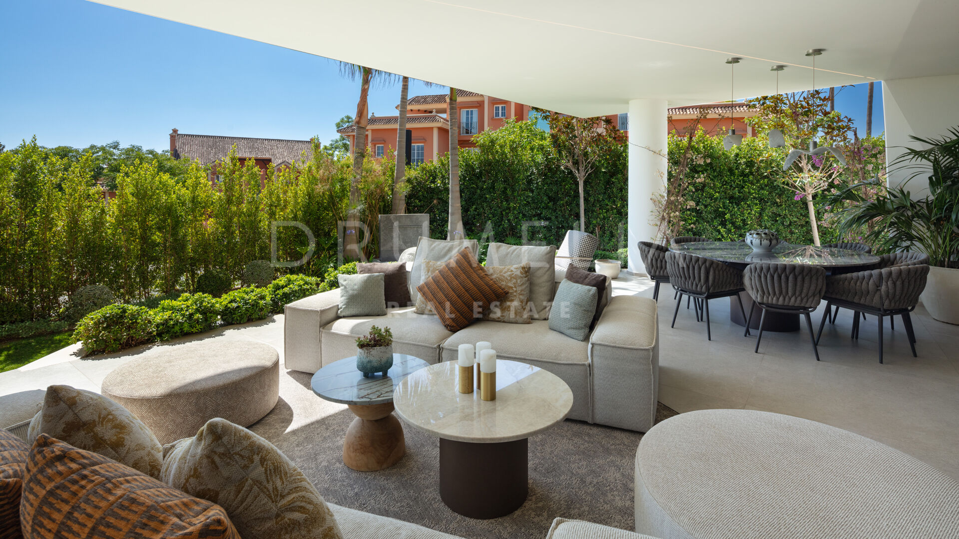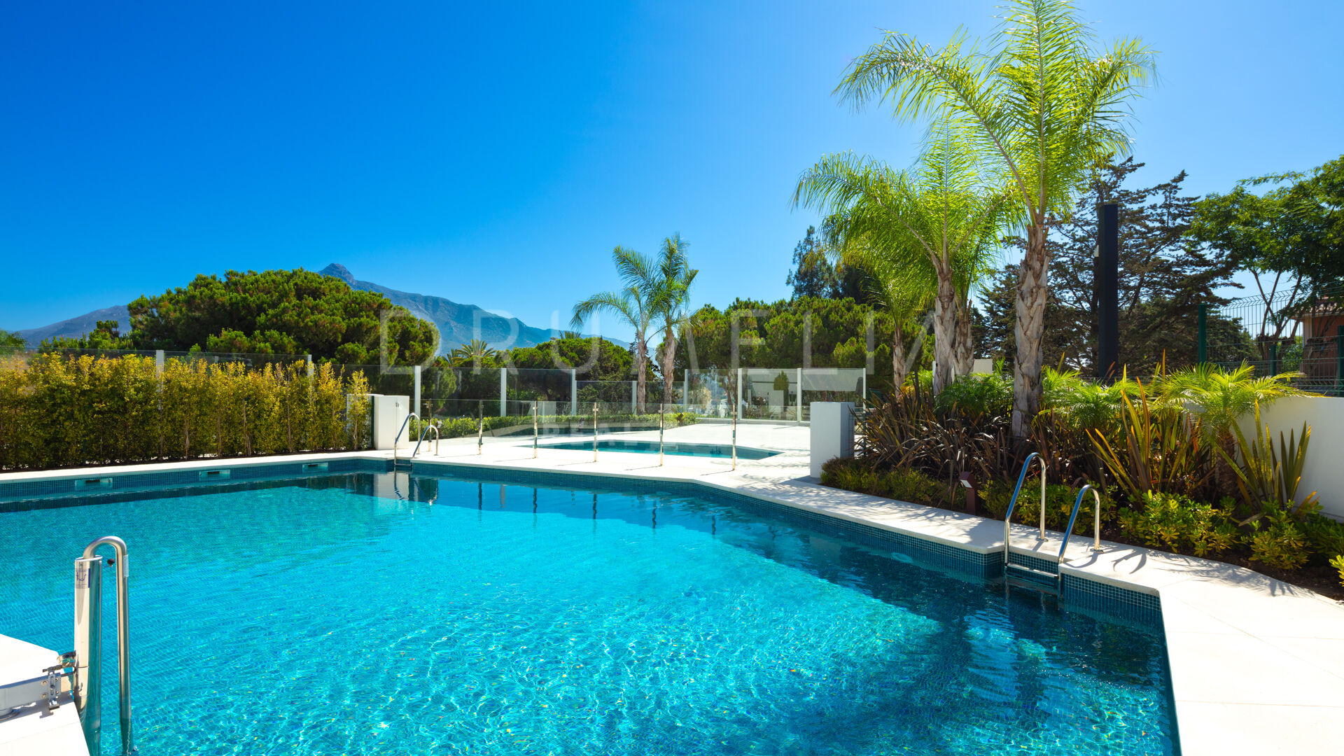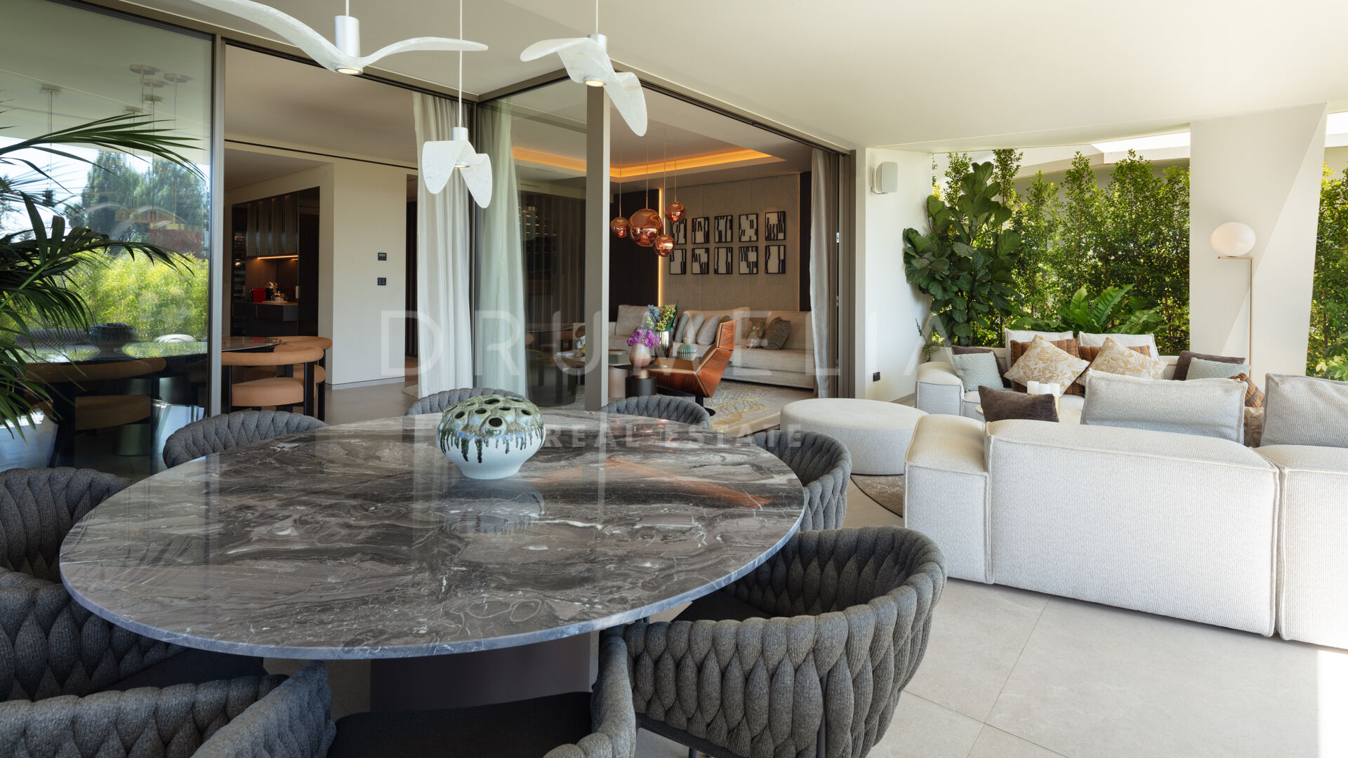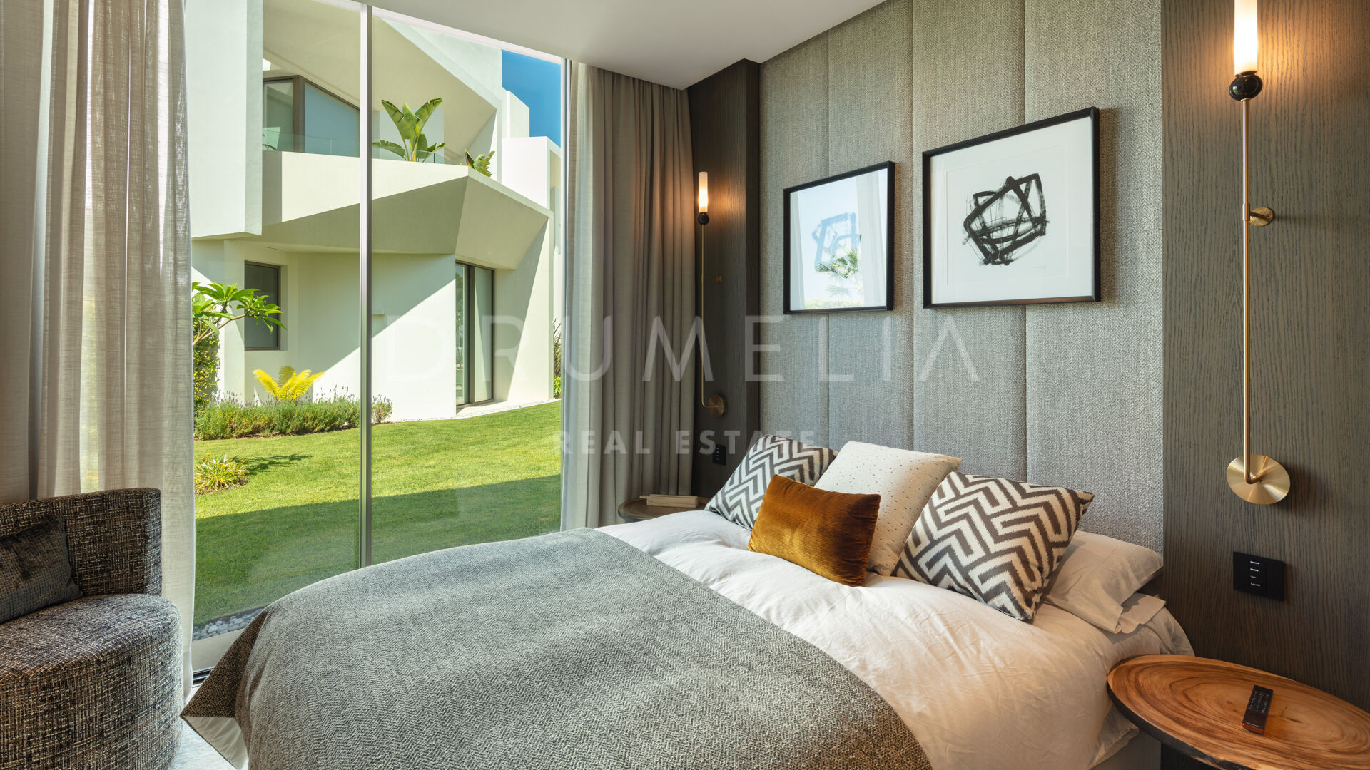 Dit prachtige nieuw gebouwde luxe huis met 4 slaapkamers wordt te koop aangeboden in Nueva Andalucia, Marbella. Het is gelegen in een exclusieve omheinde gemeenschap en maakt deel uit van een uniek project bestaande uit 11 prestigieuze villa’s met een fascinerende benadering van moderne architectuur. Deу hebben strakke lijnen, veel glas, gedurfde avant-garde kenmerken en een geometrische gevel die de aandacht trekt. De neutrale natuurlijke materialen die voor de buitenkant zijn gebruikt, voegen een vleugje elegantie toe. Het project wordt omringd door weelderig groen, golfbanen en hoogwaardige woningen in Nueva Andalucia. Het heeft een bevoorrechte locatie en biedt gemakkelijke toegang tot een breed scala aan lokale voorzieningen en diensten, waaronder supermarkten en winkels, restaurants, casino, banken, internationale scholen, zaterdagmarkt, enzovoort. Binnen enkele minuten bereik je de zandstranden met blauwe vlag van Puerto Banus en San Pedro, de Golden Mile van Marbella en het oude stadscentrum.