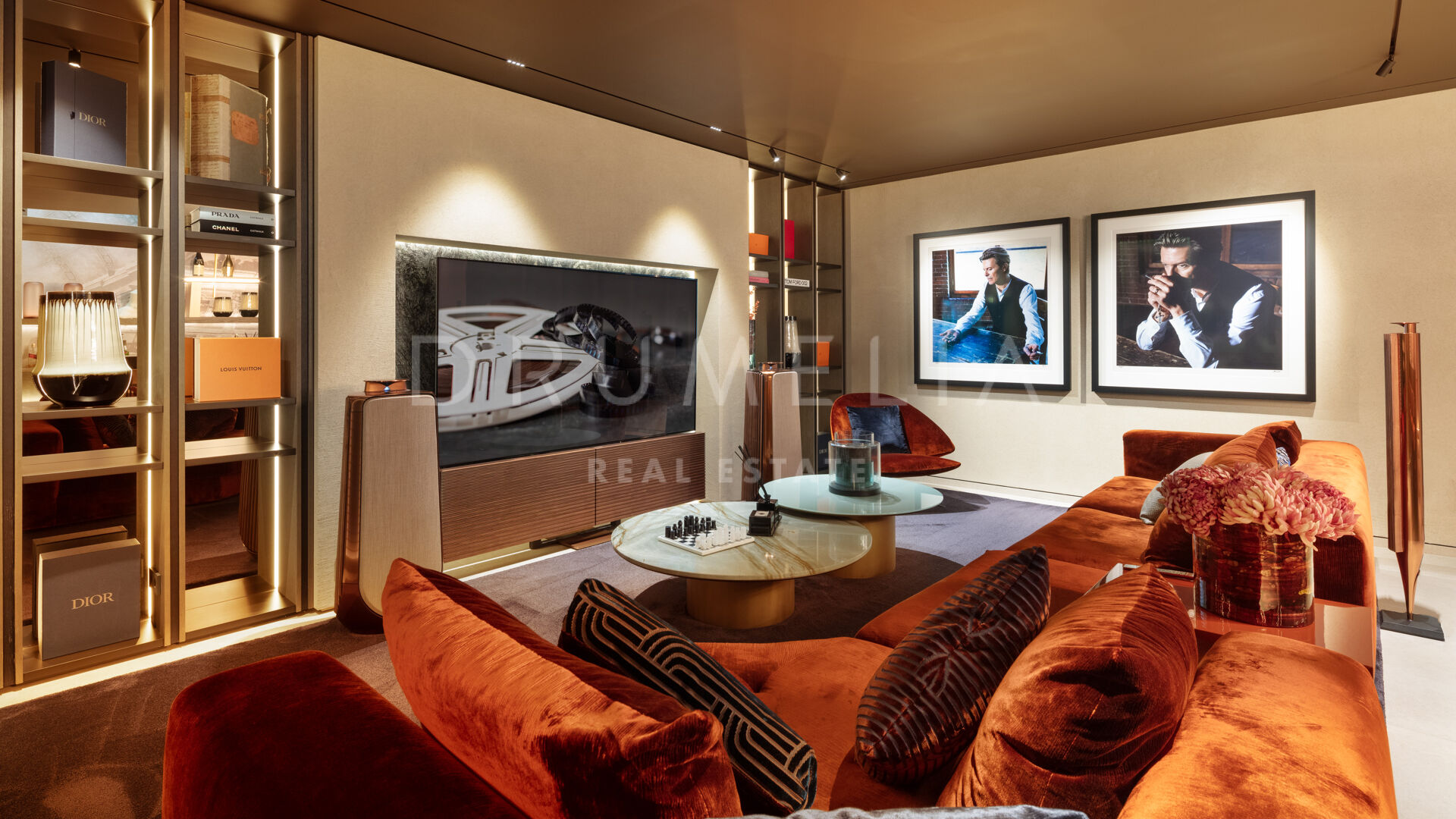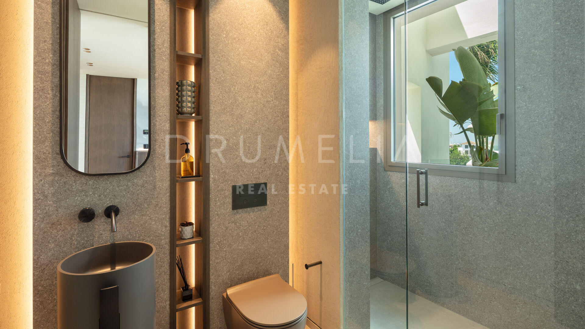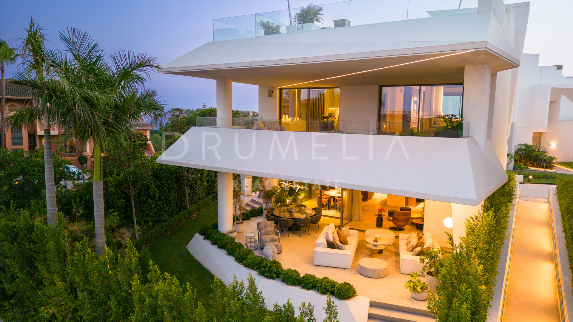 Het fantastische gloednieuwe eco-vriendelijke huis wordt te koop aangeboden volledig gemeubileerd volgens de hoogste normen en helemaal up-to-date met de nieuwste technologieën. Een lift, airconditioning, open haarden in moderne stijl, geraffineerd plafond- en verlichtingsontwerp, een uniek vrijstaand bad, prachtige accentmuren, vloerverwarming, alles voegt een vleugje high-end comfort toe. De woning heeft een kelder, bijkeuken, berging en wasruimte, een gastentoilet en een privégarage met ruimte voor 2 auto’s. De 24-uurs bewakingsdienst in de omheinde gemeenschap, het alarm, de beveiliging en de video-ingang geven je gemoedsrust. Met zijn indrukwekkende architectuur, privacy, voorzieningen, uitzicht en gunstige omgeving vertegenwoordigt dit nieuwe luxe object in Nueva Andalucia de belichaming van het 21e-eeuwse luxeleven in Marbella.