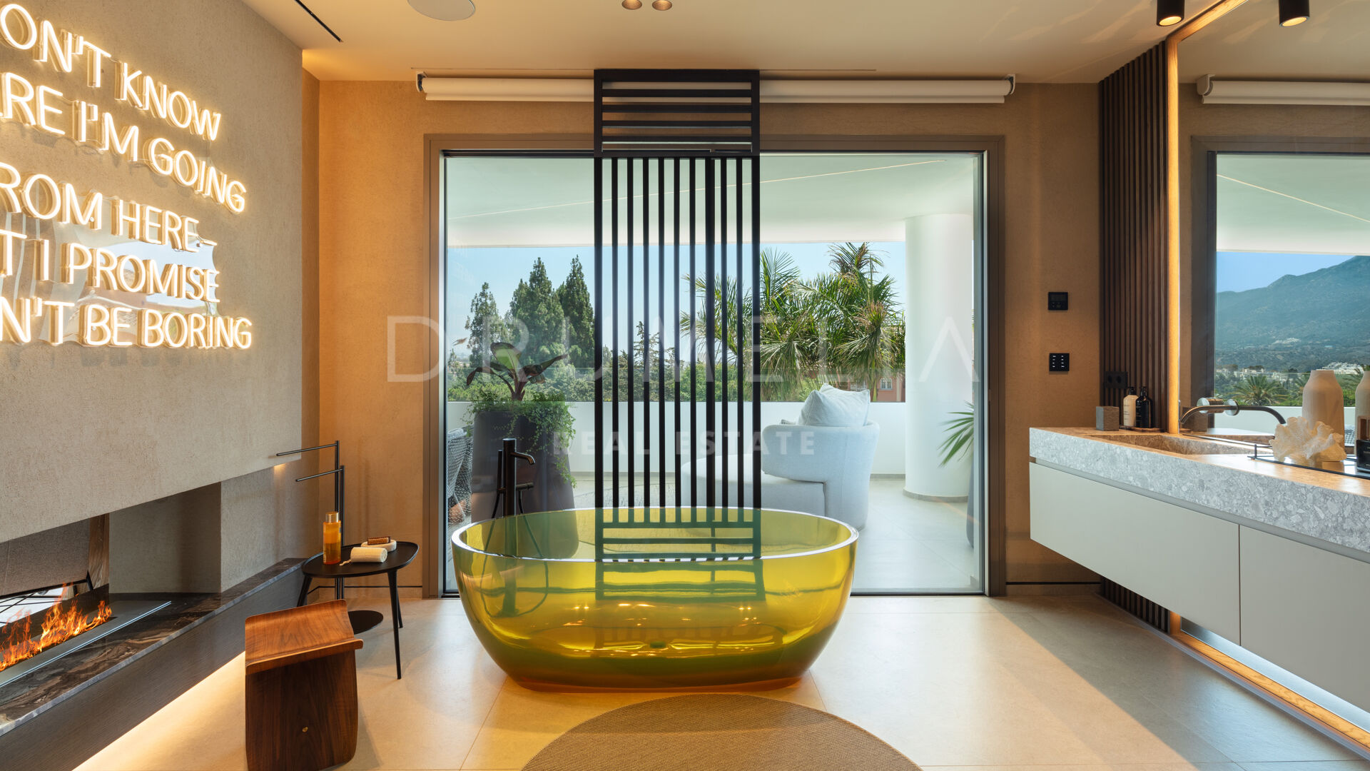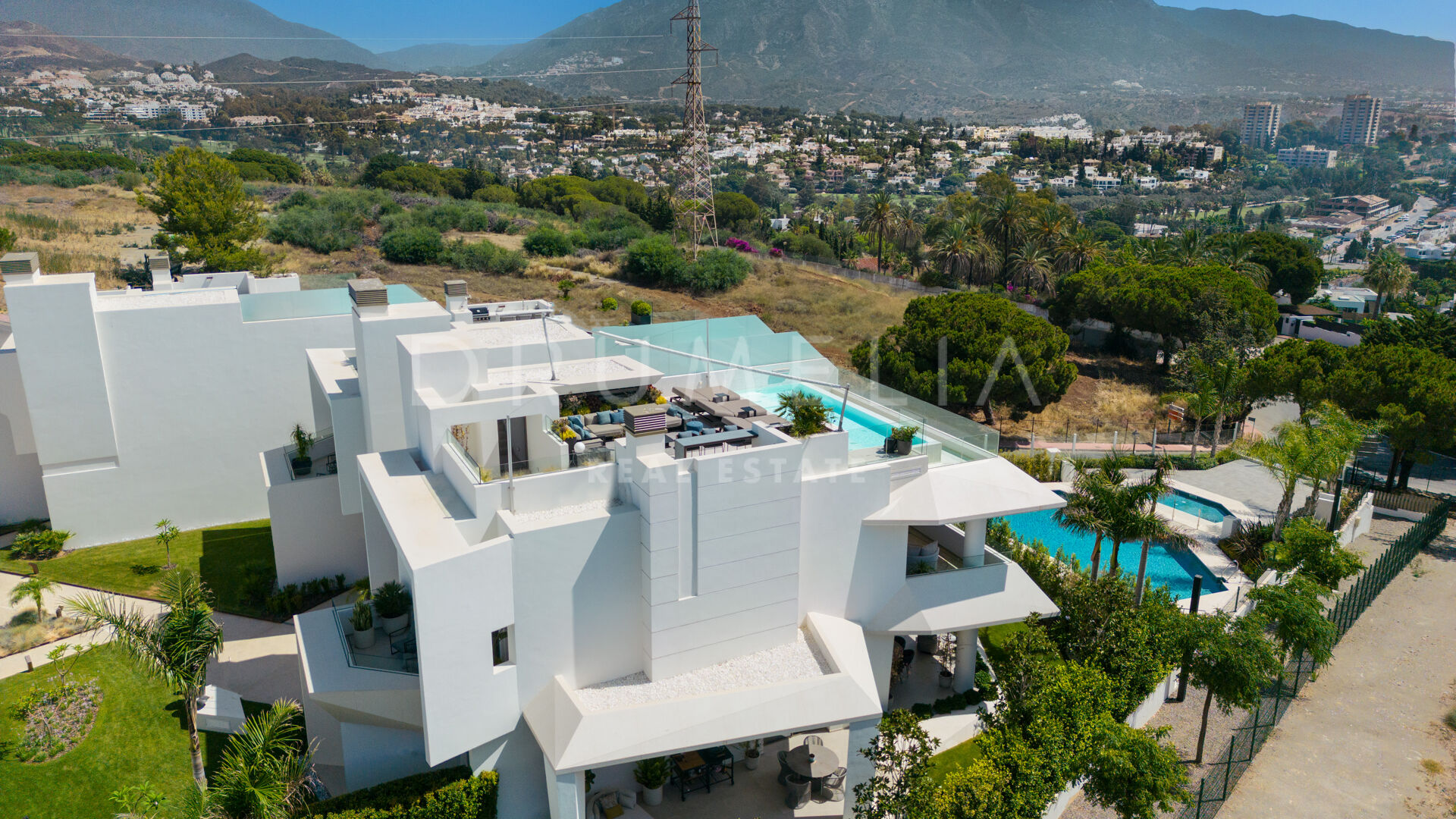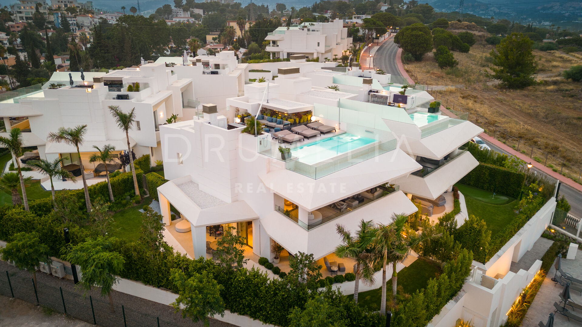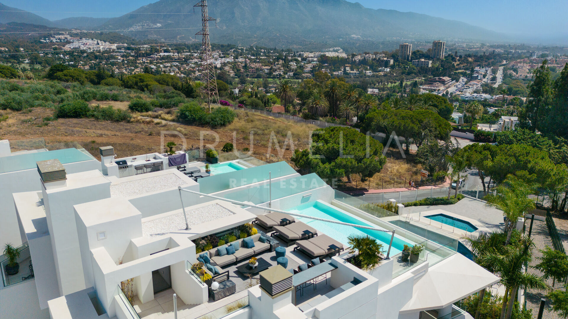 Het spectaculaire huis in eigentijdse stijl van 489 m² biedt een ongeëvenaarde woonervaring. Met zijn zuid/westelijke oriëntatie is het gezegend met overvloedig licht en zon gedurende de dag, en zorgt het voor adembenemende zonsondergangen en prachtig uitzicht op zee en de bergen. Verspreid over 4 verdiepingen beschikt dit uitzonderlijke pand over 4 slaapkamersuites, elk met een eigen moderne luxe badkamer. Een ruime open woonkamer heeft een elegante zitkamer, een eethoek en een strakke, minimalistische ultramoderne keuken met een eiland en de nieuwste apparatuur. De glazen deuren leiden naar het terras en het zwembad. Het huis beschikt over 222 m² zonnige en overdekte terrassen met eet-, barbecue- en ontspanningsruimtes in de buitenlucht, zodat je het hele jaar door van het buitenleven kunt genieten. Het op maat gemaakte solarium biedt het meest indrukwekkende panoramische uitzicht op de beeldschone omgeving van Nueva Andalucia, de berg La Concha, de Middellandse Zee en Gibraltar. Een privézwembad maakt het plaatje compleet.