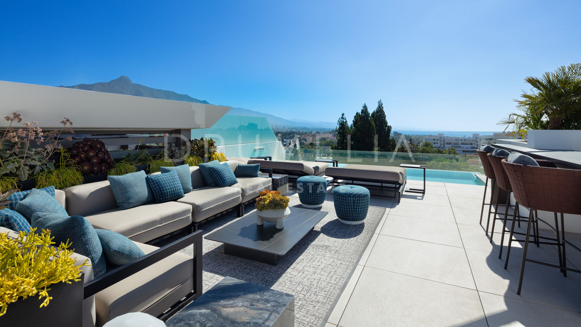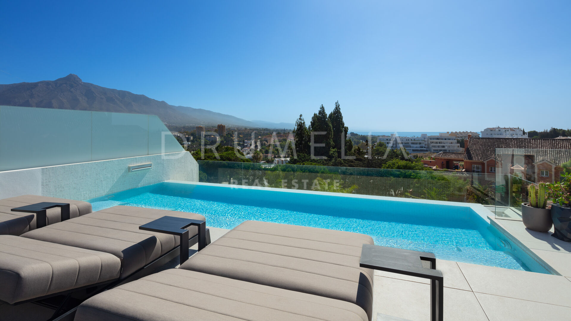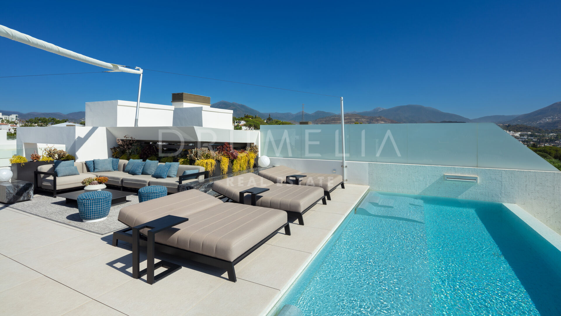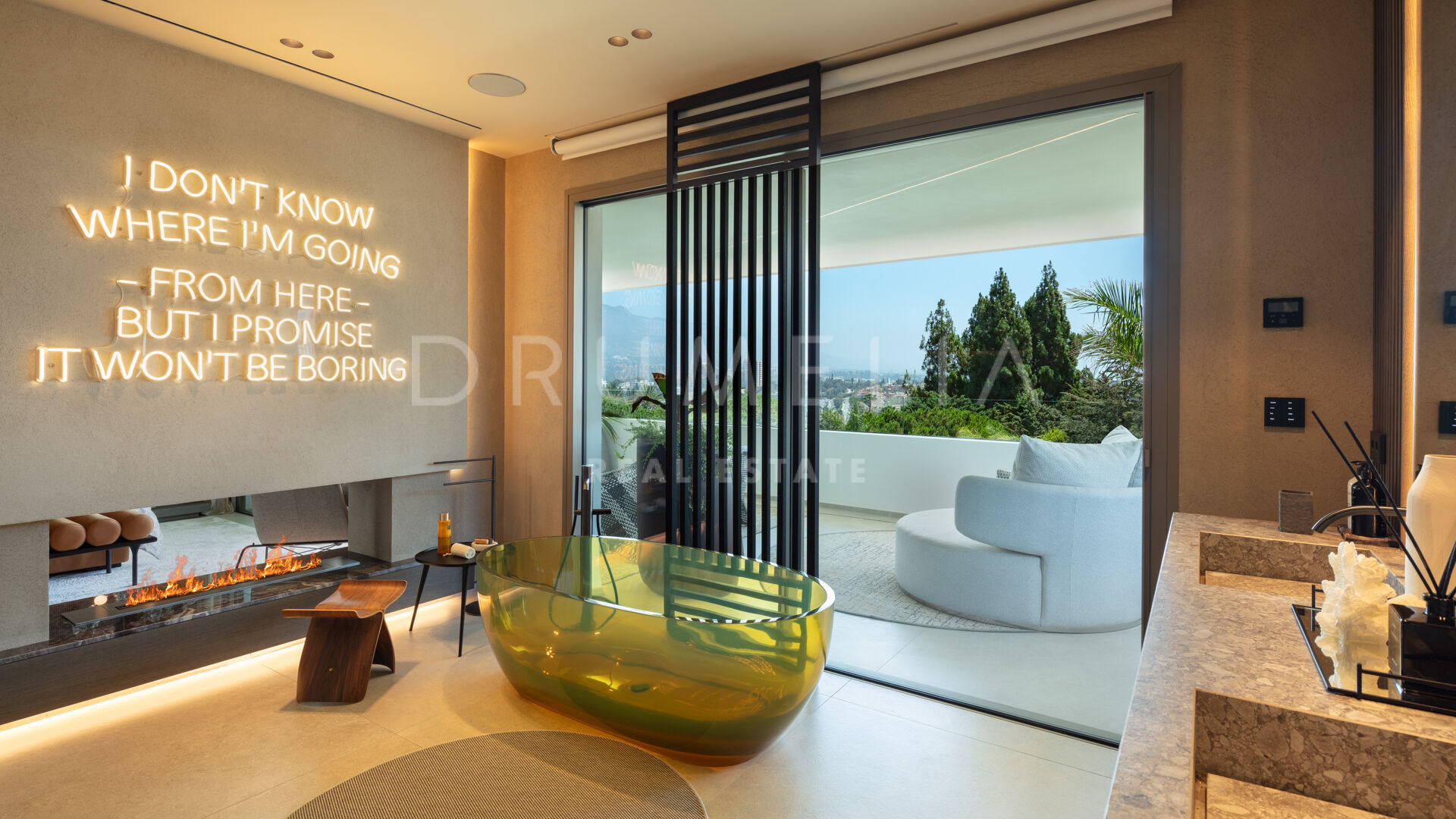 Het spectaculaire huis in eigentijdse stijl van 489 m² biedt een ongeëvenaarde woonervaring. Met zijn zuid/westelijke oriëntatie is het gezegend met overvloedig licht en zon gedurende de dag, en zorgt het voor adembenemende zonsondergangen en prachtig uitzicht op zee en de bergen. Verspreid over 4 verdiepingen beschikt dit uitzonderlijke pand over 4 slaapkamersuites, elk met een eigen moderne luxe badkamer. Een ruime open woonkamer heeft een elegante zitkamer, een eethoek en een strakke, minimalistische ultramoderne keuken met een eiland en de nieuwste apparatuur. De glazen deuren leiden naar het terras en het zwembad. Het huis beschikt over 222 m² zonnige en overdekte terrassen met eet-, barbecue- en ontspanningsruimtes in de buitenlucht, zodat je het hele jaar door van het buitenleven kunt genieten. Het op maat gemaakte solarium biedt het meest indrukwekkende panoramische uitzicht op de beeldschone omgeving van Nueva Andalucia, de berg La Concha, de Middellandse Zee en Gibraltar. Een privézwembad maakt het plaatje compleet.