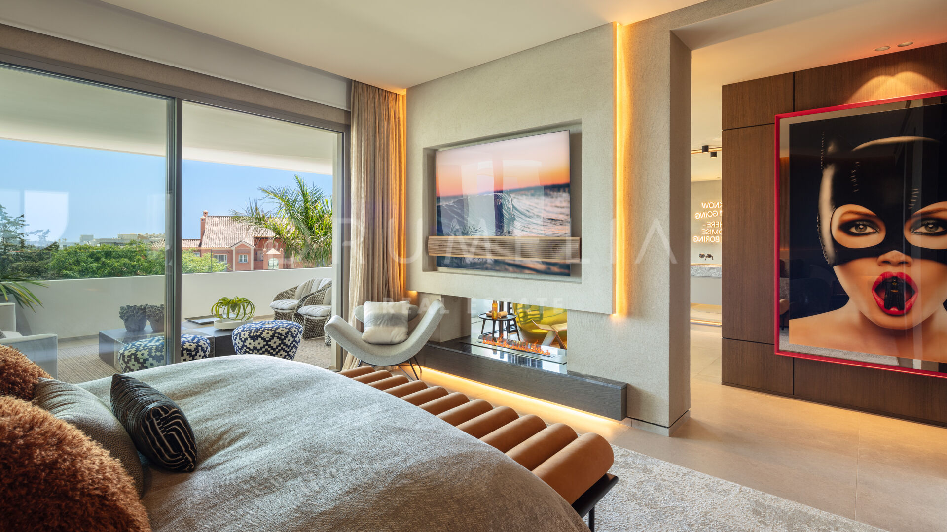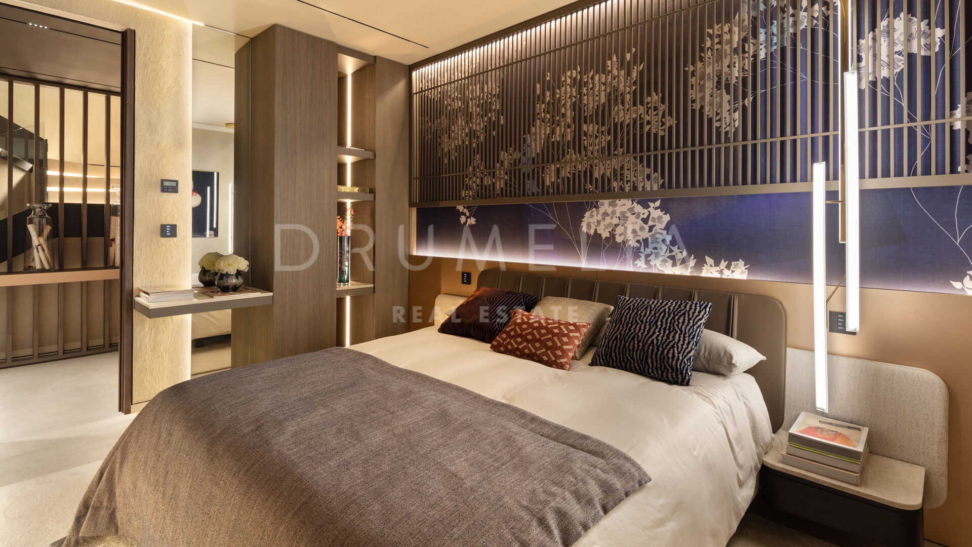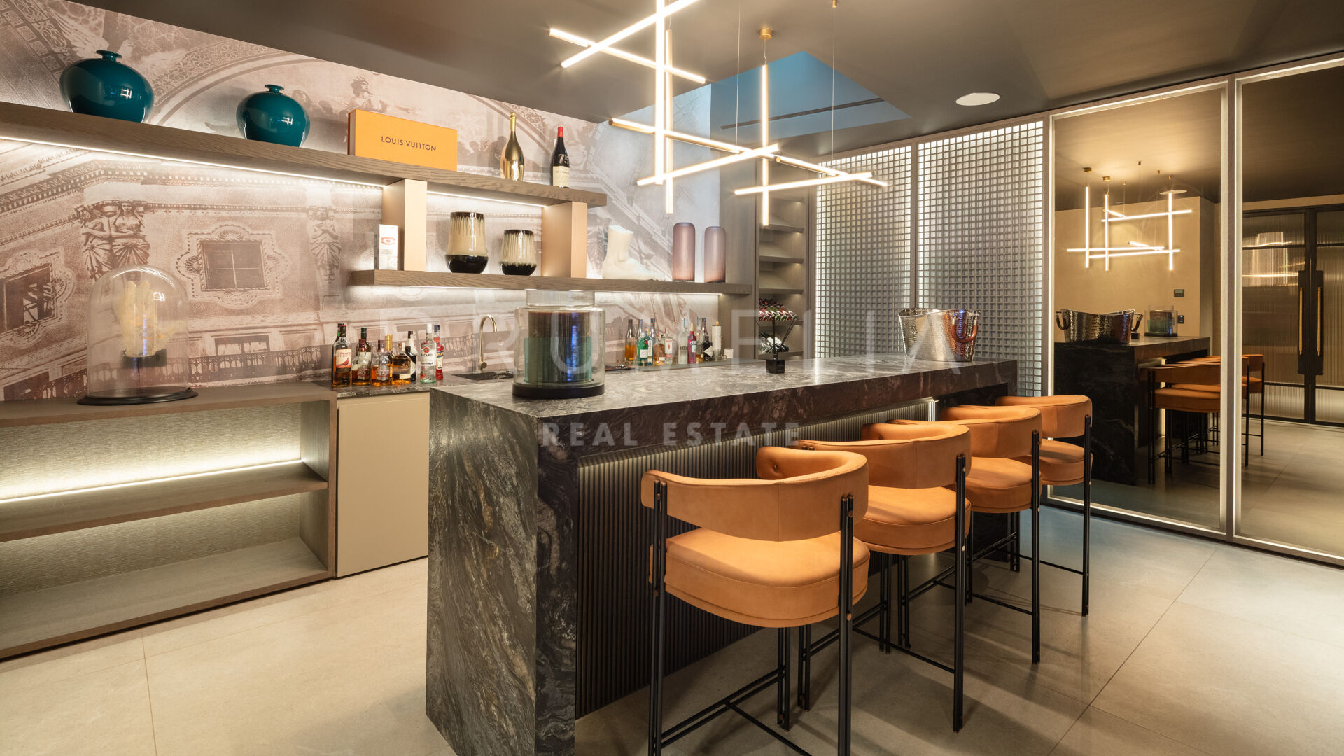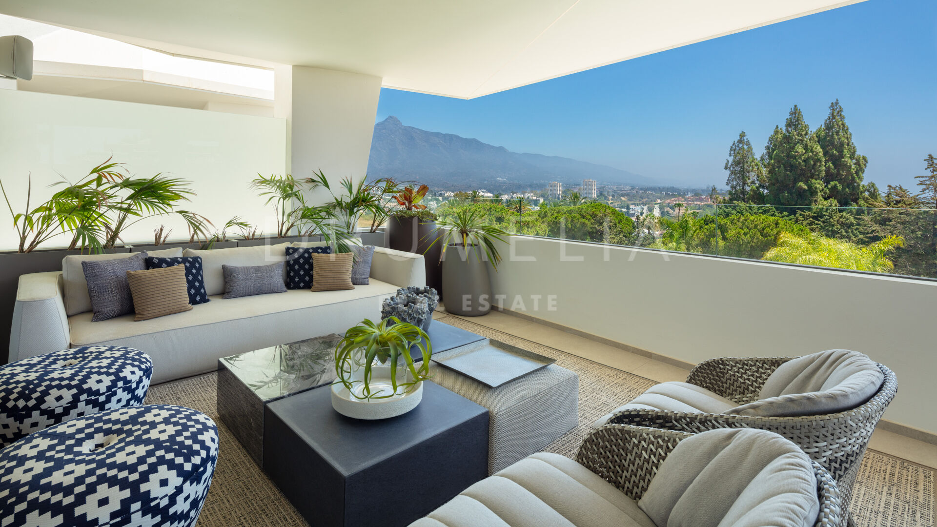 Het spectaculaire huis in eigentijdse stijl van 489 m² biedt een ongeëvenaarde woonervaring. Met zijn zuid/westelijke oriëntatie is het gezegend met overvloedig licht en zon gedurende de dag, en zorgt het voor adembenemende zonsondergangen en prachtig uitzicht op zee en de bergen. Verspreid over 4 verdiepingen beschikt dit uitzonderlijke pand over 4 slaapkamersuites, elk met een eigen moderne luxe badkamer. Een ruime open woonkamer heeft een elegante zitkamer, een eethoek en een strakke, minimalistische ultramoderne keuken met een eiland en de nieuwste apparatuur. De glazen deuren leiden naar het terras en het zwembad. Het huis beschikt over 222 m² zonnige en overdekte terrassen met eet-, barbecue- en ontspanningsruimtes in de buitenlucht, zodat je het hele jaar door van het buitenleven kunt genieten. Het op maat gemaakte solarium biedt het meest indrukwekkende panoramische uitzicht op de beeldschone omgeving van Nueva Andalucia, de berg La Concha, de Middellandse Zee en Gibraltar. Een privézwembad maakt het plaatje compleet.