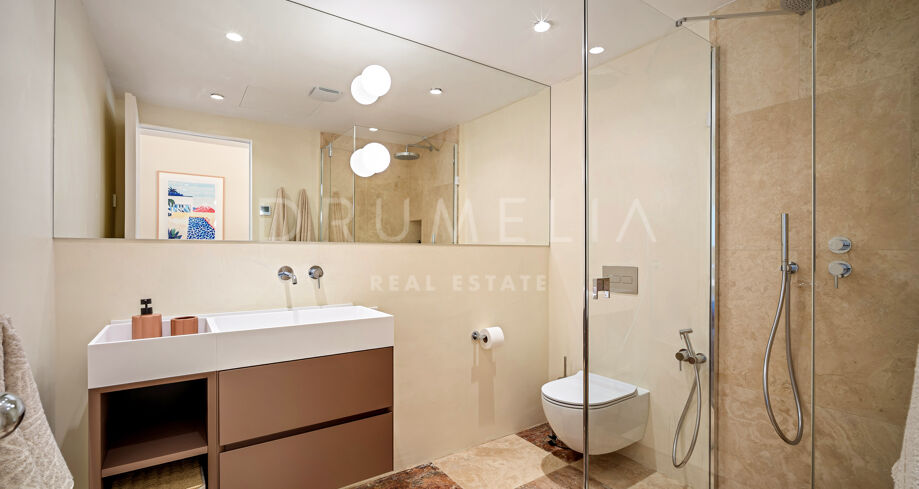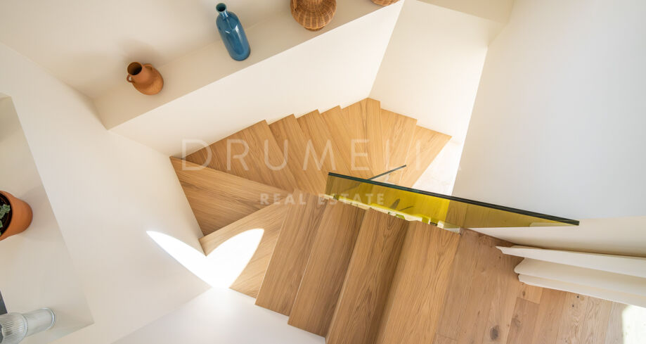 Binnen straalt het interieur warmte en verfijning uit, met een modern ontwerp en rijke houten accenten. De open keuken en eetruimte vloeien naadloos in elkaar over, met hoogwaardige apparatuur voor kookliefhebbers. De woonruimte is al even indrukwekkend, met een adembenemend uitzicht op de La Concha-berg en directe toegang tot een intieme chill-outzone – een ideale plek om tot rust te komen. Elk detail is zorgvuldig gekozen om een gastvrije sfeer te creëren, waardoor dit een perfecte plek is om te wonen en te ontvangen.