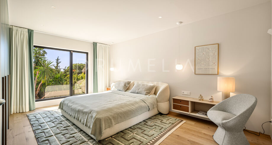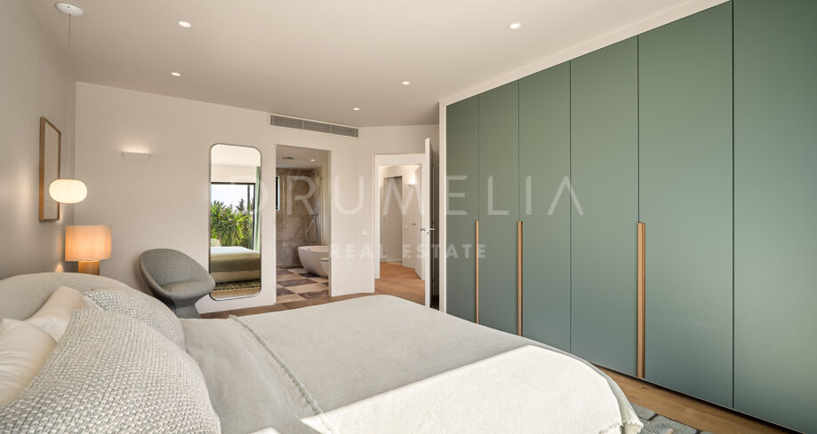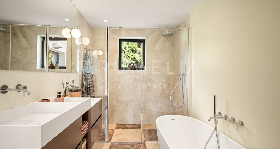 De hoofdslaapkamer is een waar toevluchtsoord, met grote ramen die het licht binnenlaten en uitzicht bieden op de prachtige tuin. De en-suite badkamer is even luxueus en ontworpen als een privé-oase van comfort. Een privéoprit leidt naar een overdekte parkeerplaats voor extra gemak en veiligheid. Strategisch gelegen in Nueva Andalucía biedt dit huis de perfecte balans tussen exclusiviteit en bereikbaarheid, en belichaamt het de essentie van modern mediterraan wonen.