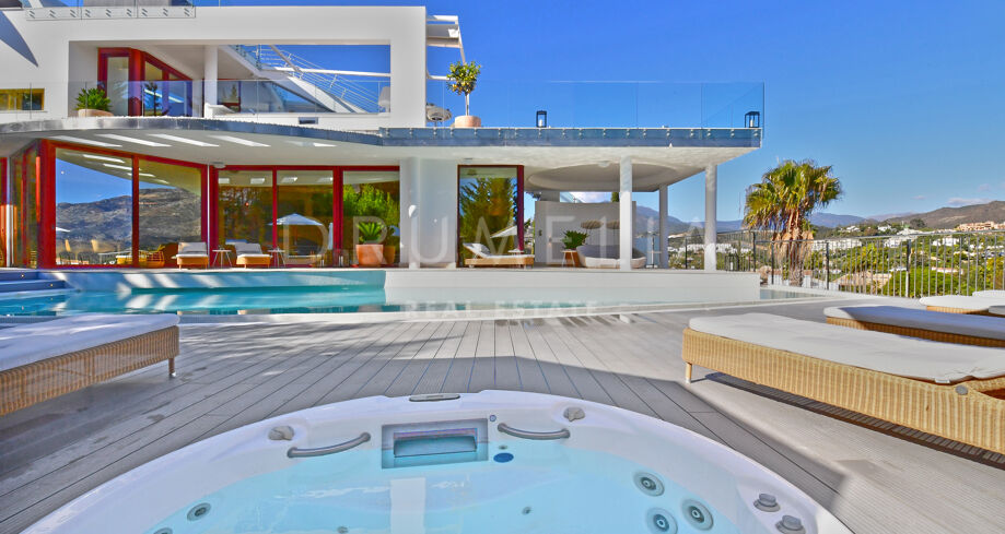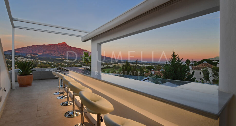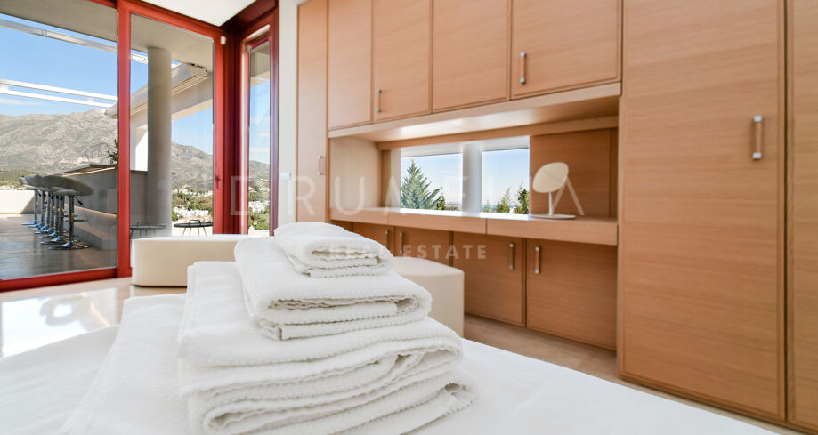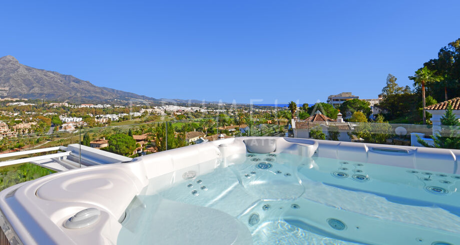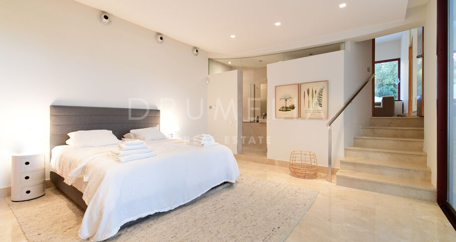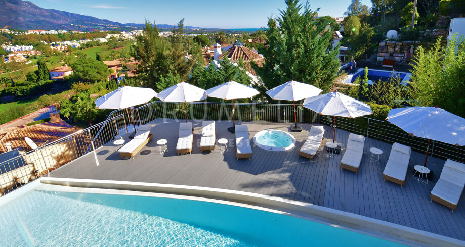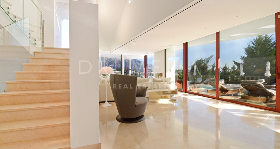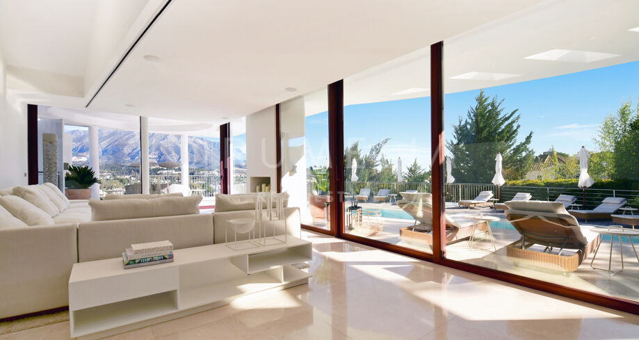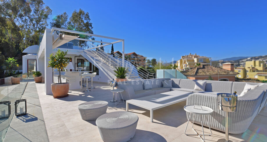 De pas gerenoveerde villa is verdeeld over 3 verdiepingen, waarbij zorgvuldig is nagedacht over de verdeling om het licht en het prachtige uitzicht over de Middellandse Zee, de berg La Concha en de golfbaan Las Brisas te maximaliseren.