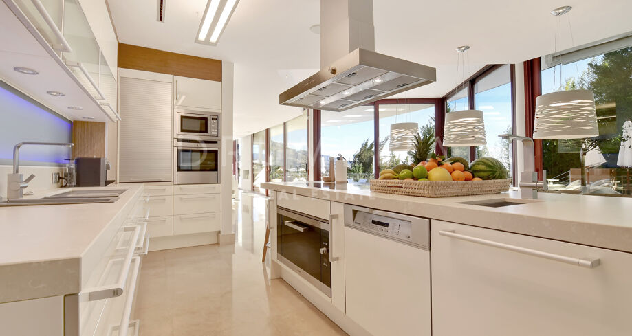 Eco-vriendelijke, energie-efficiënte villa beloont haar eigenaren met hedendaagse cutting-edge technologie en design. Verfijnde decoratie, externe en interne verlichting met de nieuwste energiebesparende LED-technologie, surround sound luidsprekers, diverse top-rated koelkasten / vriezers, speciale wijnkoeler en ijsblokjesmachine, vloer tot plafond glazen deuren, glazen dak om te dineren onder de sterren, uitstekende marmer en natuursteen, mooie beperkte kleurenpalet, kingsize bedden – alles is zeer exclusief, elegant, “de nieuwste of grootste” – en comfortabel ook! Opmerkelijk designmeubilair (met een flink prijskaartje van 300.000 euro) straalt ware moderne chic uit. Spectaculaire panoramische uitzichten en prachtige zonsondergangen kunnen worden genoten vanuit luxe 8-persoons jacuzzi op het bovenste terras. Een buitenruimte voor amusement is een fantastische toevoeging en herbergt een groot verwarmd overloopzwembad met chique houten dek, solarium, 5-persoons jacuzzi, overdekte bar, buiten fitnessruimte en lounge, ruime gebieden ideaal voor BBQ en al fresco dineren.