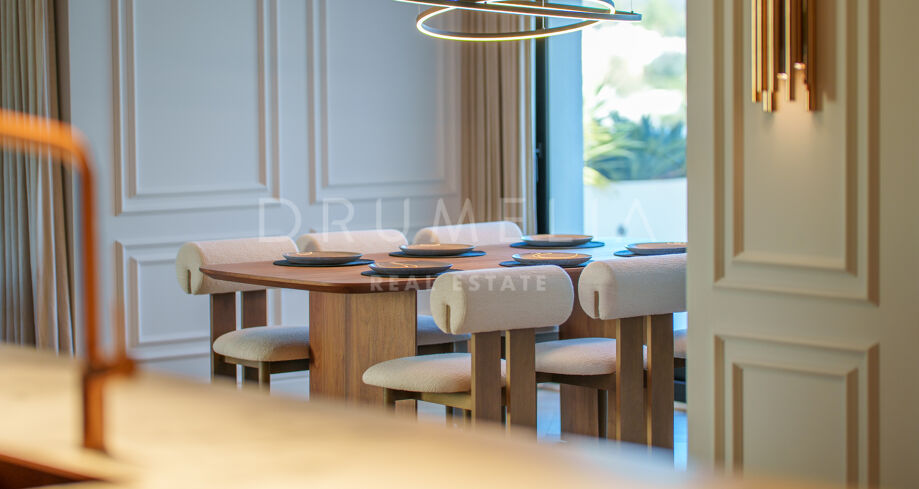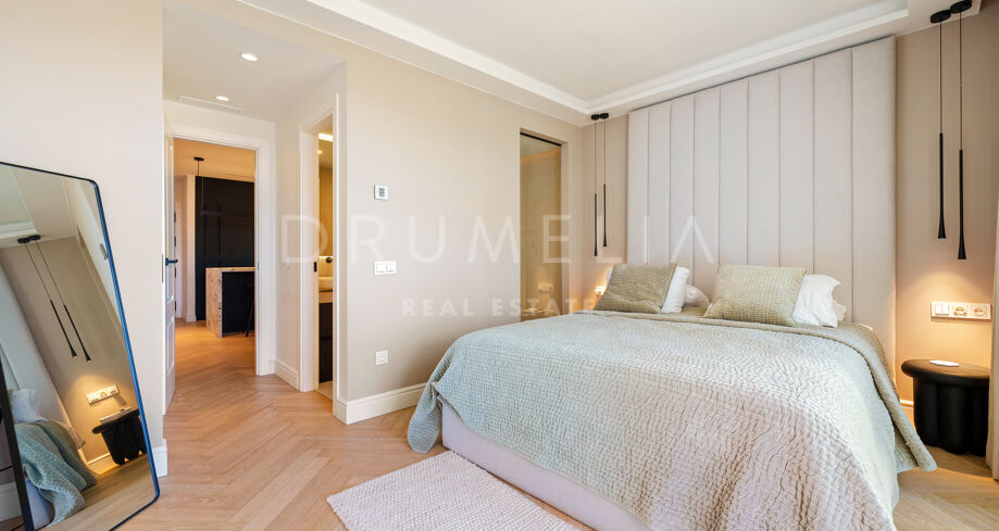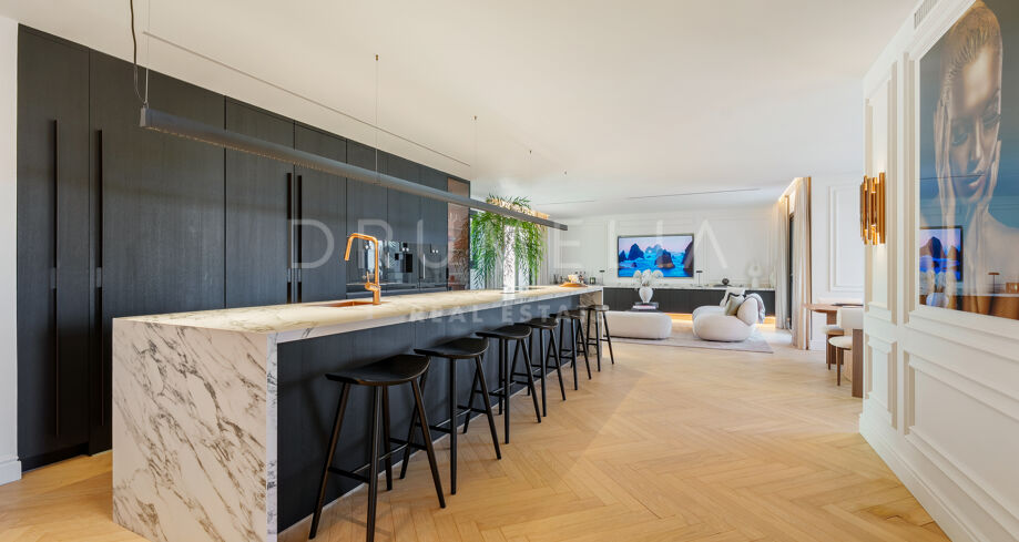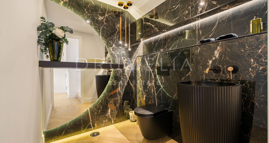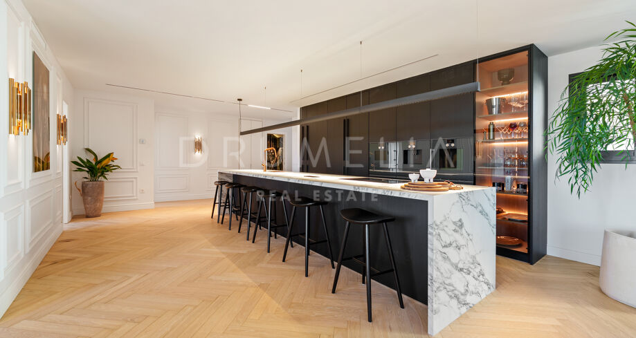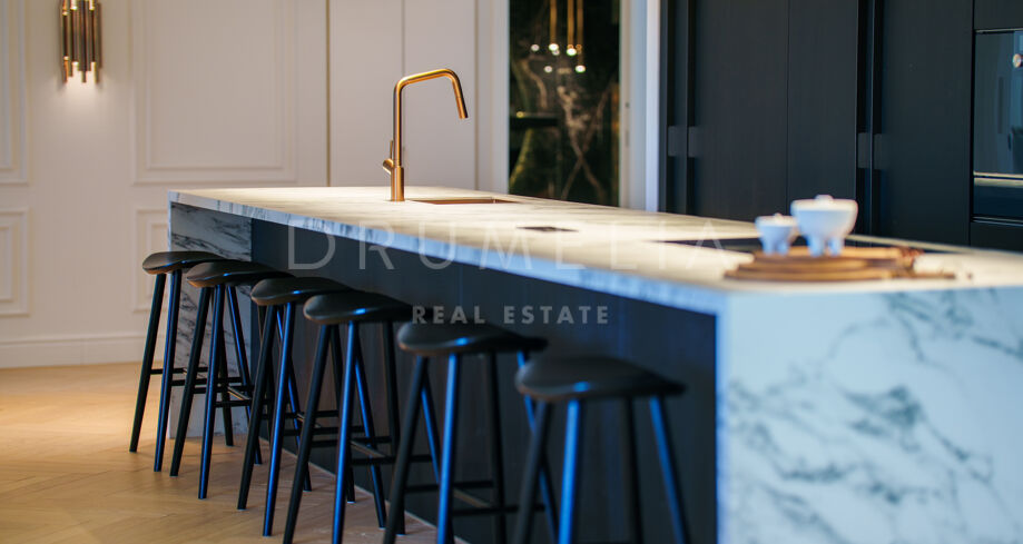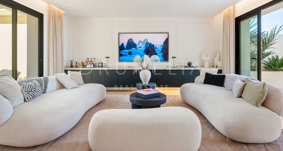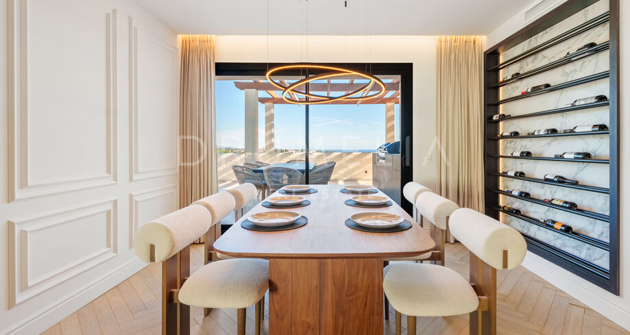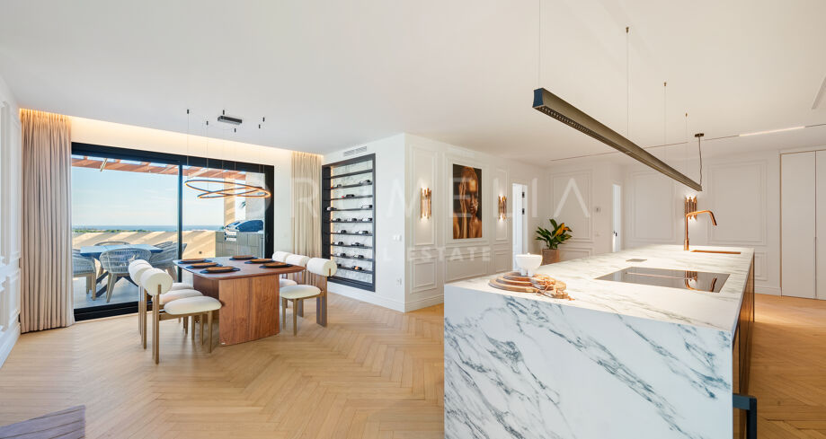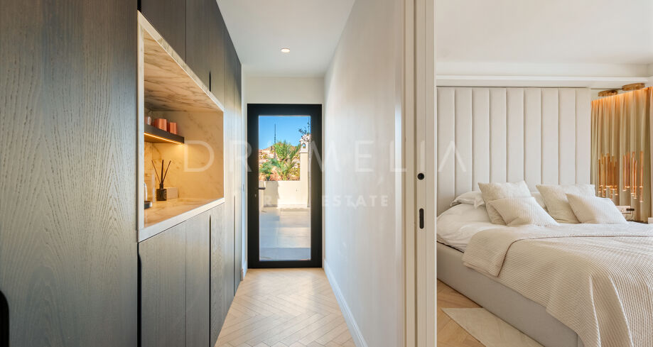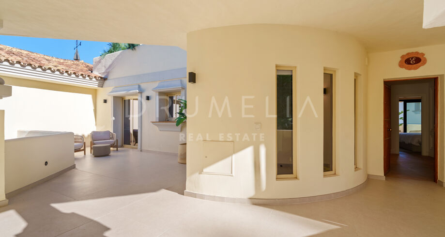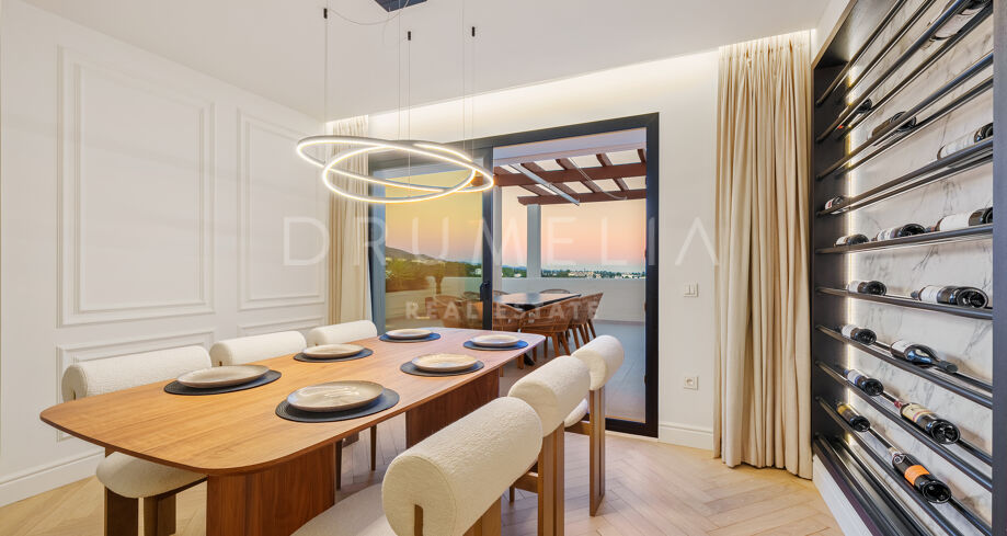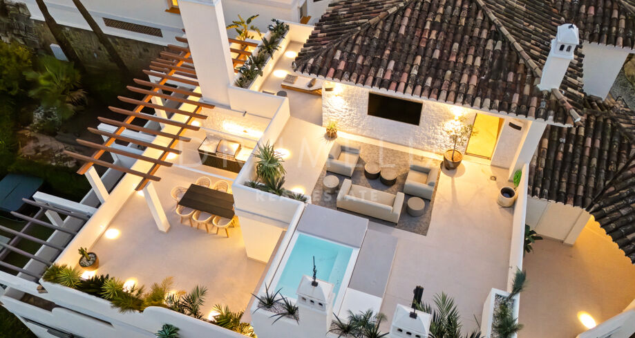 Dit uitzonderlijke duplex penthouse, exclusief op de markt gebracht, is gelegen in het prestigieuze complex Palacetes de los Belvederes in Nueva Andalucía, Marbella. De woning is onlangs gerenoveerd en combineert harmonieus een eigentijds design met een verfijnde Scandinavische esthetiek, wat resulteert in een stijlvolle en uitnodigende sfeer. Met een bebouwde oppervlakte van 183 m² en ruime terrassen van in totaal 181 m² biedt de woning een woonervaring waarbij binnen- en buitenruimtes naadloos in elkaar overlopen.