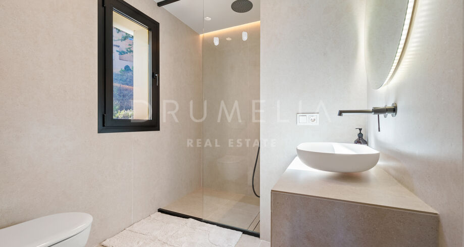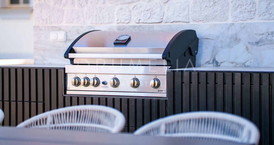 De woning beschikt over drie ruime slaapkamers, allen met en-suite badkamers, evenals een gastentoilet. Het interieur valt op door de hoogwaardige afwerking, waaronder eikenhouten visgraatvloeren, drievoudig beglaasde ramen met UV-bescherming en dubbele beglazing, wat comfort en energie-efficiëntie garandeert. De open leefruimte staat in directe verbinding met een royaal privéterras met indrukwekkend uitzicht op zee en de bergen. Deze buitenruimte is voorzien van een buitenkeuken en barbecuezone, ideaal voor zowel ontspanning als entertainment, aangevuld met zorgvuldig geselecteerde hoogwaardige beplanting.