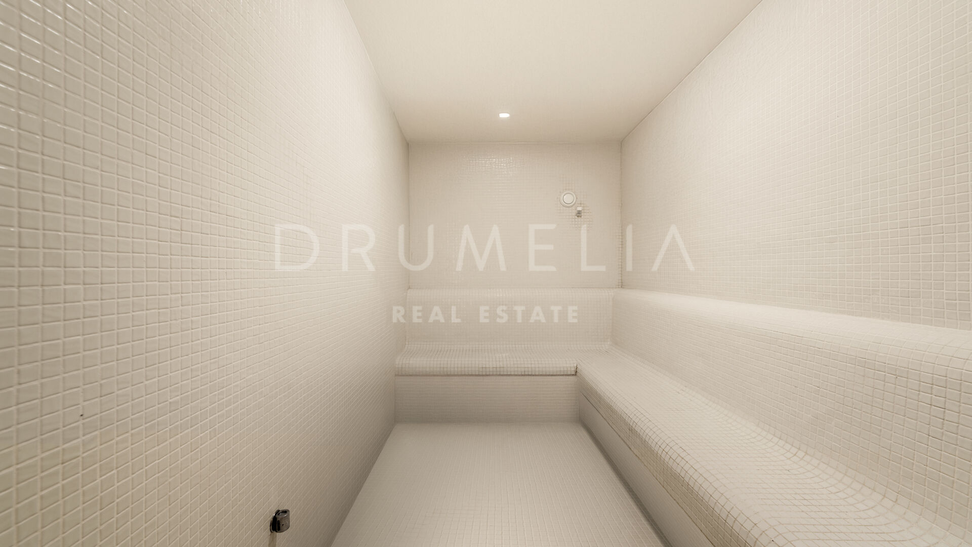 De interieurs, prachtig ontworpen door Eric Kuster, tonen luxe details zoals Loro Piana-stoffen en gordijnen, die een gevoel van verfijning en comfort uitstralen. Het appartement beschikt over marmeren vloeren in de hele woning, die doorlopen tot het ruime terras, wat de verfijnde ambiance versterkt. Met drie royale slaapkamers, elk met een eigen en-suite badkamer, biedt deze woning zowel privacy als comfort. Daarnaast voegt een apart gastentoilet extra functionaliteit toe, wat zorgt voor een perfecte balans tussen persoonlijk comfort en gemeenschappelijk wonen.