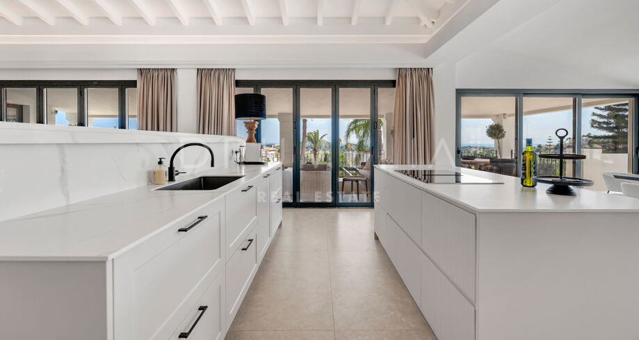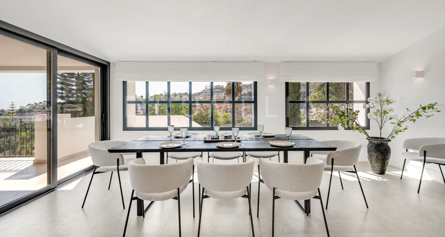 Open uitzichten strekken zich uit over de golfbaan richting de Middellandse Zee, Gibraltar en de Afrikaanse kust. Deze vergezichten zijn te bewonderen vanaf een ruim overdekt terras dat het interieur met de buitenruimtes verbindt en een vloeiende binnen-buitenleving creëert.