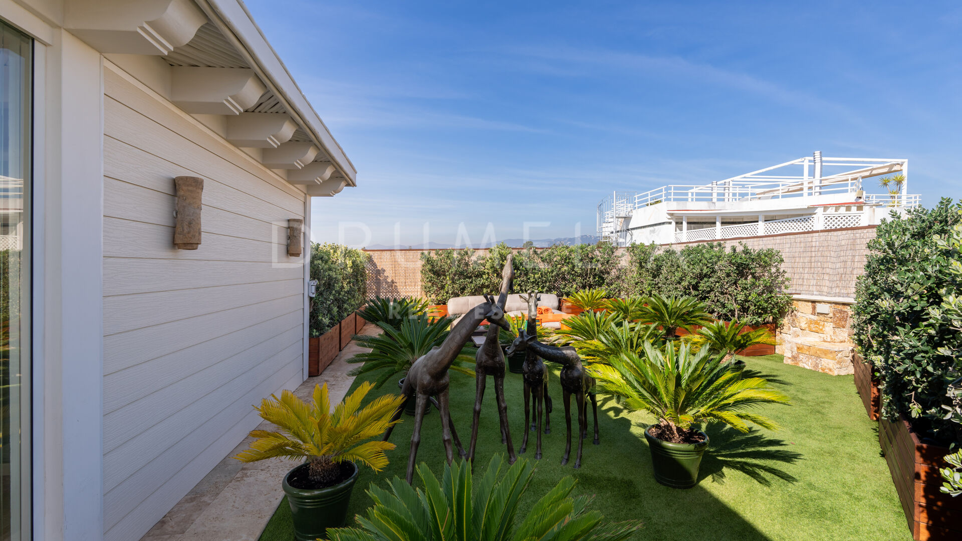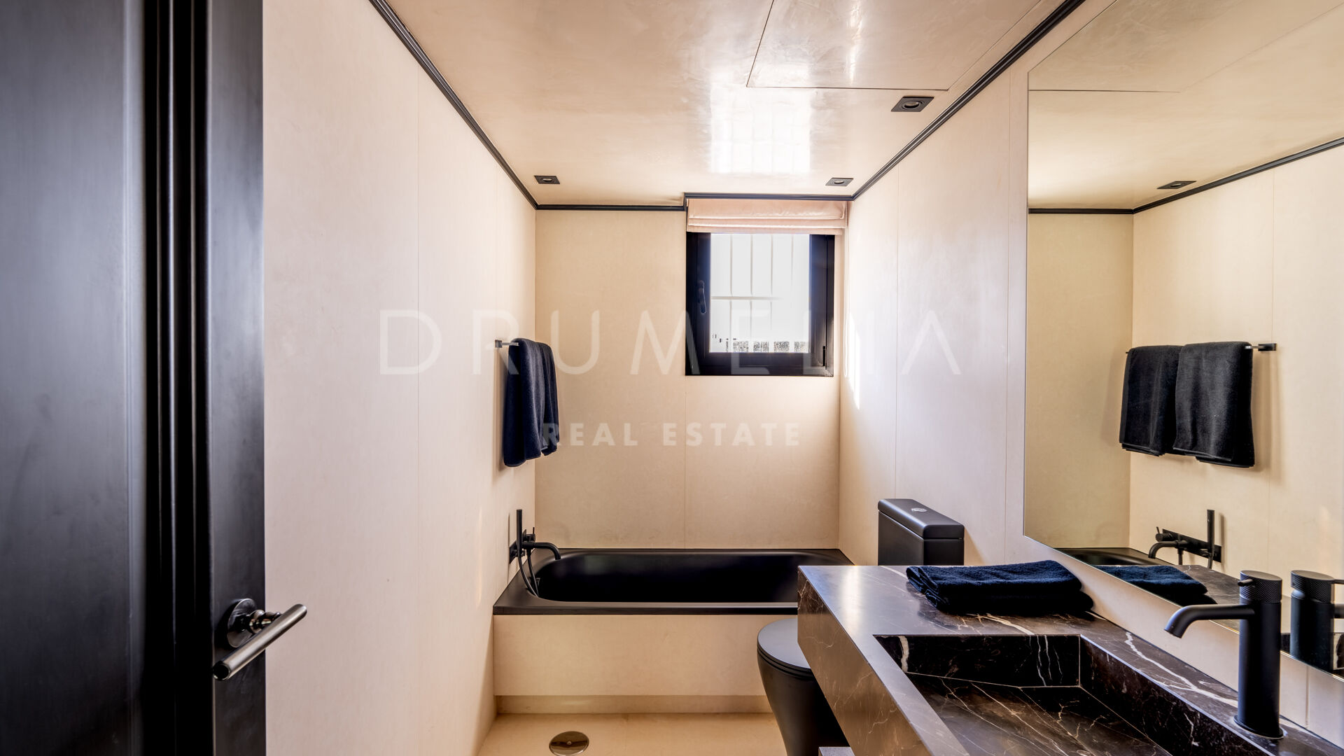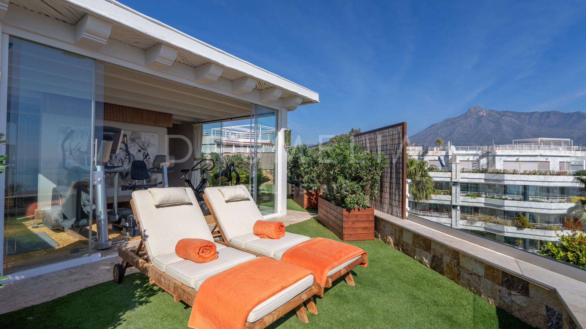 El ático cuenta con una cocina totalmente equipada con lavadero independiente, un salón-comedor que conduce a una increíble terraza adornada con una pérgola y exuberantes plantas, ideal para empaparse del estilo de vida mediterráneo y disfrutar de las impresionantes vistas al mar. Incluye tres dormitorios bien equipados con baños en-suite, y un amplio solarium diseñado como un jardín privado, que cuenta con un gimnasio privado con sauna y hammam. Esta propiedad tiene uso exclusivo de ático y bungalow de fitness 202m2 más solarium 227m2.