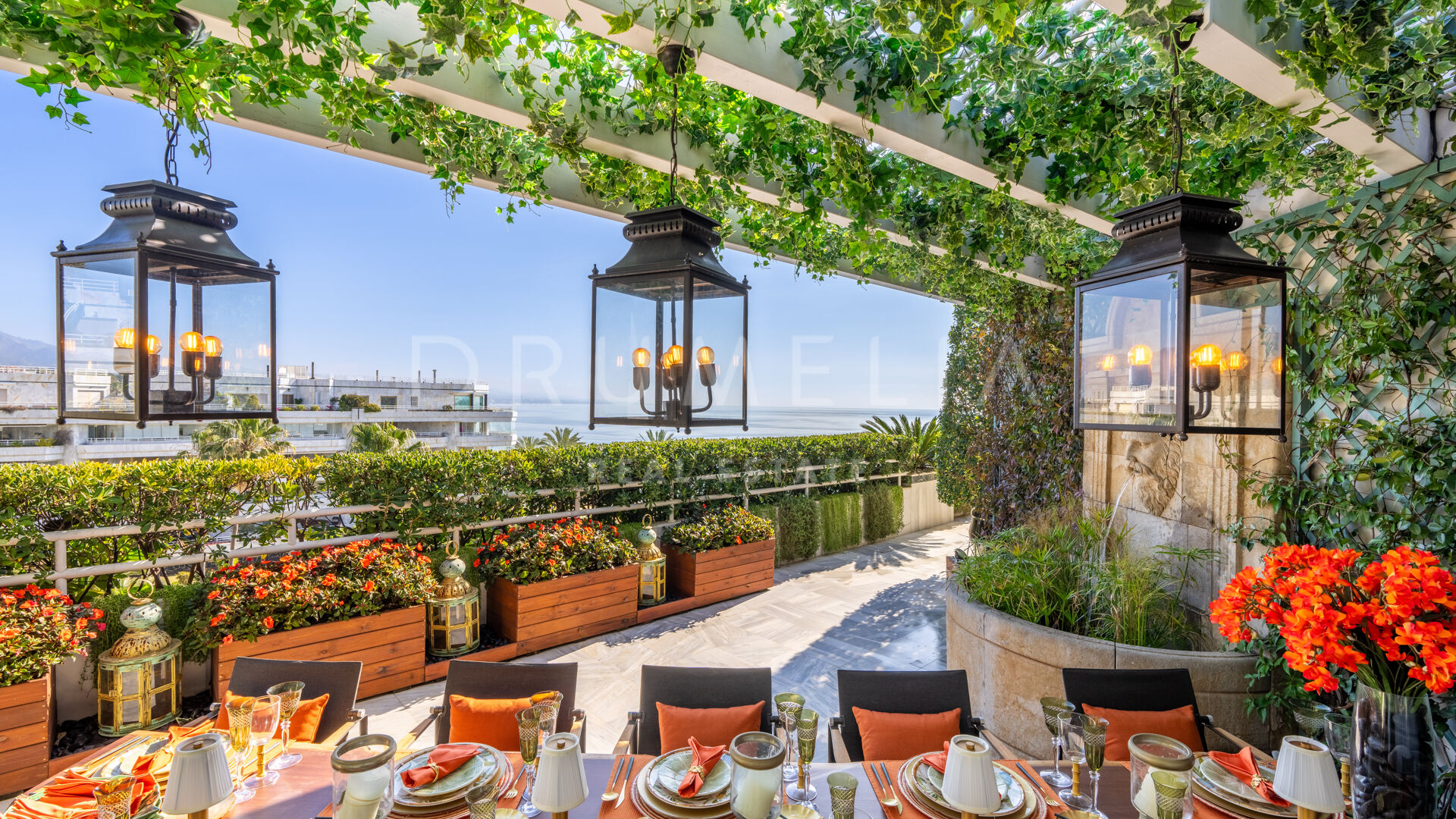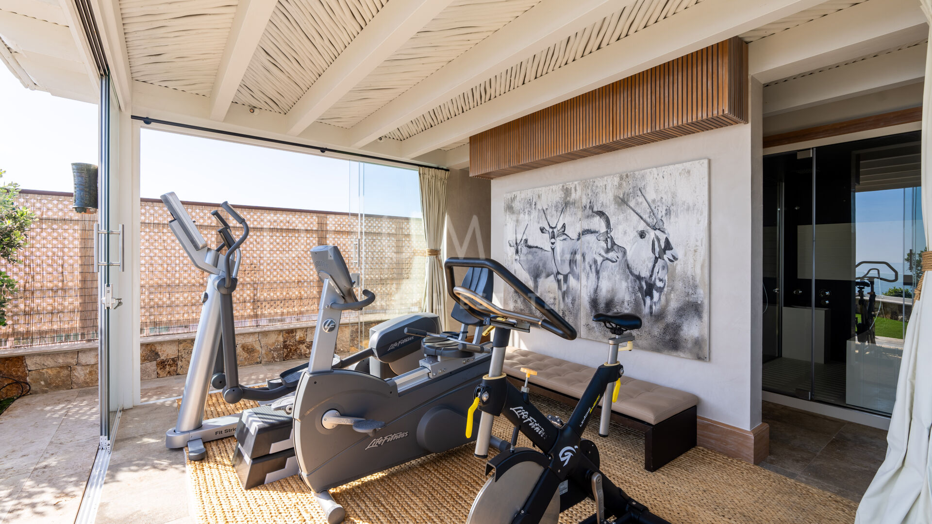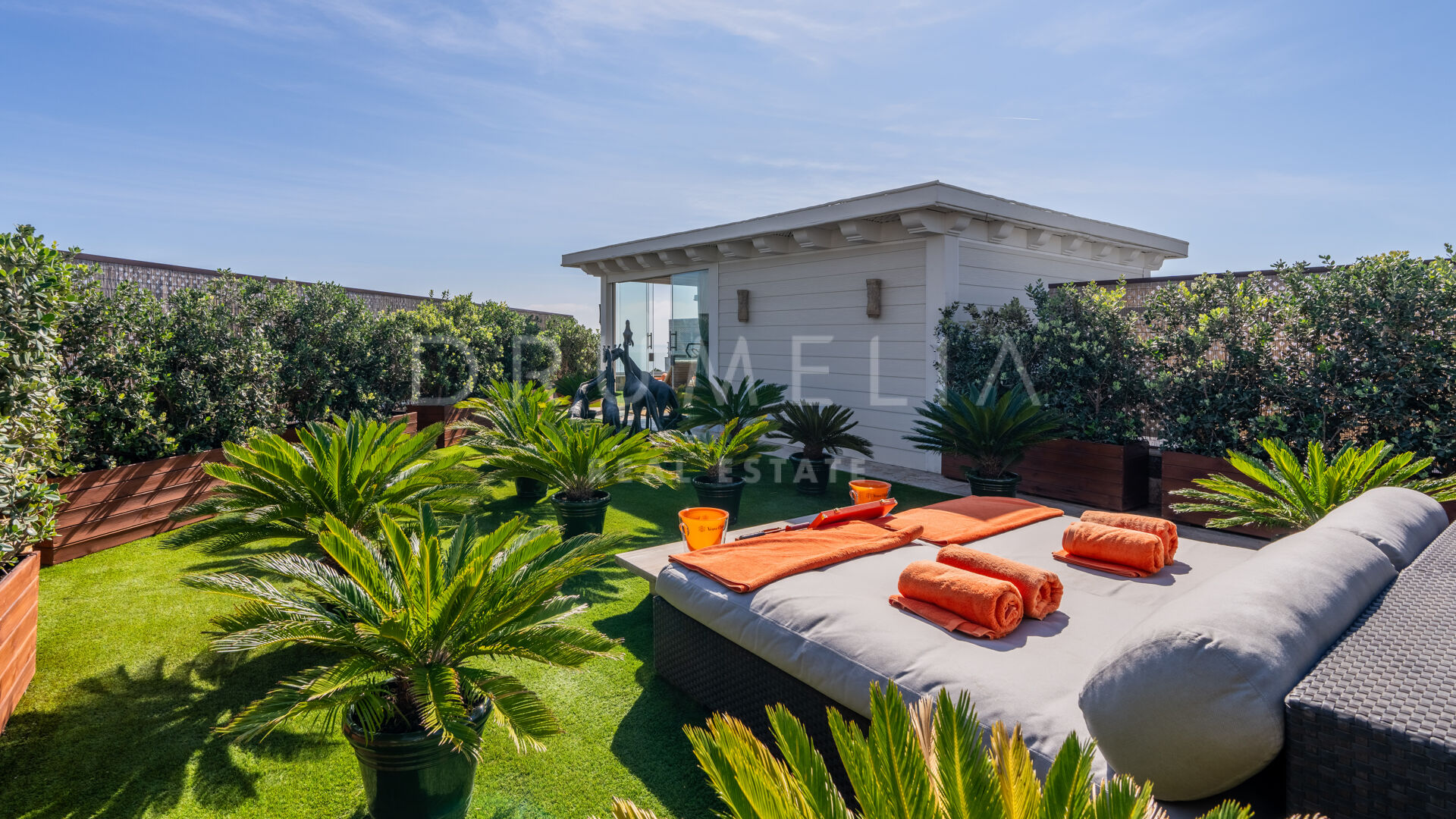 El ático cuenta con una cocina totalmente equipada con lavadero independiente, un salón-comedor que conduce a una increíble terraza adornada con una pérgola y exuberantes plantas, ideal para empaparse del estilo de vida mediterráneo y disfrutar de las impresionantes vistas al mar. Incluye tres dormitorios bien equipados con baños en-suite, y un amplio solarium diseñado como un jardín privado, que cuenta con un gimnasio privado con sauna y hammam. Esta propiedad tiene uso exclusivo de ático y bungalow de fitness 202m2 más solarium 227m2.