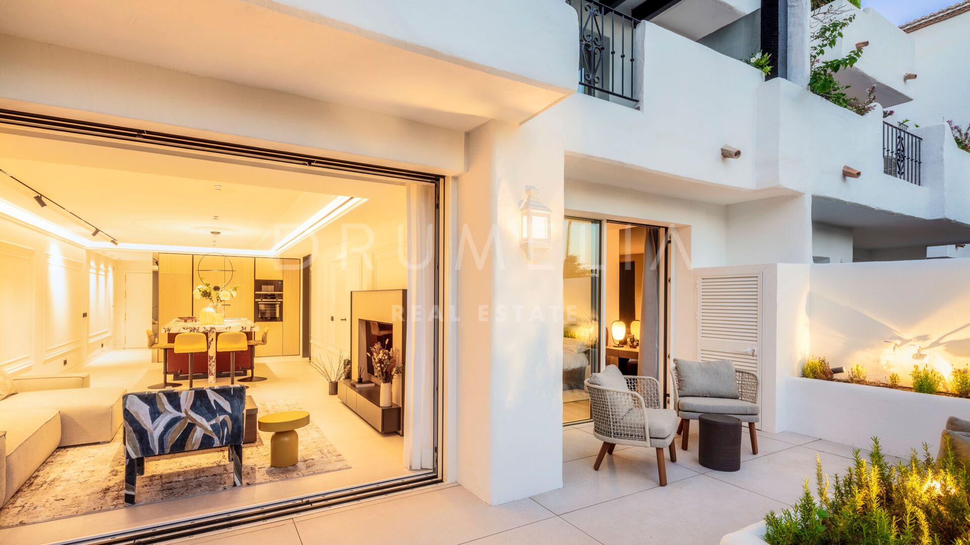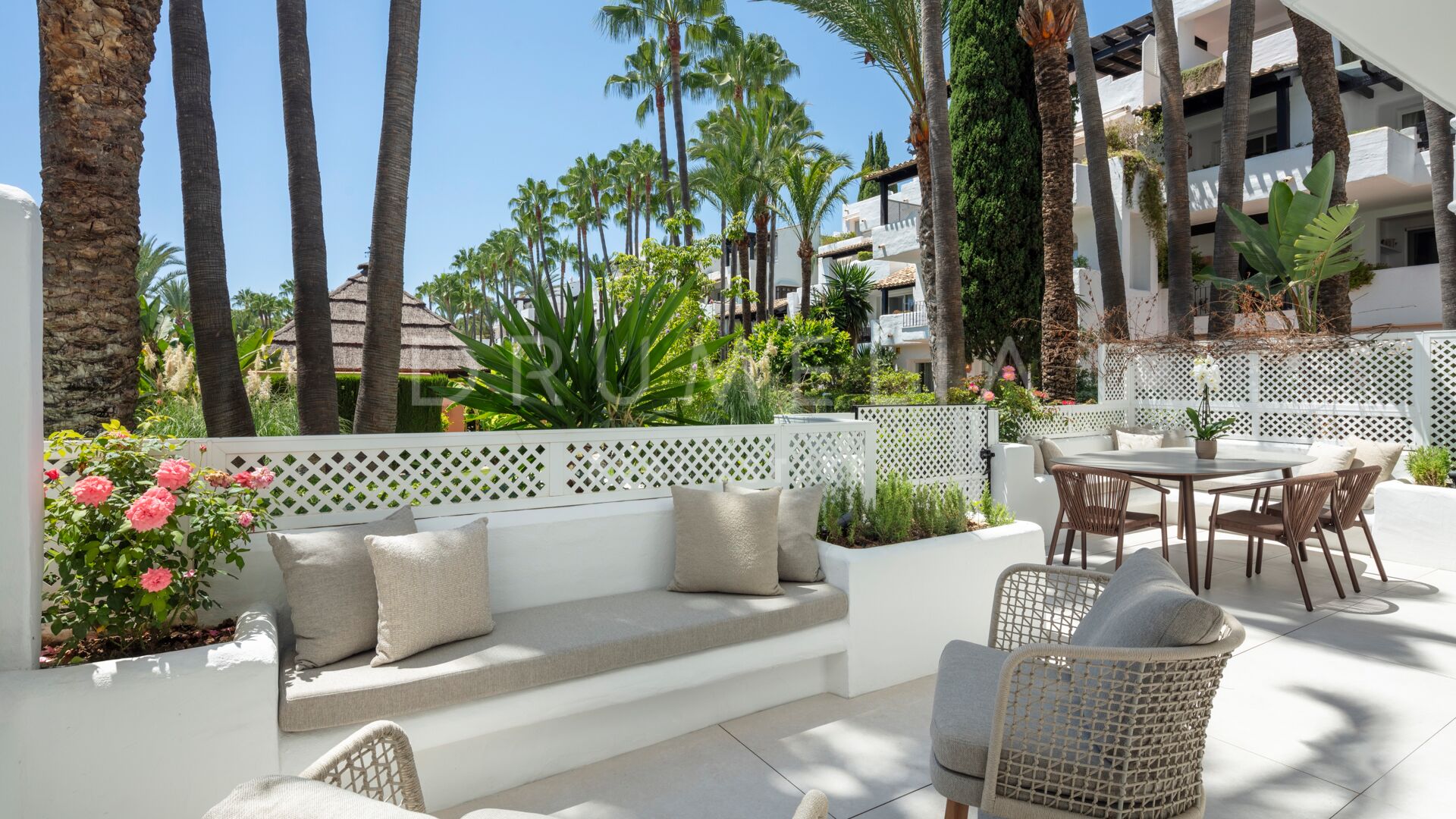 Een prachtig recent gerenoveerd 3-slaapkamer appartement te koop op de begane grond op een toplocatie in het Puente Romano Resort aan Marbella’s Golden Mile. Gelegen in de betoverende weelderige tuinen met een groot zwembad en chiringuito, is het de belichaming van luxe resort-stijl wonen. Met de legendarische La Concha berg als achtergrond en de Middellandse Zee op een steenworp afstand, biedt het gemakkelijke toegang tot de beroemde Golden Mile met al zijn luxe voorzieningen en Blauwe Vlag stranden, zodat bewoners zich kunnen onderdompelen in het beste wat Marbella te bieden heeft. Het bruisende centrum van Marbella, de oude binnenstad en het schitterende Puerto Banus liggen op slechts enkele minuten van deze chique en luxueuze wijk aan de Costa del Sol.