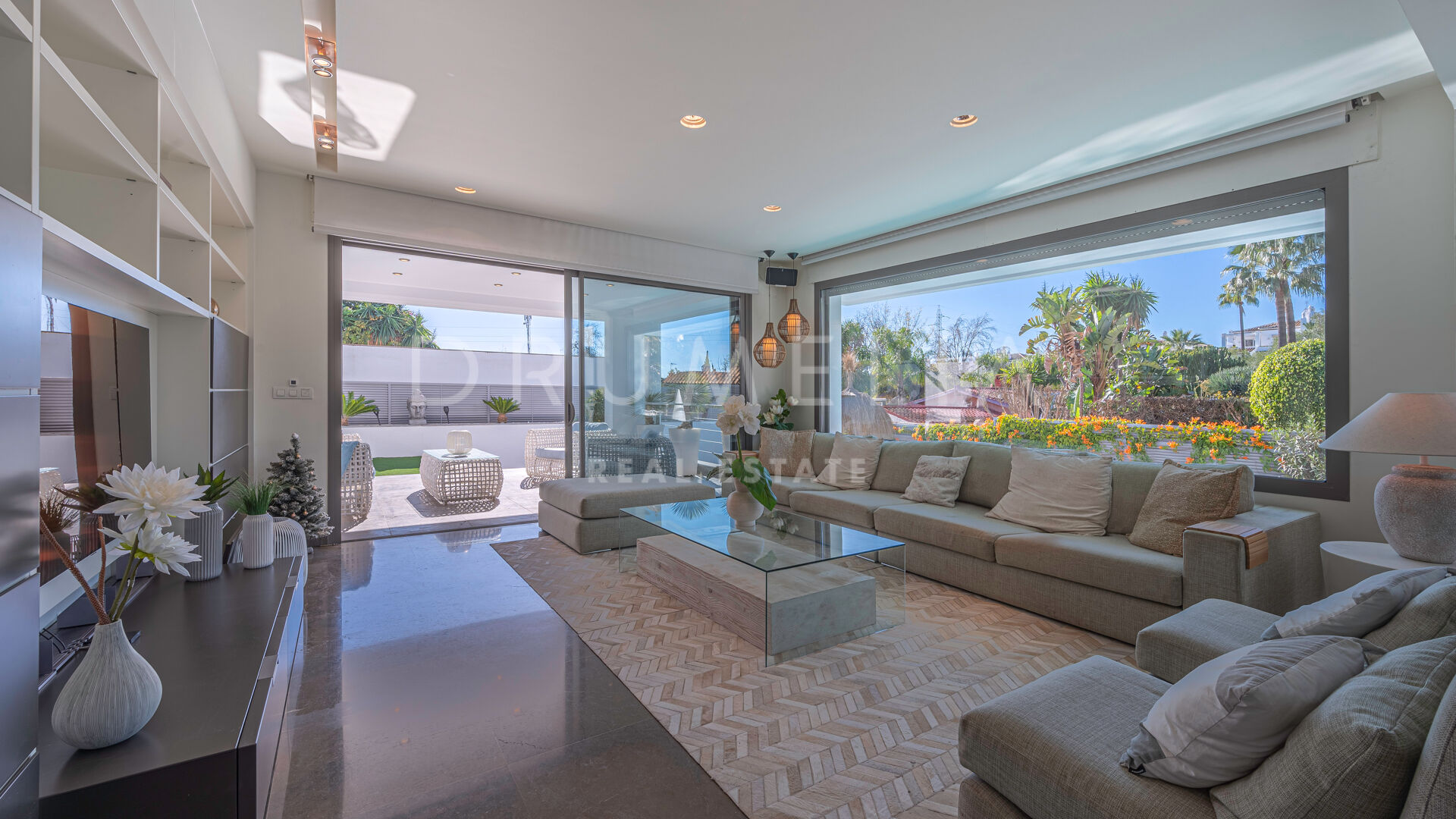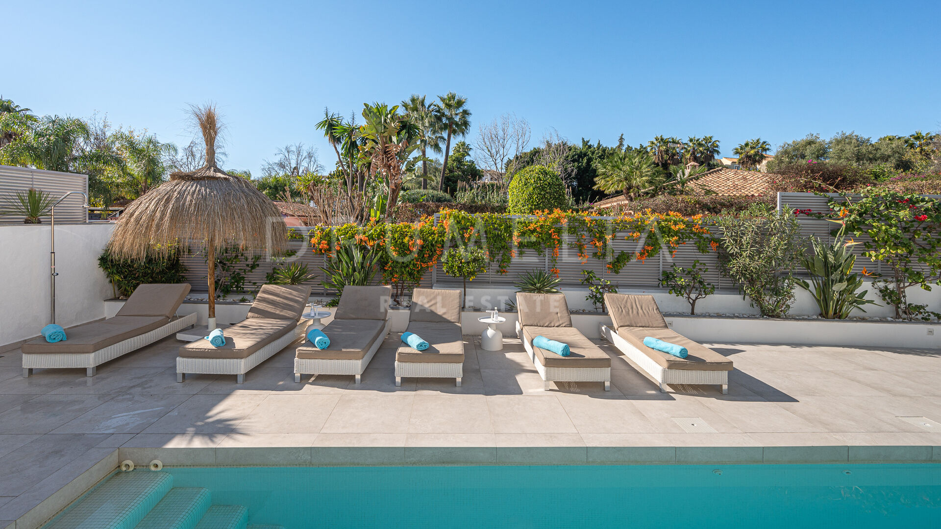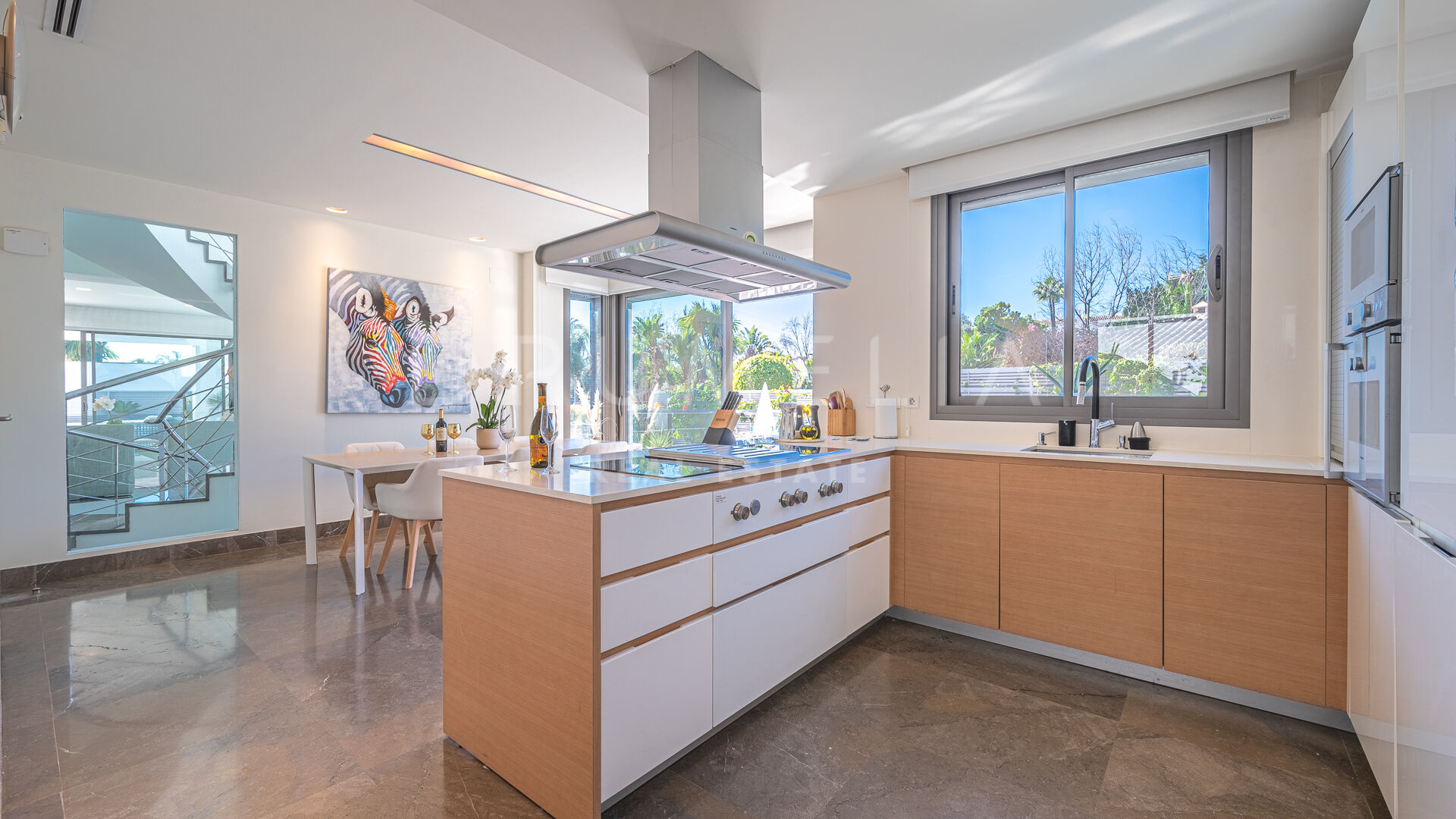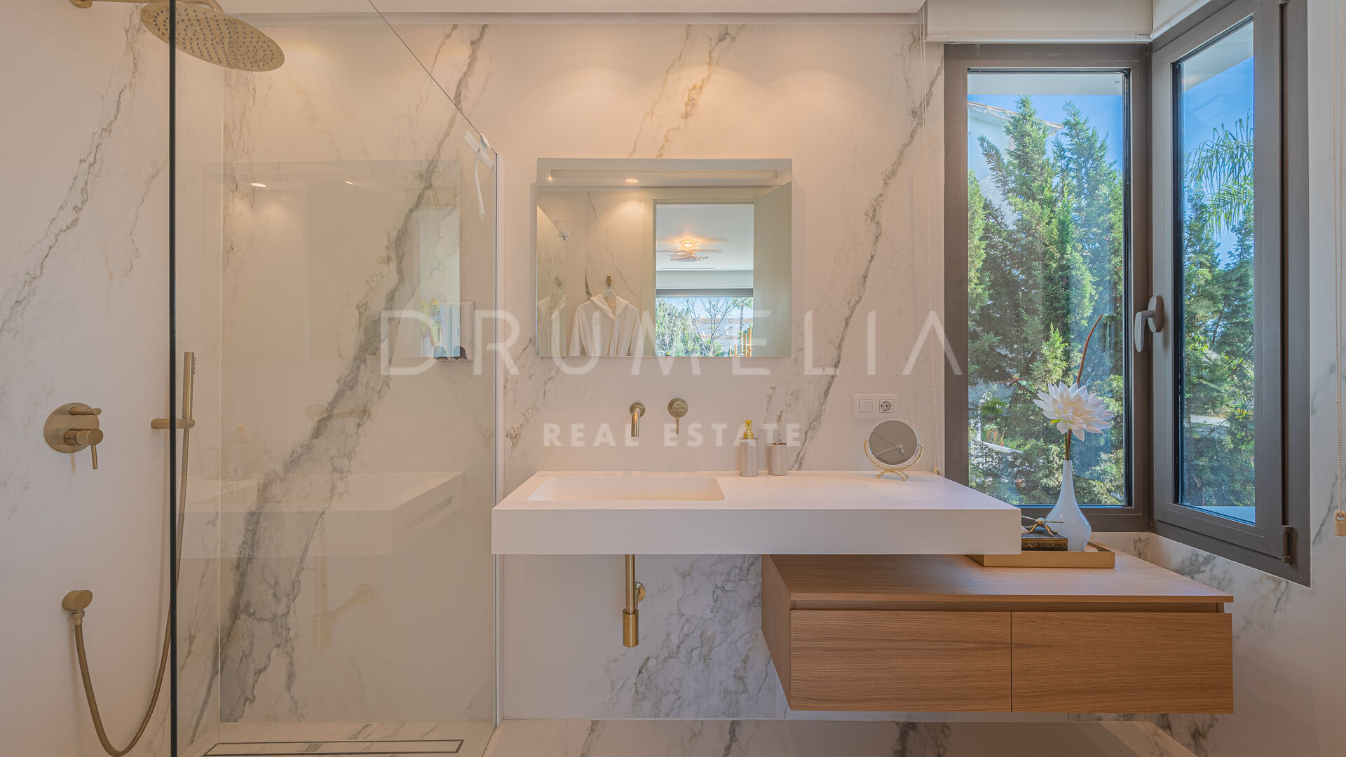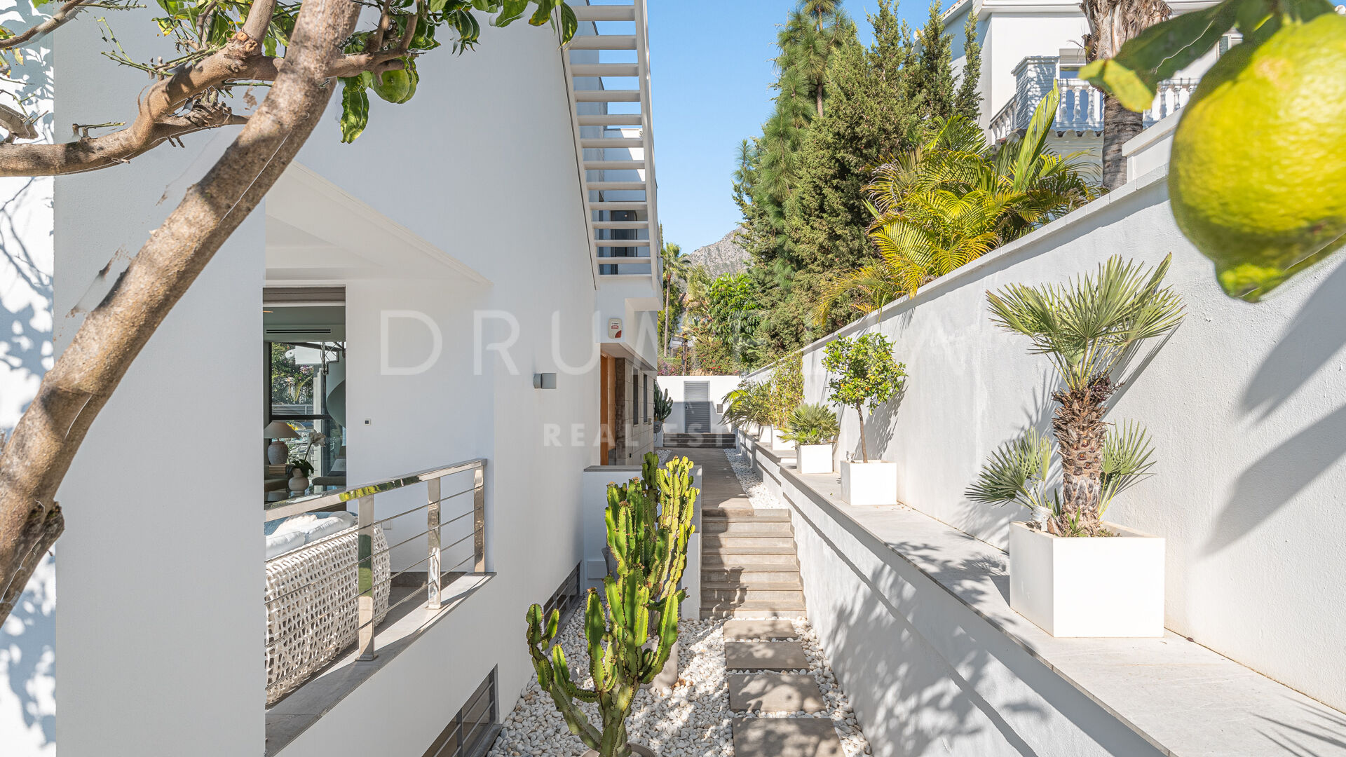 Dit prachtige eigentijdse huis te koop is gelegen aan de wereldberoemde Golden Mile van Marbella in Marbella Montaña, Nagüeles, een gevestigde en prestigieuze wijk. De legendarische Marbella Club en Puente Romano resorts, Nobu Hotel Marbella, een trendy bestemming voor entertainment, eten en verwennerij, alle voorzieningen van de Golden Mile, die de belichaming is van luxe, extravagantie en weelde, liggen voor de deur. Je woont dicht bij luxe vrijetijds- en genotsvoorzieningen, zandstranden, designerboetieks, verzorgde golfbanen, tennisbanen, nachtclubs, de beste restaurants met internationale of traditionele keuken, met Michelin-sterren bekroonde etablissementen, sfeervolle cafés, SPA’s, internationale scholen, enz. Het oude centrum van Marbella, het glamoureuze Puerto Banús en de Golfvallei van Nueva Andalucia liggen op slechts enkele minuten afstand.