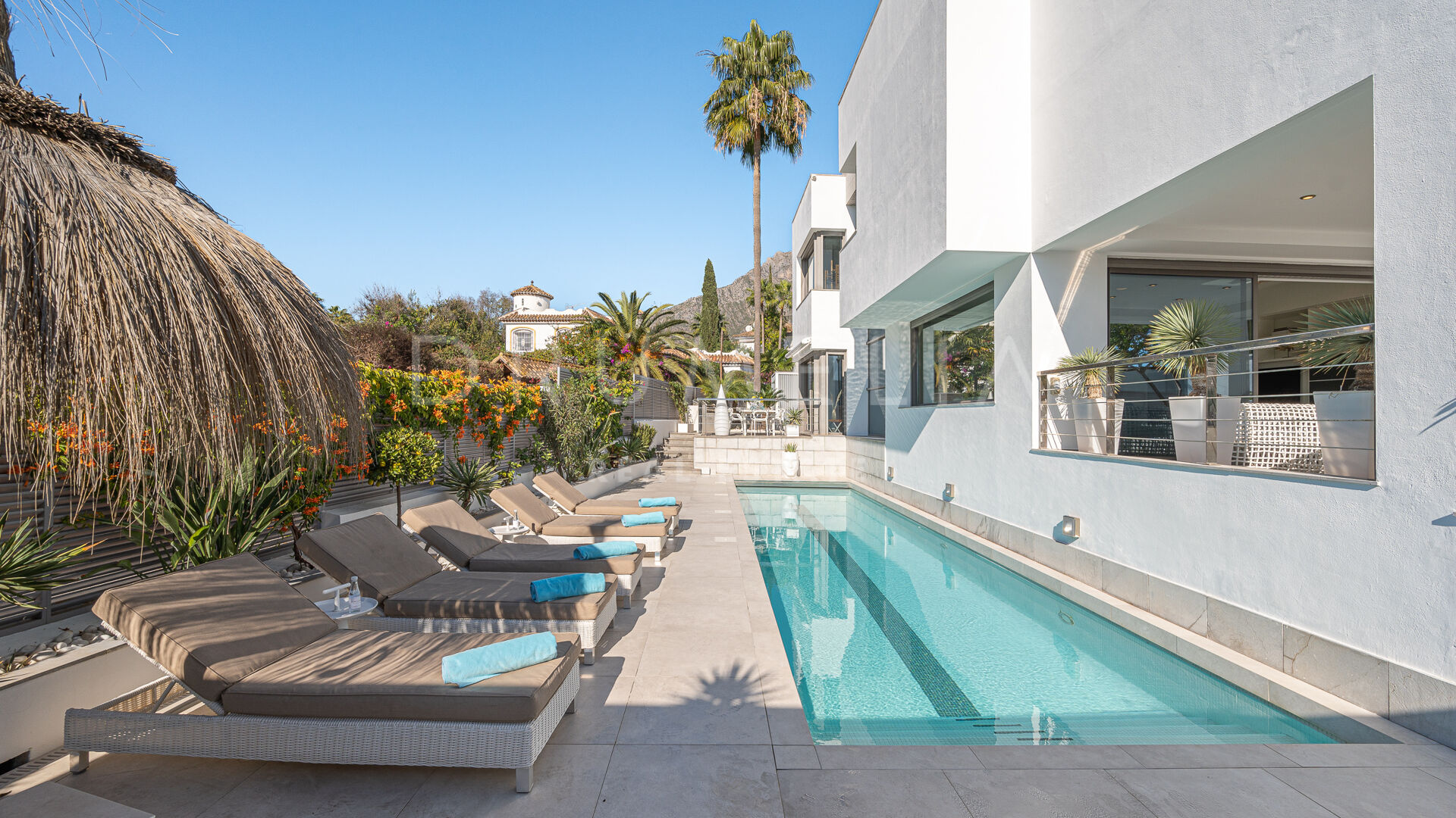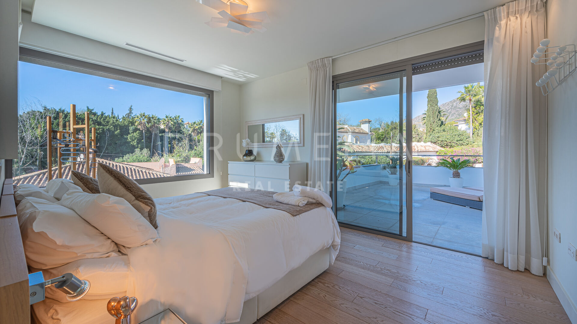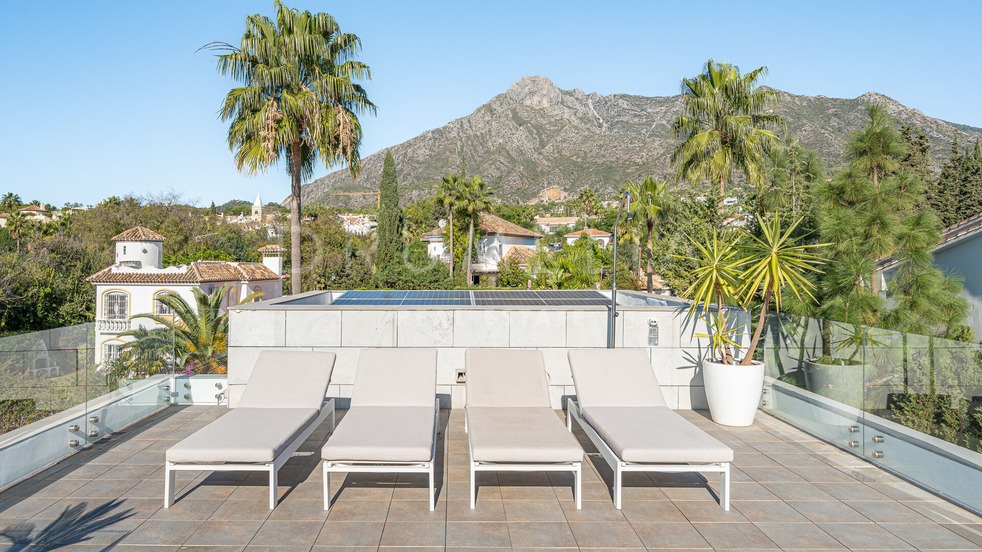 De opmerkelijke moderne villa met 4 slaapkamers combineert luxe en comfort met een schilderachtige omgeving en een achtergrond van de berg La Concha, het iconische symbool van Marbella. Gelegen op een schilderachtig perceel van 530 m², biedt het op het zuiden/westen gerichte huis van 320 m² prachtig uitzicht op de schilderachtige omgeving, de vredige bergen en de zee (gedeeltelijk). Omringd door soortgelijke huizen van hoge kwaliteit aan de Golden Mile van Marbella en gebouwd volgens de beste normen, heeft het 3 verdiepingen en een dakterras/solarium. Het hoofdniveau bestaat uit een lichte en ruime woonkamer met panoramische glazen deuren die direct leiden naar de overdekte patio en het verwarmde zoutwaterzwembad met ligstoelen; een gastentoilet; een volledig ingerichte strakke minimalistische keuken met eiland en ontbijtruimte, die in verbinding staat met een eetkamer en een al fresco eetterras en BBQ patio.