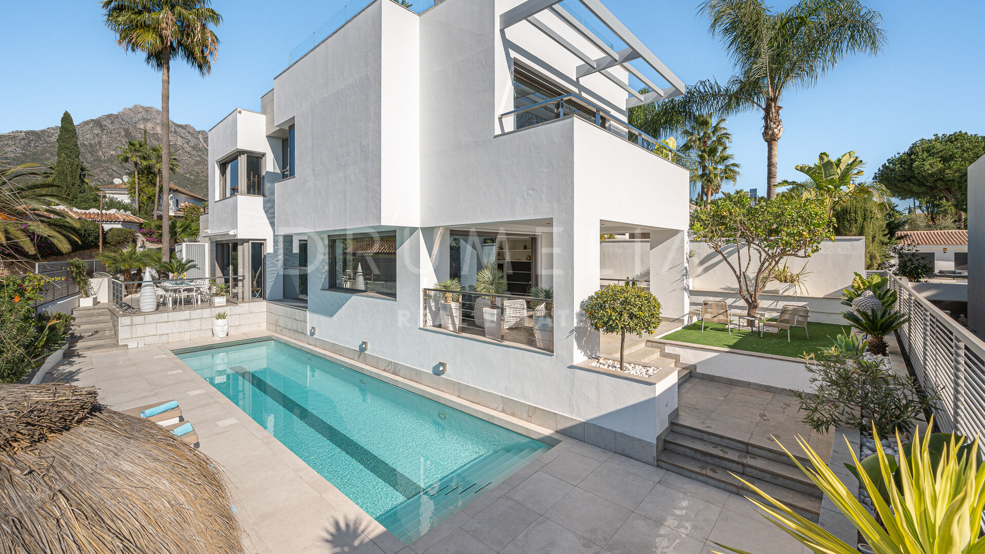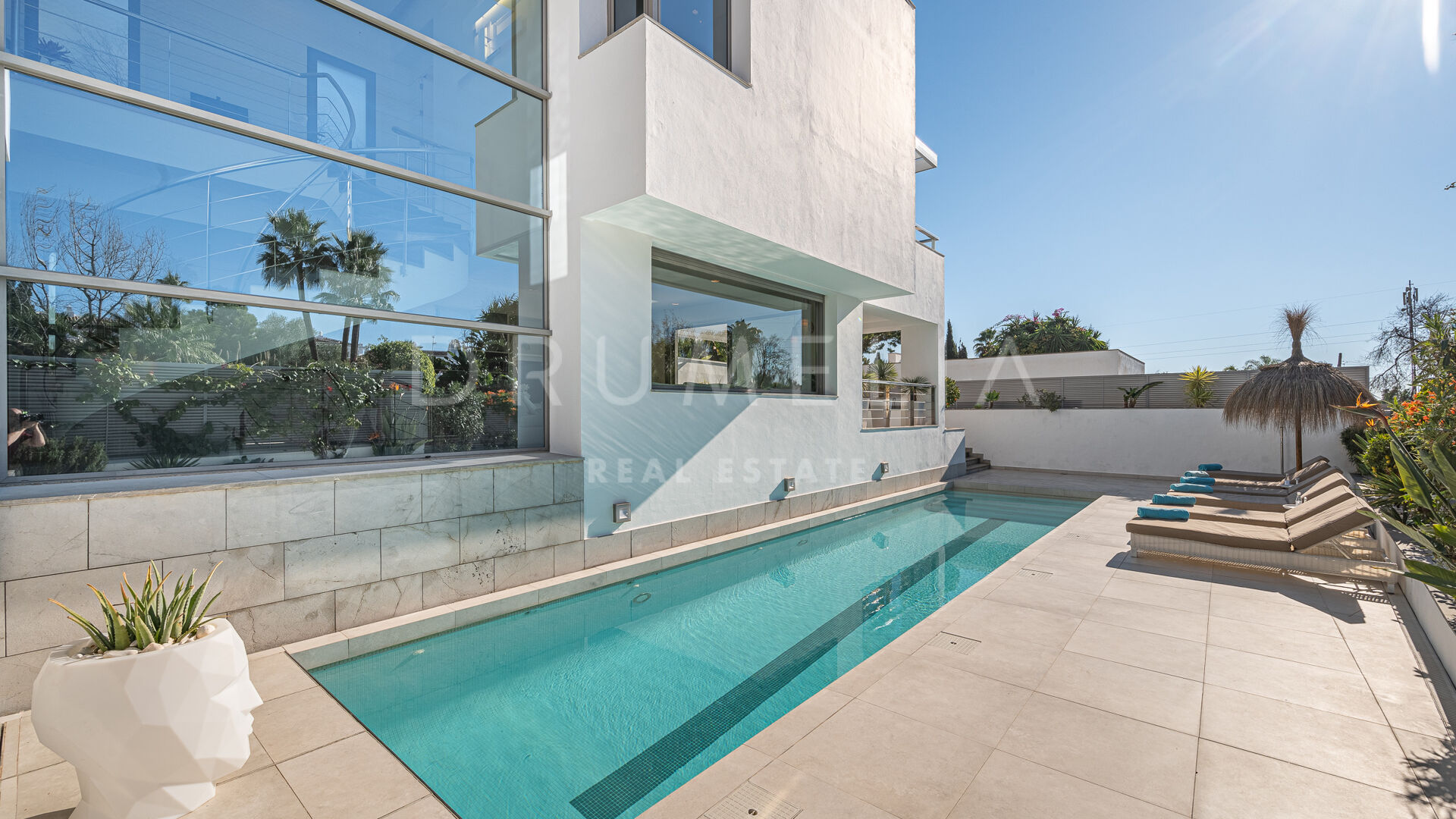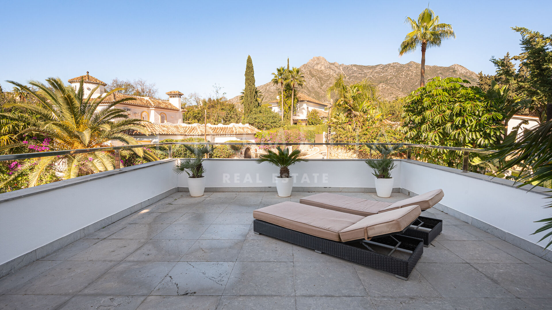 De opmerkelijke moderne villa met 4 slaapkamers combineert luxe en comfort met een schilderachtige omgeving en een achtergrond van de berg La Concha, het iconische symbool van Marbella. Gelegen op een schilderachtig perceel van 530 m², biedt het op het zuiden/westen gerichte huis van 320 m² prachtig uitzicht op de schilderachtige omgeving, de vredige bergen en de zee (gedeeltelijk). Omringd door soortgelijke huizen van hoge kwaliteit aan de Golden Mile van Marbella en gebouwd volgens de beste normen, heeft het 3 verdiepingen en een dakterras/solarium. Het hoofdniveau bestaat uit een lichte en ruime woonkamer met panoramische glazen deuren die direct leiden naar de overdekte patio en het verwarmde zoutwaterzwembad met ligstoelen; een gastentoilet; een volledig ingerichte strakke minimalistische keuken met eiland en ontbijtruimte, die in verbinding staat met een eetkamer en een al fresco eetterras en BBQ patio.