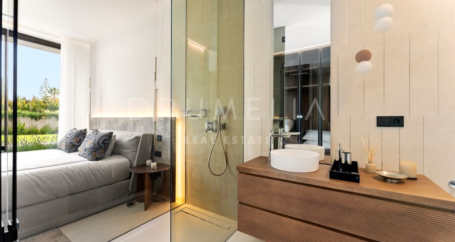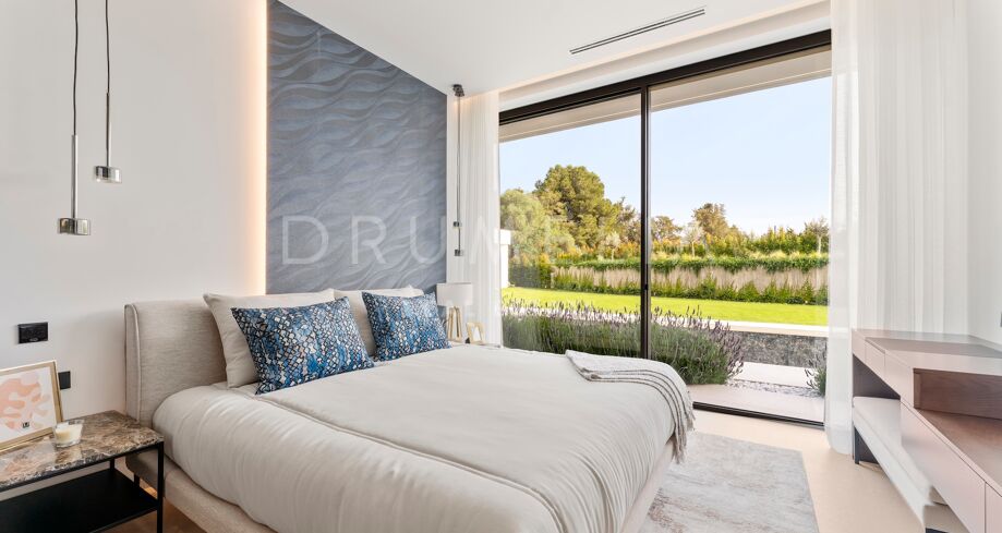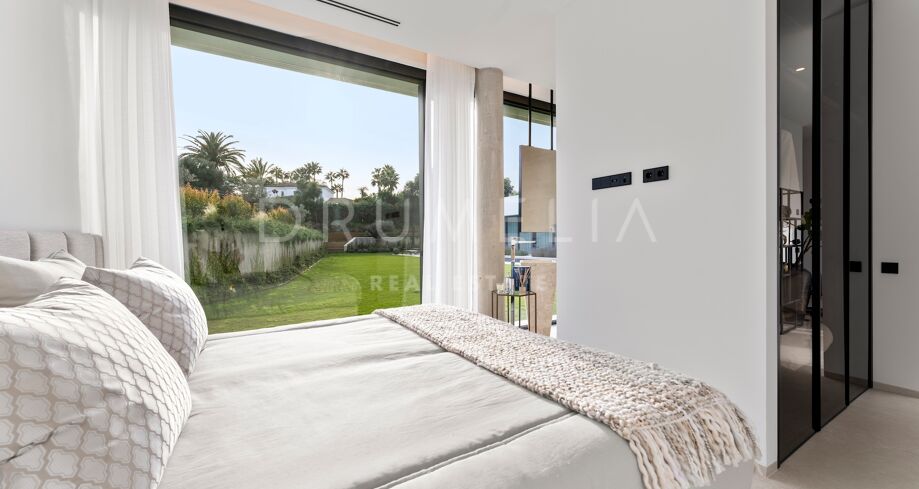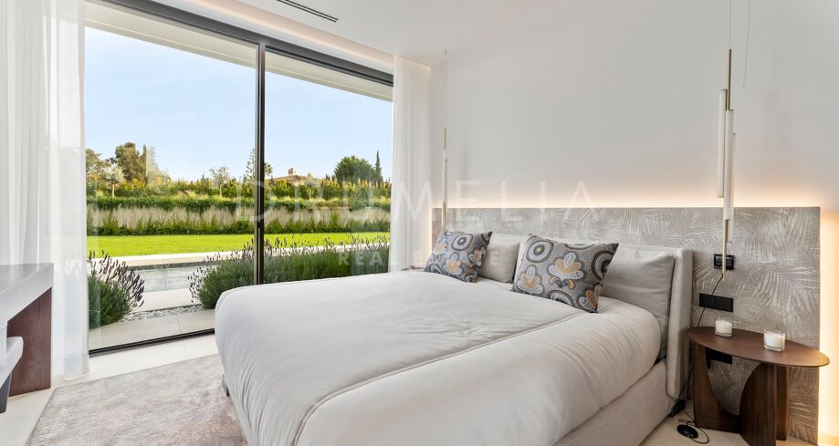 De villa beschikt over elegant ingerichte slaapkamers, elk ontworpen als een eigen toevluchtsoord, met grote ramen van vloer tot plafond die een schilderachtig uitzicht op de tuin bieden. De master suite, een waar heiligdom, beschikt over een luxe en-suite badkamer, op maat ontworpen inloopkast en een eigen toegang tot de tuin en het zwembad.
