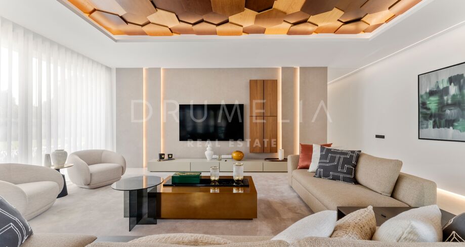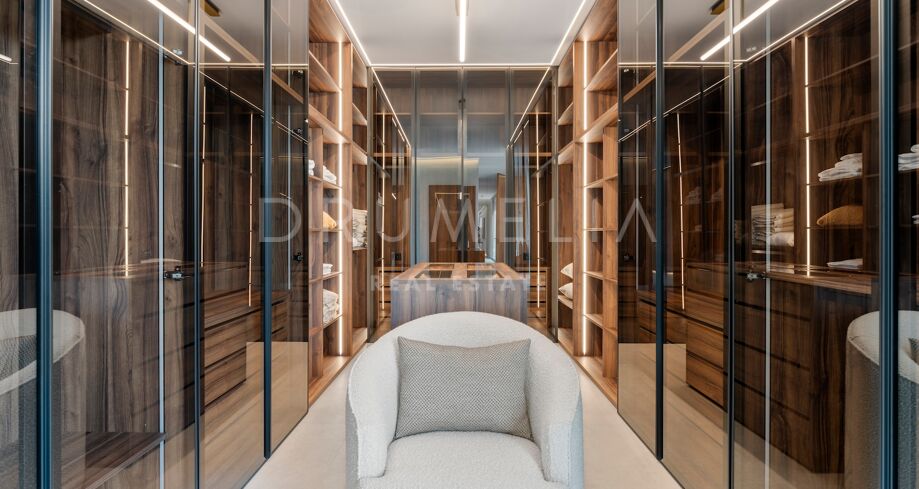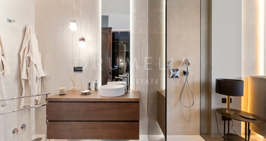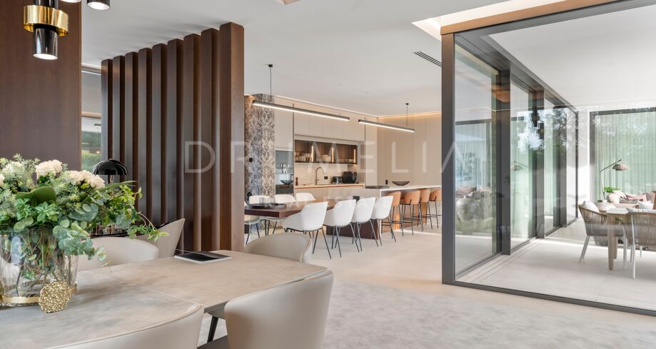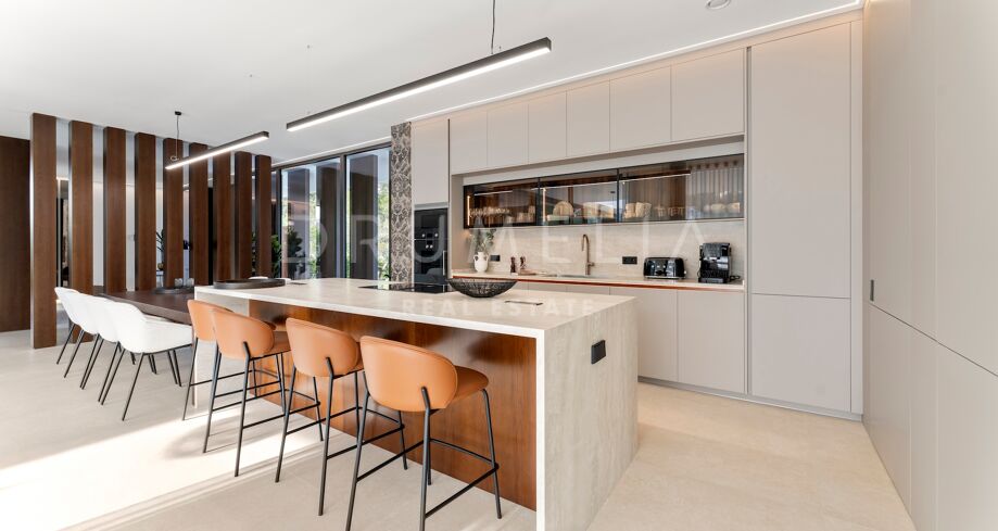 Bij binnenkomst word je begroet door een uitgestrekte woonkamer, doordacht ontworpen met hoge plafonds, strakke afwerking en warme texturen die het gevoel van ruimte en verfijning versterken. De ultramoderne open keuken, met een centraal eiland en eersteklas apparatuur, vloeit moeiteloos over in de eet- en loungeruimtes, waardoor het perfect is voor zowel intieme familiemomenten als grote sociale bijeenkomsten.