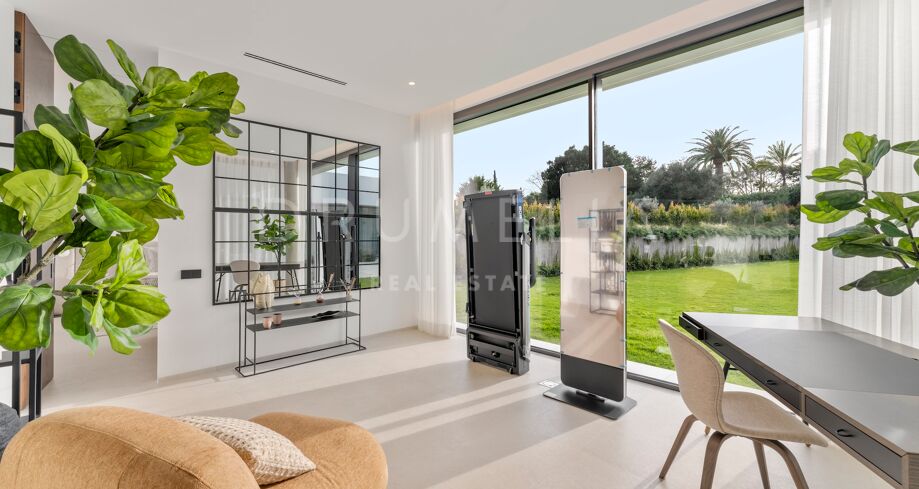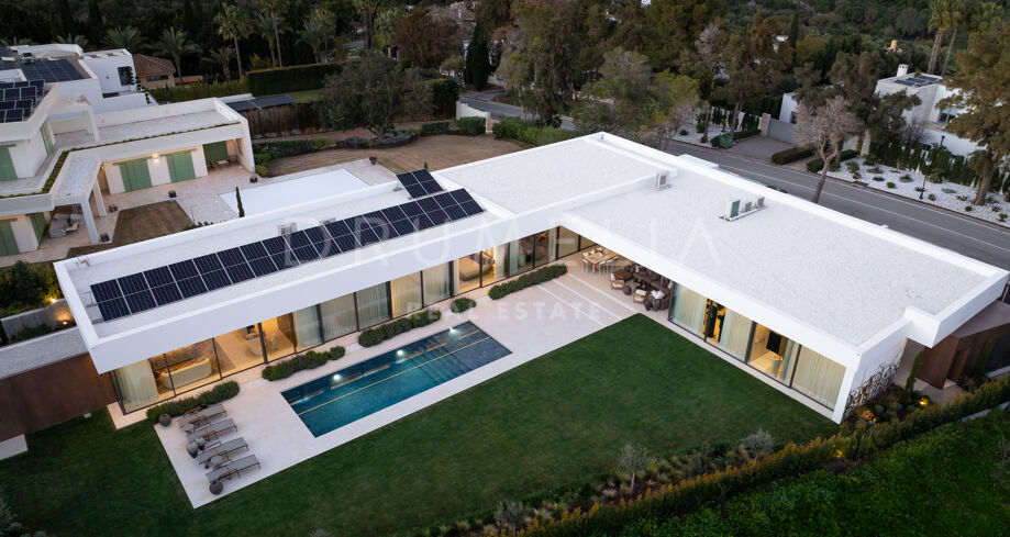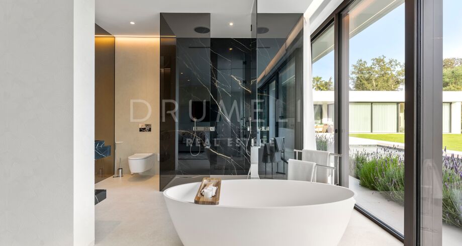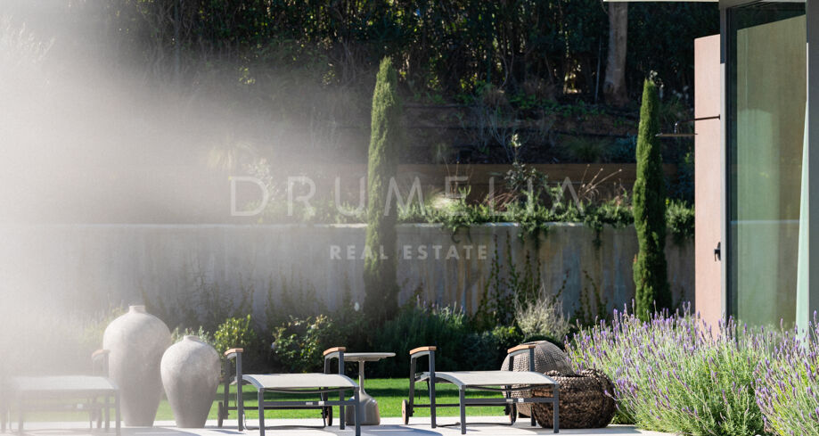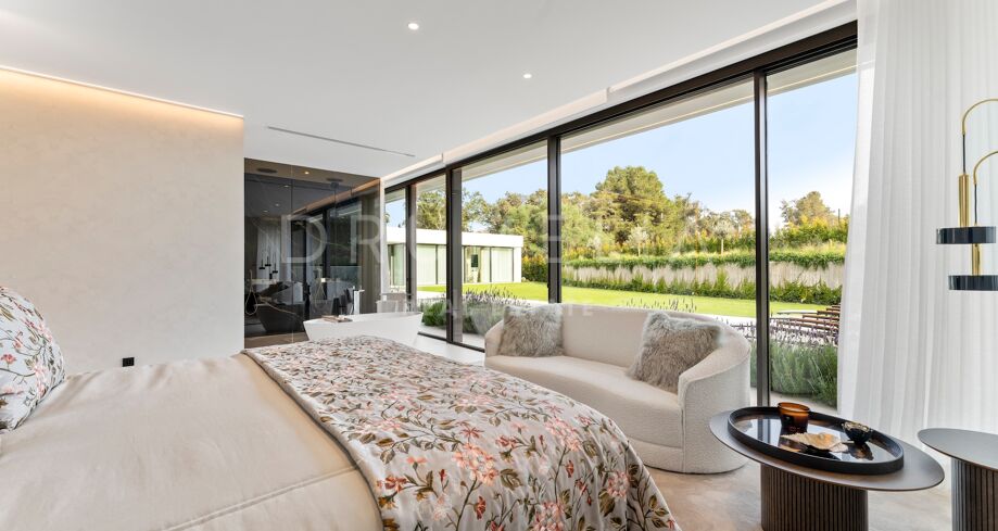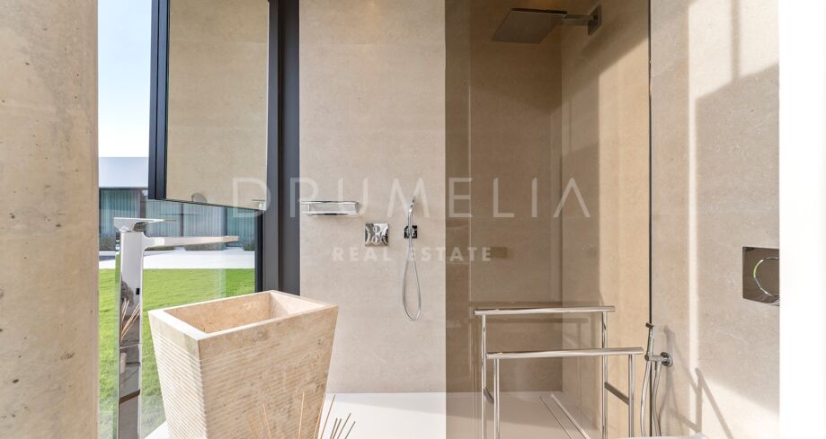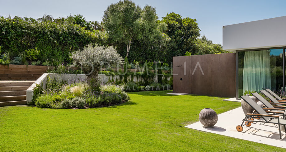 Als je naar buiten stapt, komt de villa echt tot leven met zijn prachtige buitenruimtes. De verzorgde tuinen, versierd met weelderig groen en mediterrane landschapsarchitectuur, bieden een rustige oase van privacy en sereniteit. Het uitnodigende zwembad, omringd door stijlvolle ligstoelen en schaduwrijke loungeplekken, is perfect om te ontspannen onder de warme Andalusische zon. Of je nu geniet van een kopje koffie in de ochtend op het terras, een diner bij zonsondergang bij het zwembad organiseert of tot rust komt in de rustige tuin, dit huis biedt een ongeëvenaarde levensstijl van luxe en ontspanning.