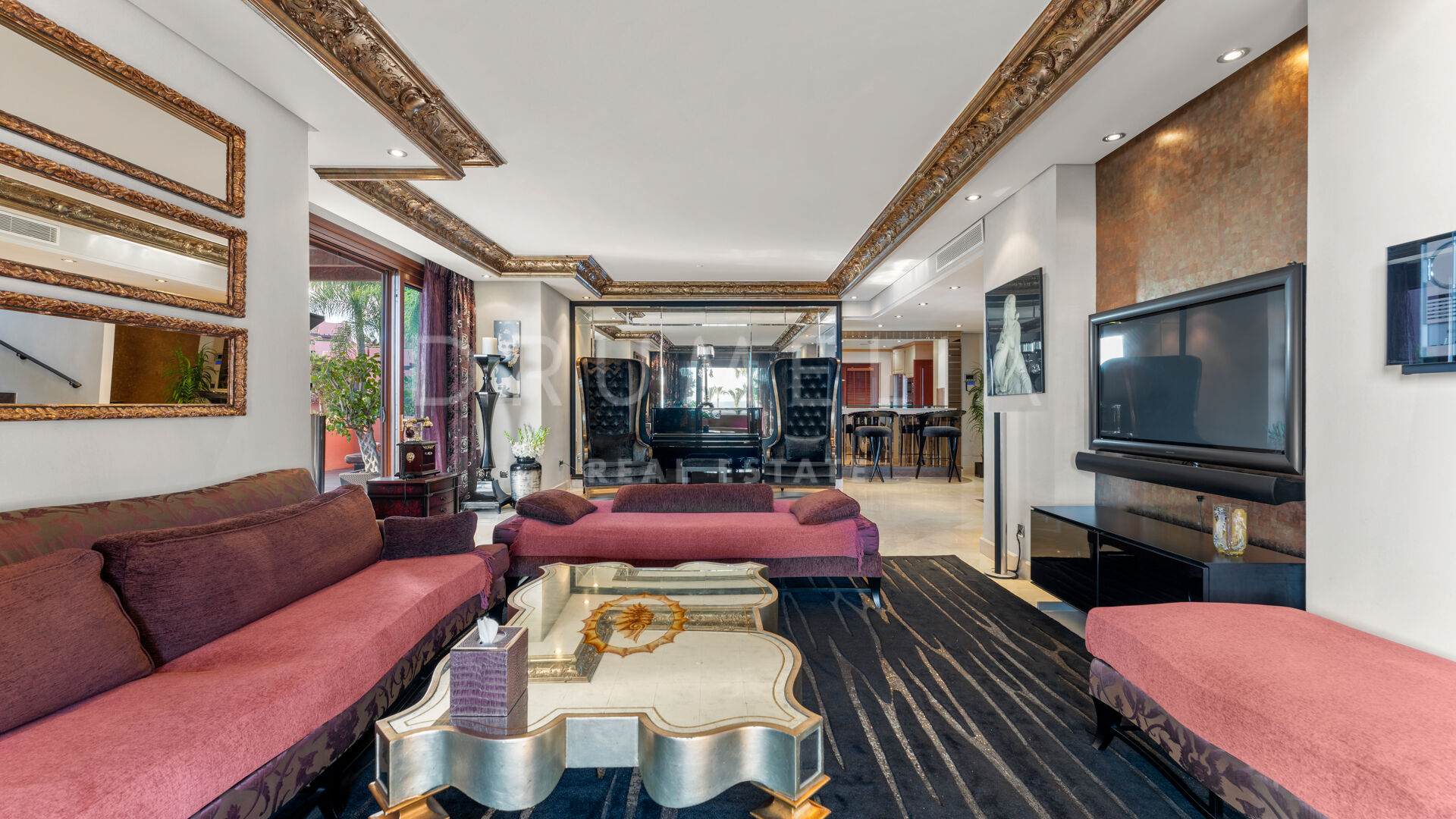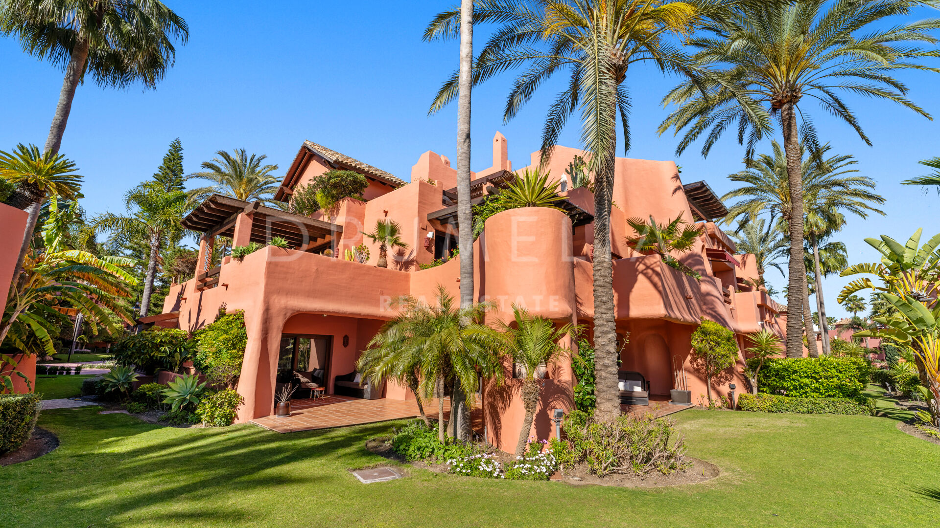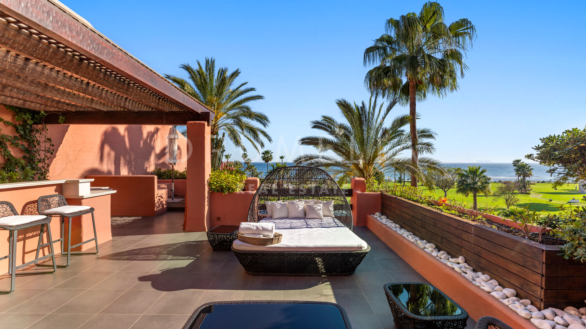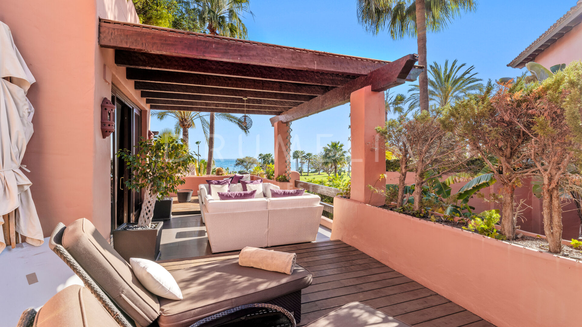 Dit unieke triplex aan het strand ligt in het gewilde wooncomplex Torre Bermeja aan de New Golden Mile van Estepona. Met directe toegang tot het strand en adembenemend uitzicht op zee, biedt het een comfortabele en stijlvolle woonomgeving over drie verdiepingen. De woning beschikt over twee aparte ingangen, twee ruime woonkamers met eethoeken, zes slaapkamers met en-suite badkamers en zes privéterrassen, waaronder een tuingedeelte dat perfect is om buiten te ontspannen. De volledig uitgeruste binnen- en buitenkeukens zijn voorzien van hoogwaardige apparatuur.